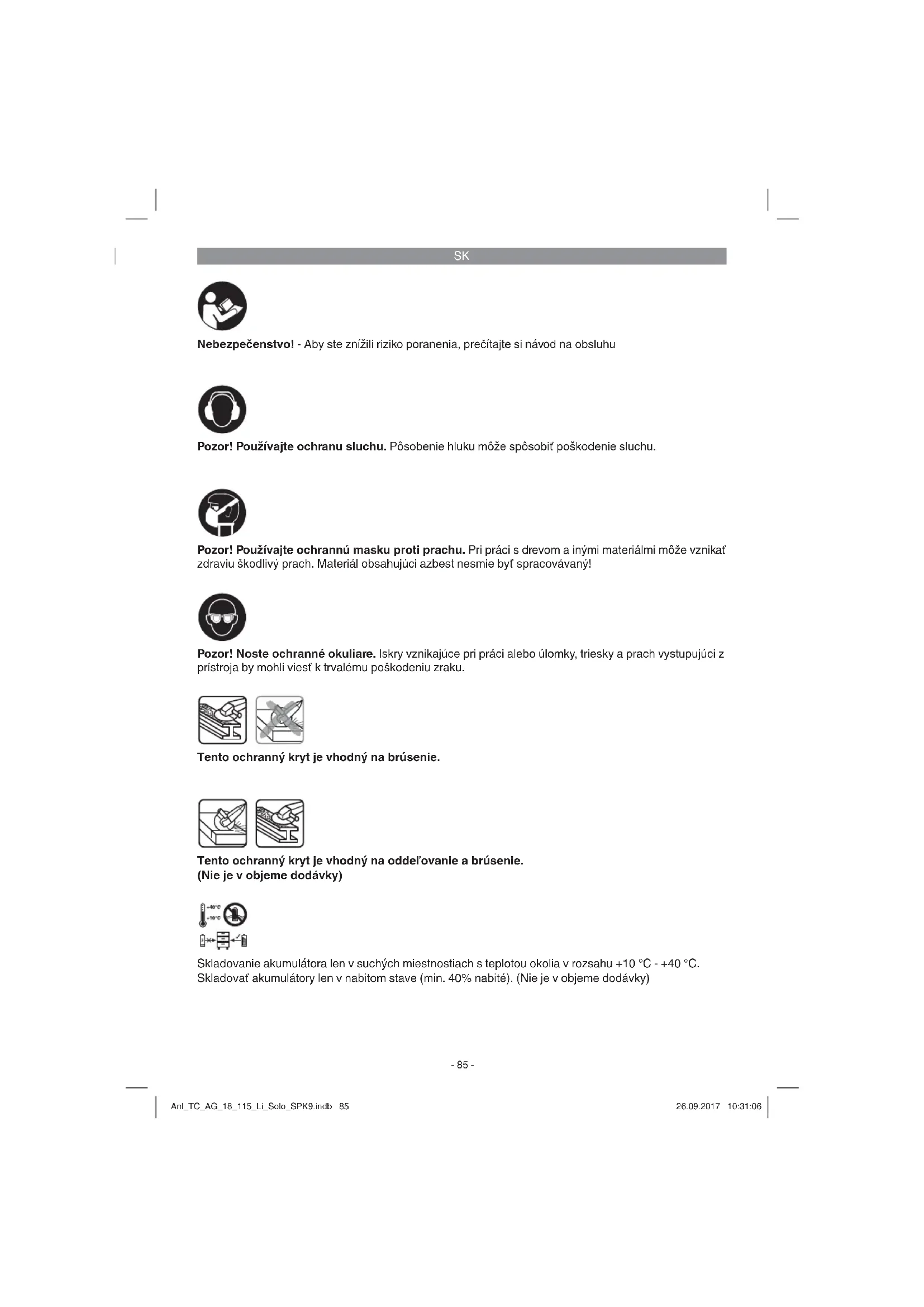 Nebezpečenstvo! - Aby ste znížili riziko poranenia, prečítajte si návod na obsluhu Pozor! Používajte ochranu sluchu. Pôsobenie hluku môže spôsobiť poškodenie sluchu. Pozor! Noste ochranné okuliare. Iskry vznikajúce pri práci alebo úlomky, triesky a prach vystupujúci z prístroja by mohli viesť k trvalému poškodeniu zraku. Pozor! Používajte ochrannú masku proti prachu. Pri práci s drevom a inými materiálmi môže vznikať zdraviu škodlivý prach. Materiál obsahujúci azbest nesmie byť spracovávaný! Tento ochranný kryt je vhodný na oddeľovanie a brúsenie. (Nie je v objeme dodávky) Tento ochranný kryt je vhodný na brúsenie. Skladovanie akumulátora len v suchých miestnostiach s teplotou okolia v rozsahu +10 °C - +40 °C. Skladovať akumulátory len v nabitom stave (min. 40% nabité). (Nie je v objeme dodávky) Anl_TC_AG_18_115_Li_Solo_SPK9.indb 85Anl_TC_AG_18_115_Li_Solo_SPK9.indb 85 26.09.2017 10:31:0626.09.2017 10:31:06SK