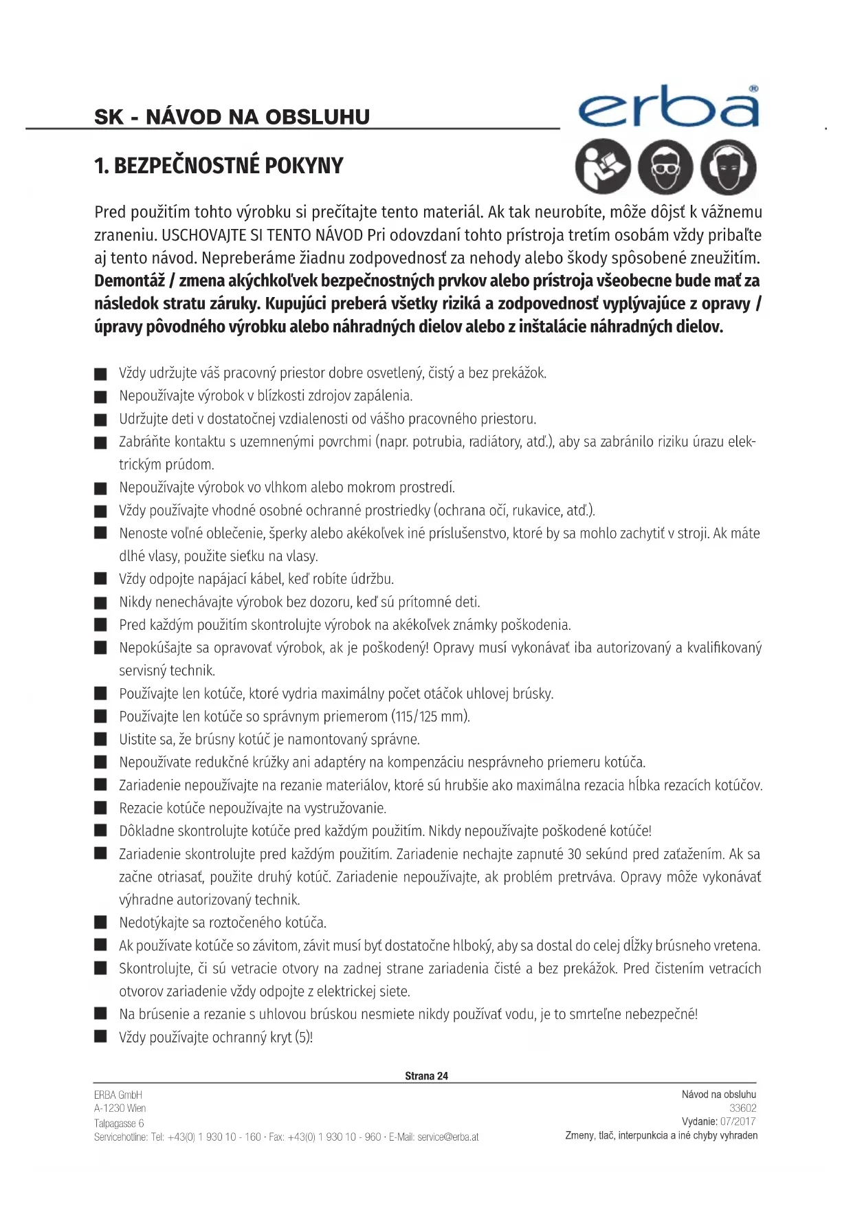 Pred použitim tohto vyrobku si precitajte tento material. Ak tak neurobite, moze dojst k váznemu zraneniu. USCHOVAJTE SI TENTO NÁVOD Pri odovzdani tohto prístroja tretim osobám vždy príbalte aj tento námod. Nepreberáme Žiadnu zodpovednost za nehody alebo škody spôsobene zneuzitim. Demontáž / zmena akýchkolvek bezpečnostných prvkov alebo prístroja všeobecne bude mat za nasledok stratu záruky. Kupujúci preberá vsetky rizika a zodpovednost vyplývajúce z opravy / upravy pôvodného vyrobku alebo nahradních dielov alebo z instalacie nahradních dielov.