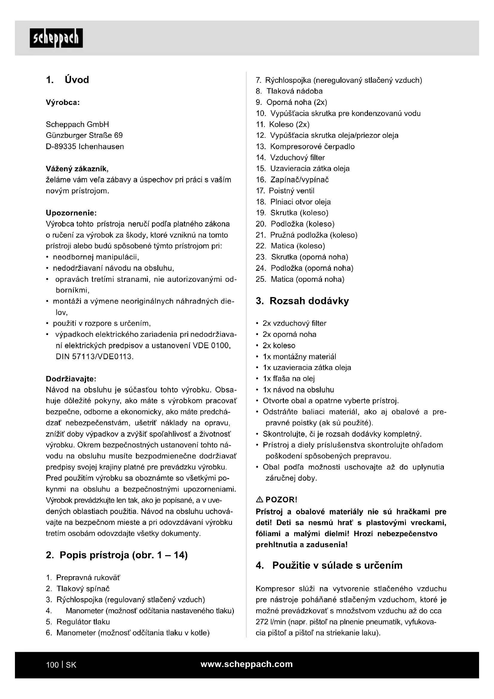 Výrobca: Scheppach GmbH Günzburger Straße 69 D-89335 Ichenhausen Vážený zákazník, želáme vám veľa zábavy a úspechov pri práci s vaším novým prístrojom. Upozornenie: Výrobca tohto prístroja neručí podľa platného zákona o ručení za výrobok za škody, ktoré vzniknú na tomto prístroji alebo budú spôsobené týmto prístrojom pri: