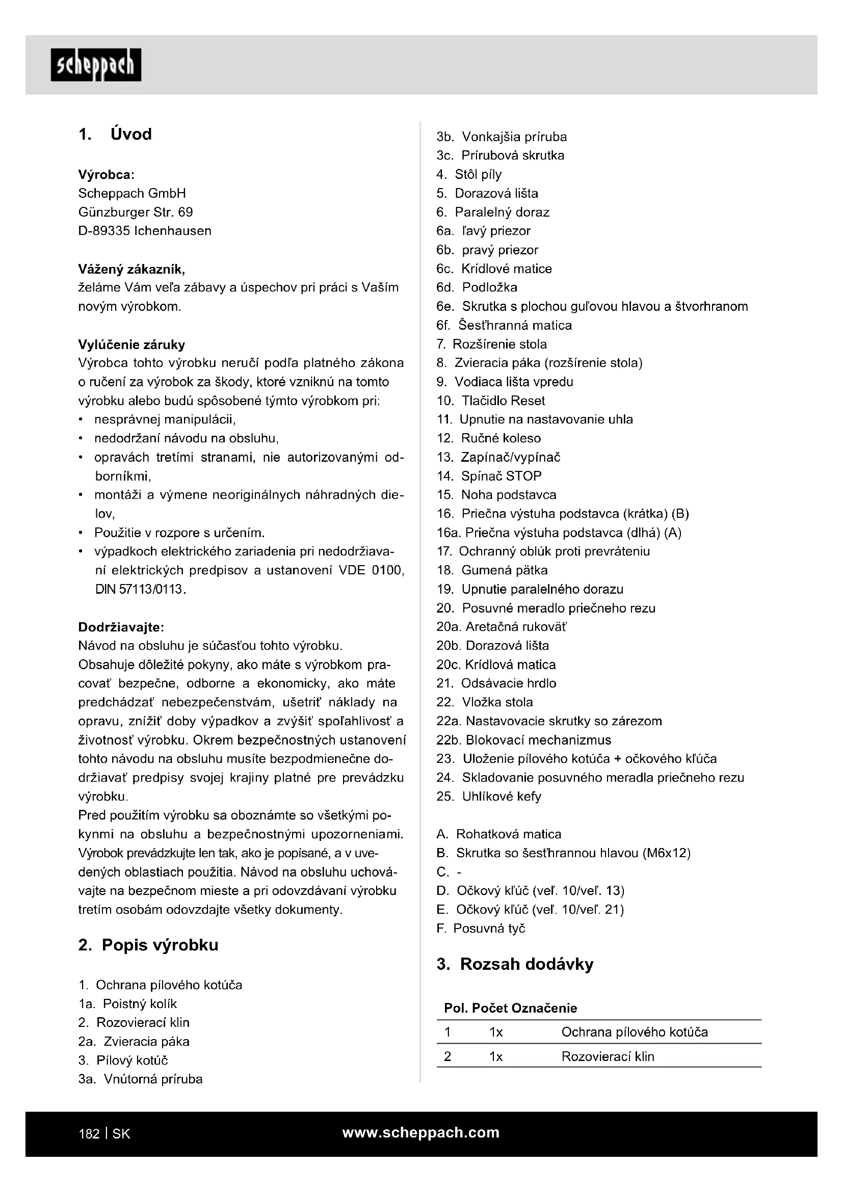 Výrobca: Scheppach GmbH Günzburger Str. 69 D-89335 Ichenhausen Vážený zákazník, želáme Vám veľa zábavy a úspechov pri práci s Vaším novým výrobkom. Vylúčenie záruky Výrobca tohto výrobku neručí podľa platného zákona o ručení za výrobok za škody, ktoré vzniknú na tomto výrobku alebo budú spôsobené týmto výrobkom pri: