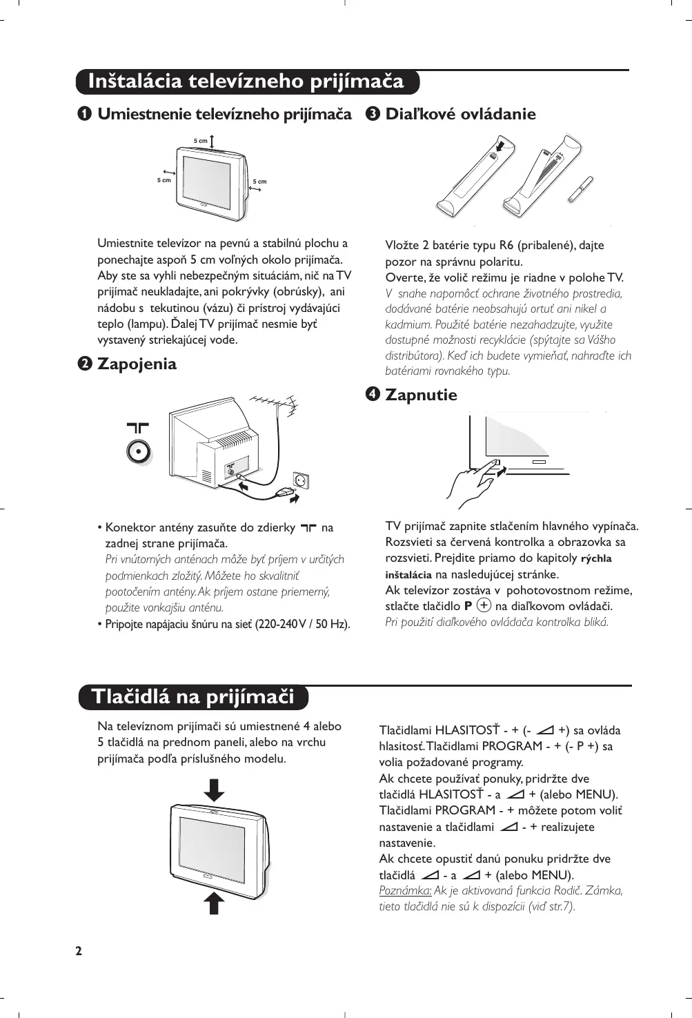 Obsah Inštalácia Inštalácia televízneho prijímača . . . . . . . . . . . . . . . . . . . . . . . . . . . . . . . . . . . . . . . .2 Tlačidlá na prijímači . . . . . . . . . . . . . . . . . . . . . . . . . . . . . . . . . . . . . . . . . . . . . . . .2 Tlačidlá na diaľkovom ovládači . . . . . . . . . . . . . . . . . . . . . . . . . . . . . . . . . . . . . . . .3 Rýchla inštalácia kanálov . . . . . . . . . . . . . . . . . . . . . . . . . . . . . . . . . . . . . . . . . . . . .4 Triedenie programov . . . . . . . . . . . . . . . . . . . . . . . . . . . . . . . . . . . . . . . . . . . . . . .4 Názov programu . . . . . . . . . . . . . . . . . . . . . . . . . . . . . . . . . . . . . . . . . . . . . . . . . . .4 Manuálne uloženie . . . . . . . . . . . . . . . . . . . . . . . . . . . . . . . . . . . . . . . . . . . . . . . . .5 Preferované programy . . . . . . . . . . . . . . . . . . . . . . . . . . . . . . . . . . . . . . . . . . . . . .5 Iné nastavenia z ponuky Inštalácia . . . . . . . . . . . . . . . . . . . . . . . . . . . . . . . . . . . . .5 Ovládanie Nastavenie obrazu . . . . . . . . . . . . . . . . . . . . . . . . . . . . . . . . . . . . . . . . . . . . . . . . .6 Nastavenie zvuku . . . . . . . . . . . . . . . . . . . . . . . . . . . . . . . . . . . . . . . . . . . . . . . . . .6 Nastavenie volieb . . . . . . . . . . . . . . . . . . . . . . . . . . . . . . . . . . . . . . . . . . . . . . . . . .6 Budenie . . . . . . . . . . . . . . . . . . . . . . . . . . . . . . . . . . . . . . . . . . . . . . . . . . . . . . . . . .7 Zámka televízora . . . . . . . . . . . . . . . . . . . . . . . . . . . . . . . . . . . . . . . . . . . . . . . . . .7 Teletext . . . . . . . . . . . . . . . . . . . . . . . . . . . . . . . . . . . . . . . . . . . . . . . . . . . . . . . . . .8 Formát 16:9 . . . . . . . . . . . . . . . . . . . . . . . . . . . . . . . . . . . . . . . . . . . . . . . . . . . . . . .9 Použitie funkcie PIP . . . . . . . . . . . . . . . . . . . . . . . . . . . . . . . . . . . . . . . . . . . . . . . . .9 Periférne zariadenia Videorekordér . . . . . . . . . . . . . . . . . . . . . . . . . . . . . . . . . . . . . . . . . . . . . . . . . . .10 Ostatné zariadenia . . . . . . . . . . . . . . . . . . . . . . . . . . . . . . . . . . . . . . . . . . . . . . . .10 Navolenie pripojeného zariadenia . . . . . . . . . . . . . . . . . . . . . . . . . . . . . . . . . . . . .10 Bočné pripojenia . . . . . . . . . . . . . . . . . . . . . . . . . . . . . . . . . . . . . . . . . . . . . . . . . .11 Tlačidlá VCR alebo DVD . . . . . . . . . . . . . . . . . . . . . . . . . . . . . . . . . . . . . . . . . . . .11 Praktické informácie Rady . . . . . . . . . . . . . . . . . . . . . . . . . . . . . . . . . . . . . . . . . . . . . . . . . . . . . . . . . . . .12 Zhrnutie . . . . . . . . . . . . . . . . . . . . . . . . . . . . . . . . . . . . . . . . . . . . . . . . . . . . . . . .12