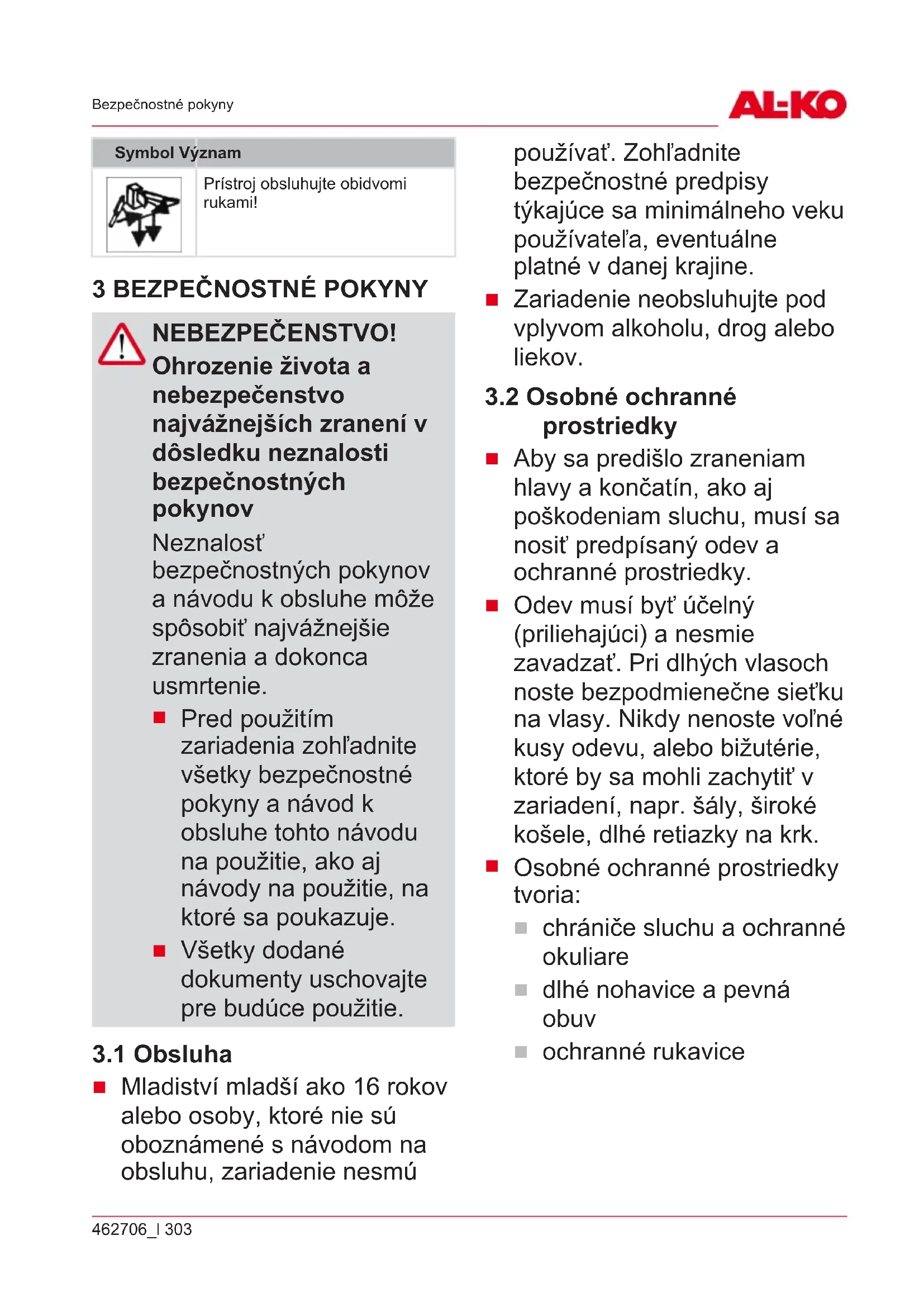 NEBEZPEČENSTVO! Ohrozenie života a nebezpečenstvo najvážnejších zranení v dôsledku neznalosti bezpečnostných pokynov Neznalosť bezpečnostných pokynov a návodu k obsluhe môže spôsobiť najvážnejšie zranenia a dokonca usmrtenie.