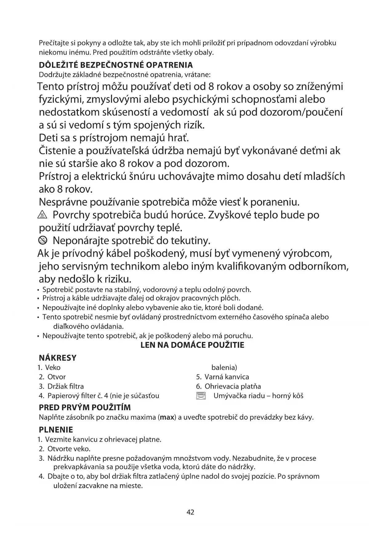 Dodržujte základné bezpečnostné opatrenia, vrátane: Tento prístroj môžu používať deti od 8 rokov a osoby so zníženými fyzickými, zmyslovými alebo psychickými schopnosťami alebo nedostatkom skúseností a vedomostí ak sú pod dozorom/poučení a sú si vedomí s tým spojených rizík. Deti sa s prístrojom nemajú hrať. Čistenie a používateľská údržba nemajú byť vykonávané deťmi ak nie sú staršie ako 8 rokov a pod dozorom. Prístroj a elektrickú šnúru uchovávajte mimo dosahu detí mladších ako 8 rokov. Nesprávne používanie spotrebiča môže viesť k poraneniu. h Povrchy spotrebiča budú horúce. Zvyškové teplo bude po použití udržiavať povrchy teplé. l Neponárajte spotrebič do tekutiny. Ak je prívodný kábel poškodený, musí byť vymenený výrobcom, jeho servisným technikom alebo iným kvalifikovaným odborníkom, aby nedošlo k riziku.