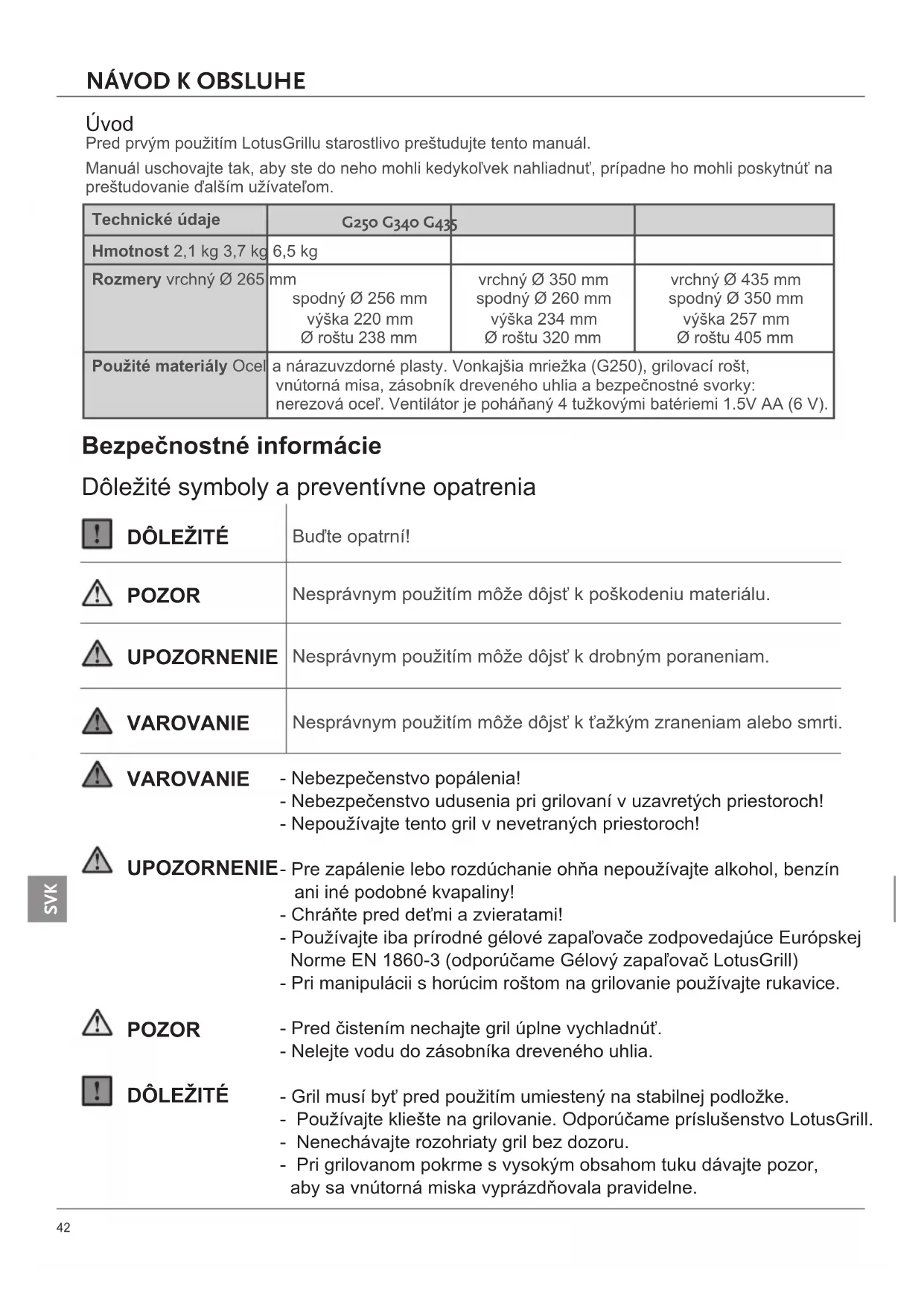 UPOZORNENIE Úvod Pred prvým použitím LotusGrillu starostlivo preštudujte tento manuál. Manuál uschovajte tak, aby ste do neho mohli kedykoľvek nahliadnuť, prípadne ho mohli poskytnúť na preštudovanie ďalším užívateľom. UPOZORNENIE POZOR VAROVANIE POZOR VAROVANIE