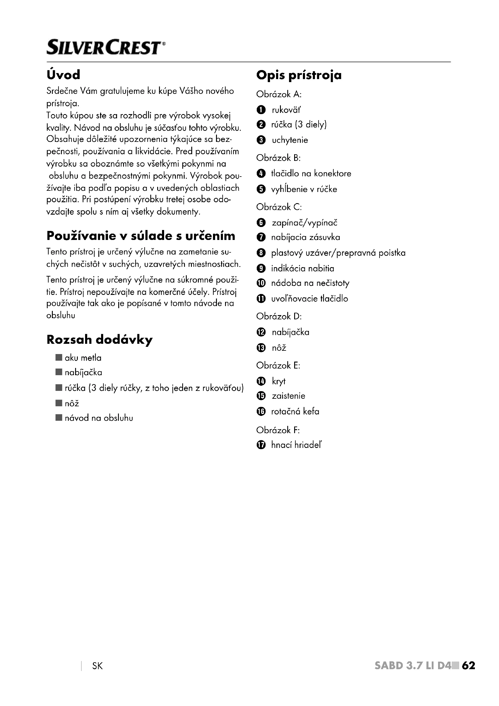 SK Úvod Srdečne Vám gratulujeme ku kúpe Vášho nového prístroja. Touto kúpou ste sa rozhodli pre výrobok vysokej kvality. Návod naobsluhu je súčasťou tohto výrobku. Obsahuje dôležité upozornenia týkajúce sa bez- pečnosti, používania a likvidácie. Pred používaním výrobku sa oboznámte sovšetkými pokynmi na obsluhu abezpečnostnými pokynmi. Výrobok pou- žívajte iba podľa popisu a vuvedených oblastiach použitia. Pri postúpení výrobku tretej osobe odo- vzdajte spolu sním aj všetky dokumenty. Používanie vsúlade surčením Tento prístroj je určený výlučne na zametanie su- chých nečistôt v suchých, uzavretých miestnostiach. Tento prístroj je určený výlučne nasúkromné použi- tie. Prístroj nepoužívajte na komerčné účely. Prístroj používajte tak ako je popísané vtomto návode na obsluhu Rozsah dodávky ■ aku metla ■ nabíjačka ■ rúčka (3 diely rúčky, z toho jeden z rukoväťou) ■ nôž ■ návod na obsluhu Opis prístroja Obrázok A: 1 rukoväť 2 rúčka (3 diely) 3 uchytenie Obrázok B: 4 tlačidlo na konektore 5 vyhĺbenie v rúčke Obrázok C: 6 zapínač/vypínač 7 nabíjacia zásuvka 8 plastový uzáver/prepravná poistka 9 indikácia nabitia 0 nádoba na nečistoty q uvoľňovacie tlačidlo Obrázok D: w nabíjačka e nôž Obrázok E: r kryt t zaistenie z rotačná kefa Obrázok F: u hnací hriadeľSABD 3.7 LI D4 SK