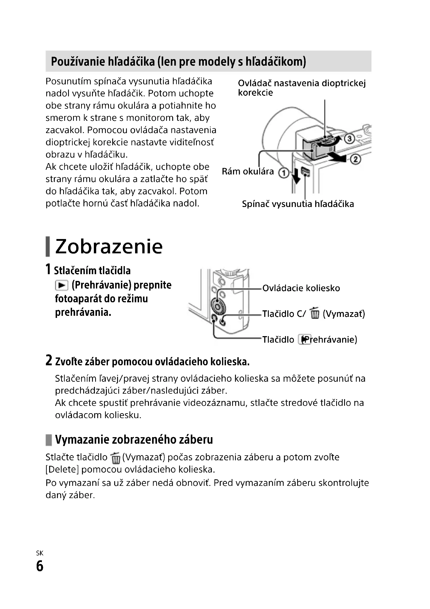Používanie hľadáčika (len pre modely s hľadáčikom) Posunutím spínača vysunutia hľadáčika nadol vysuňte hľadáčik. Potom uchopte obe strany rámu okulára a potiahnite ho smerom k strane s monitorom tak, aby zacvakol. Pomocou ovládača nastavenia dioptrickej korekcie nastavte viditeľnosť obrazu v hľadáčiku. Ak chcete uložiť hľadáčik, uchopte obe strany rámu okulára a zatlačte ho späť do hľadáčika tak, aby zacvakol. Potom potlačte hornú časť hľadáčika nadol. Rám okuláraSpínač vysunutia hľadáčikaOvládač nastavenia dioptrickej korekcie Zobrazenie 1 Stlačením tlačidla (Prehrávanie) prepnite fotoaparát do režimu prehrávania. Tlačidlo (Prehrávanie)Tlačidlo C/ (Vymazať)Ovládacie koliesko 2 Zvoľte záber pomocou ovládacieho kolieska. Stlačením ľavej/pravej strany ovládacieho kolieska sa môžete posunúť na predchádzajúci záber/nasledujúci záber. Ak chcete spustiť prehrávanie videozáznamu, stlačte stredové tlačidlo na ovládacom koliesku. Vymazanie zobrazeného záberu Stlačte tlačidlo (Vymazať) počas zobrazenia záberu a potom zvoľte [Delete] pomocou ovládacieho kolieska. Po vymazaní sa už záber nedá obnoviť. Pred vymazaním záberu skontrolujte daný záber.SK