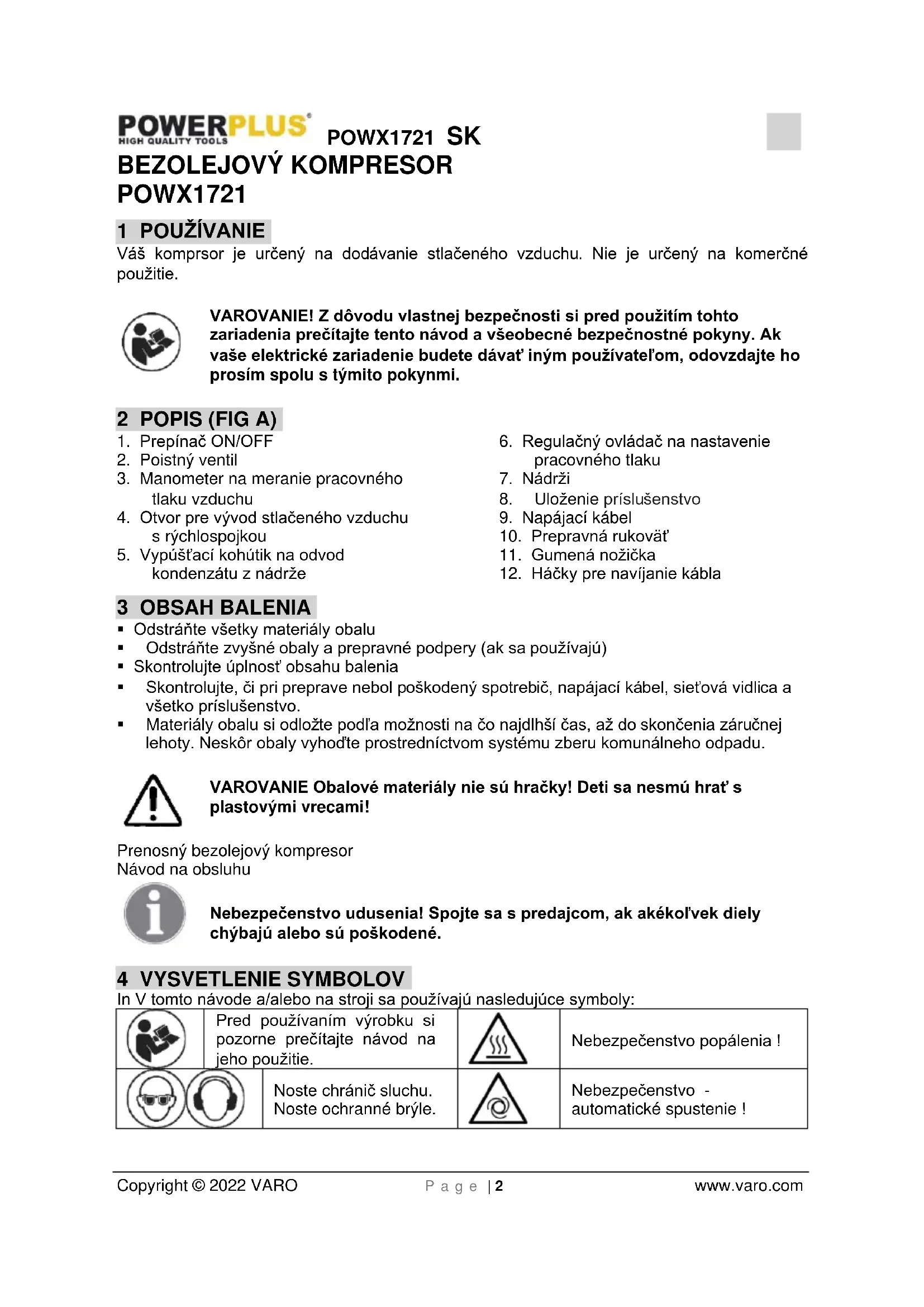 Copyright © 2022 VARO P a g e | 2 www.varo.com BEZOLEJOVÝ KOMPRESOR POWX1721 1 POUŽÍVANIE Váš komprsor je určený na dodávanie stlačeného vzduchu. Nie je určený na komerčné použitie. VAROVANIE! Z dôvodu vlastnej bezpečnosti si pred použitím tohto zariadenia prečítajte tento návod a všeobecné bezpečnostné pokyny. Ak vaše elektrické zariadenie budete dávať iným používateľom, odovzdajte ho prosím spolu s týmito pokynmi. 2 POPIS (FIG A)