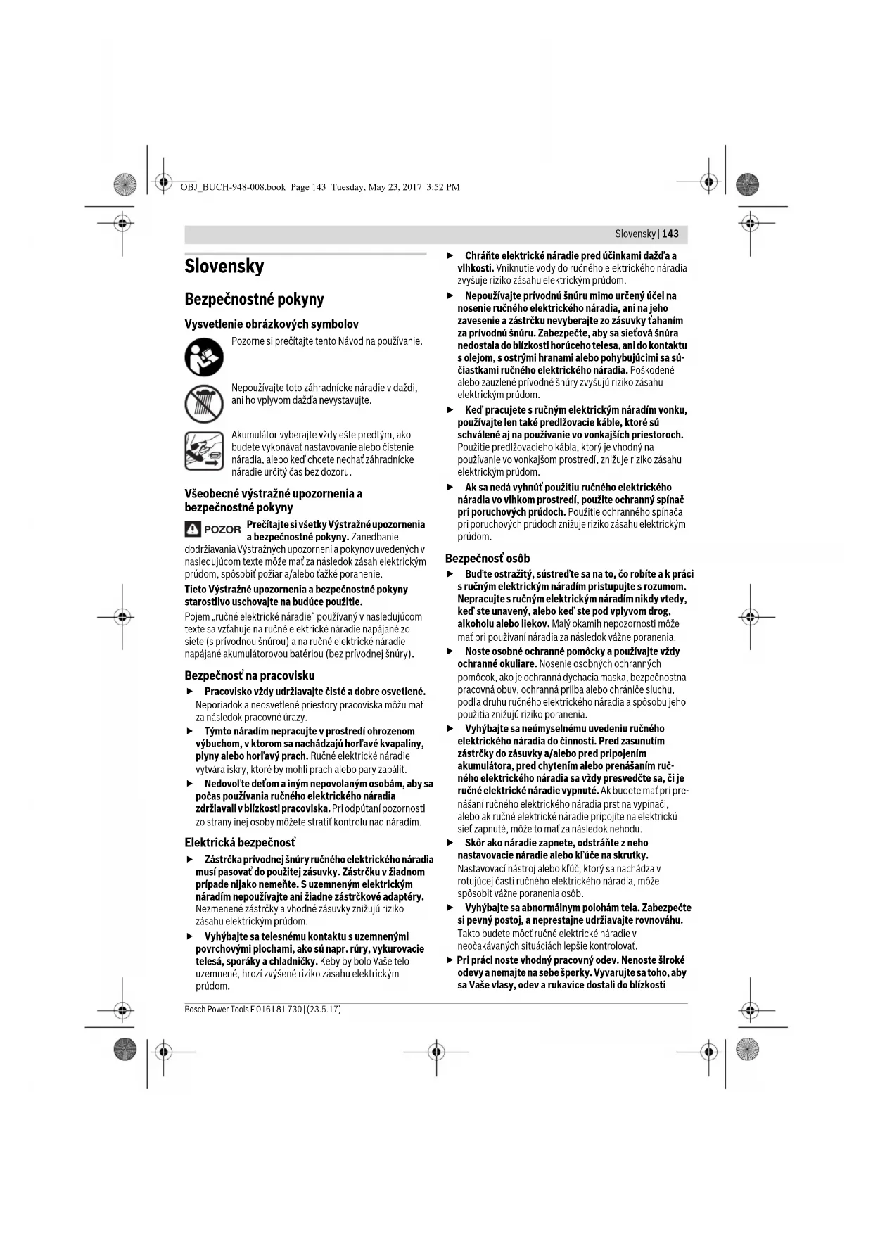 - v závislosti od použitého akumulátora OBJ_BUCH-948-008.book Page 148 Tuesday, May 23, 2017 3:52 PMSlovensky | 149 Bosch Power Tools F 016 L81 730 | (23.5.17) Montáž a používanie Uvedenie do prevádzky Pre Vašu bezpečnosť Upozornenie: Záhradnícke náradie vypínajte a akumulátor vyberajte vždy ešte predtým, ako budete vykonávať nastavovacie práce alebo čistenie náradia. Po vypnutí nožníc na živý plot sa nože ešte niekoľko zlomkov sekundy pohybujú ďalej. Nedotýkajte sa pohybujúcich sa nožov. Nabíjanie akumulátorov Nepoužívajte žiadnu inú nabíjačku. Dodávaná nabíjačka je priamo konštruovaná na nabíjanie lítiovo-iónových akumulátorov zabudovaných do Vášho záhradníckeho náradia. Všimnite si napätie siete! Napätie zdroja prúdu musí mať hodnotu zhodnú s údajmi na typovom štítku ručného elektrického náradia. Ručné elektrické náradie označené pre napätie 230 V sa smie používať aj s napätím 220 V. Akumulátor je vybavený tepelnou poistkou, ktorá dovolí nabíjanie akumulátora len v rozsahu teplôt medzi 0 °C a 45 °C. Vďaka tomu sa zabezpečí vyššia životnosť akumulátora. Upozornenie: Akumulátor sa dodáva v čiastočne nabitom stave. Aby ste zaručili plný výkon akumulátora, pred prvým použitím akumulátor v nabíjačke úplne nabite. Lítiovo-iónové akumulátory možno kedykoľvek dobíjať bez toho, aby to negatívne ovplyvnilo ich životnosť. Prerušenie nabíjania takýto akumulátor nepoškodzuje. Lítiovo-iónový akumulátor je chránený proti hlbokému vybitiu „pomocou elektronickej ochrany článku (ECL – Electronic Cell Protection)“. Keď je akumulátor vybitý, záhradnícke náradie sa pomocou ochranného obvodu vypne: Záhradnícke náradie už nepracuje. Po automatickom vypnutí záhradníckeho náradia už viac vypínač nestláčajte. Akumulátor by sa mohol poškodiť. Nabíjanie Nabíjanie začína vo chvíli, keď sa zasunie zástrčka nabíjačky do zásuvky a akumulátor je zasunutý do nabíjacej šachty . Inteligentné nabíjanie automaticky spozná stav nabitia akumulátora a nabíja ho optimálnym nabíjacím prúdom v závislosti od konkrétnej teploty a napätia akumulátora. Takýmto spôsobom sa šetrí akumulátor a počas uloženia v nabíjačke zostáva vždy úplne nabitý. Rýchlonabíjanie Rýchlonabíjanie je signalizované blikaním zelenej indikácie LED. Indikačný prvok na akumulátore: Počas nabíjacieho procesu sa tri zelené diódy LED akumulátora rozsvecujú jedna po druhej a zakrátko zhasínajú. Akumulátor je úplne nabitý vtedy, keď všetky tri zelené diódy LED svietia trvalo. Asi 5 minút po úplnom nabití akumulátora tri zelené diódy LED opäť zhasnú. Upozornenie: Rýchlonabíjanie je možné len vtedy, keď leží teplota akumulátora v prípustnom rozsahu nabíjacích teplôt, pozri odsek „Technické údaje“. Akumulátor nabitý Trvalé svetlo zelenej diódy LED signalizuje, že akumulátor je úplne nabitý. Okrem toho sa ozve na dobu cca 2 sekundy zvukový signál, ktorý akusticky signalizuje úplné nabitie akumulátora. Akumulátor sa potom dá ihneď vybrať na okamžité používanie. Bez zasunutého akumulátora signalizuje trvalé svetlo zelenej indikácie LED , že zástrčka nabíjačky je zasunutá v sieti a nabíjačka je pripravená na prevádzku. Teplota akumulátora pod 0 °C alebo nad 45 °C Trvalé svetlo červenej indikácie LED signalizuje, že teplota akumulátora sa nachádza mimo dovoleného rozsahu teploty 0 ° C – 45 ° C. Len čo sa dosiahne teplota v prípustnom rozsahu, nabíjačka sa automaticky prepne na rýchlonabíjanie. Ak sa akumulátor nachádza mimo dovoleného rozsahu teploty, zasvieti pri vložení akumulátora do nabíjačky červená dióda LED akumulátora. Nabíjanie nie je možné Ak sa vyskytne iná porucha nabíjacieho procesu, bude táto signalizovaná blikaním červenej indikácie LED. Proces nabíjania sa nemôže spustiť a nabíjanie akumulátora nie je možné (pozri odsek „Hľadanie porúch“). Cieľ činnosti Obrázok Strana Obsah dodávky (základná výbava)