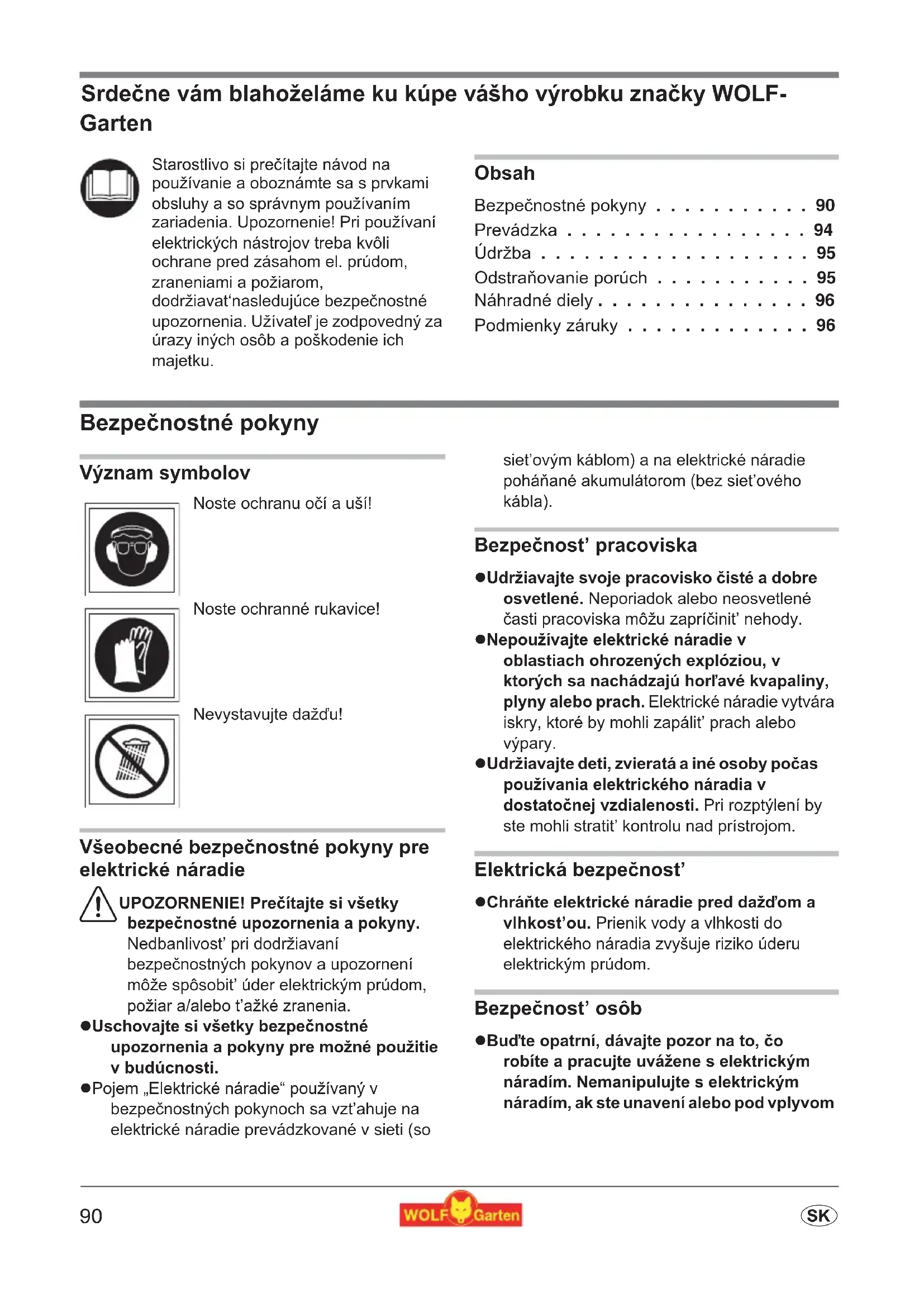 - s Srde?ne vám blahoželáme ku kúpe vášho výrobku zna?ky WOLF- Garten Obsah Bezpenostné pokyny p. 90