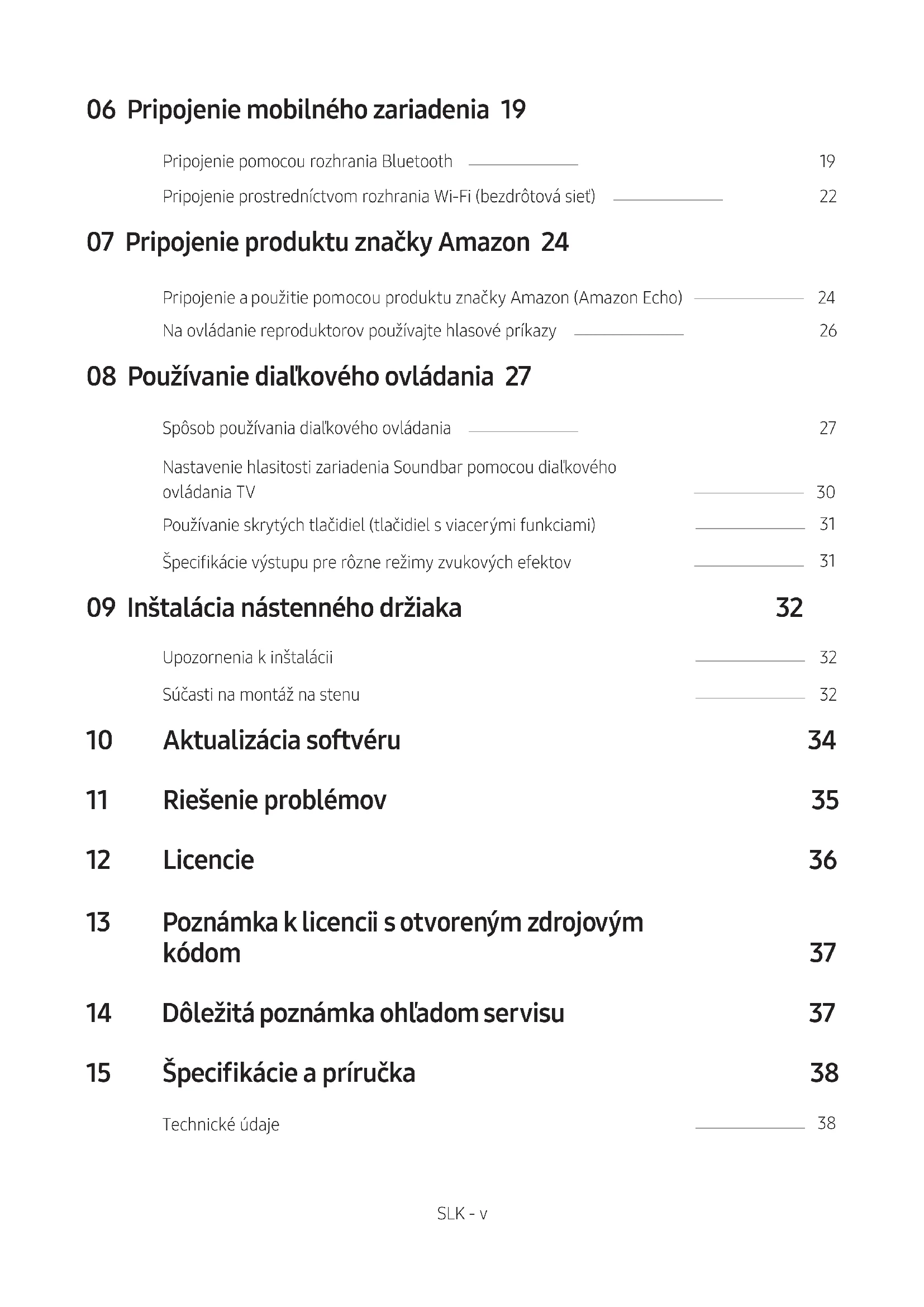 ÚPLNÁ PRÍRUČKA je dostupný cez online centrum zákazníckej podpory spoločnosti Samsung nasnímaním QR kódu. Na zobrazenie manuálu na osobnom počítači alebo na mobilnom zariadení si manuál stiahnite vo formáte dokumentu z webovej lokality spoločnosti Samsung. (http://www.samsung.com/support) Dizajn, špecikácie a obrazovka aplikácie sa môžu zmeniť bez predchádzajúceho upozornenia.SLK - iv OBSAH 01 Kontrola súčastí 2 Vloženie batérií pred použitím diaľkového ovládania (2 batérie AA) ------------------------- 2 02 Opis produktu 3 Predný panel / Horný panel zariadenia Soundbar ------------------------- 3 Spodný panel zariadenia Soundbar ------------------------- 4 03 Pripojenie zariadenia Soundbar 5 Pripojenie elektrického napájania