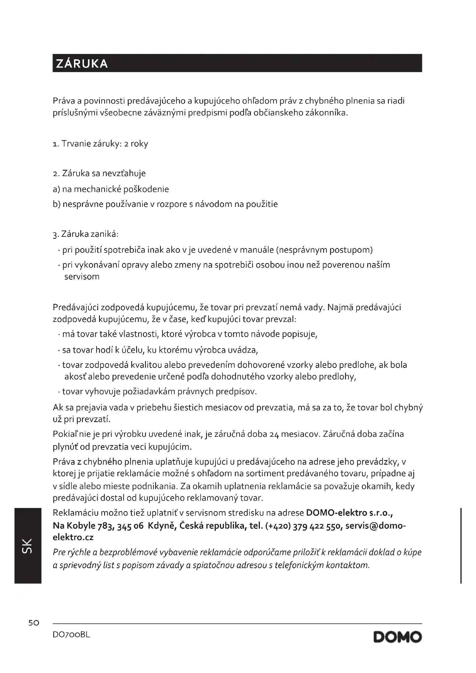 - tovar vyhovuje požiadavkám právnych predpisov. Ak sa prejavia vada v priebehu šiestich mesiacov od prevzatia, má sa za to, že tovar bol chybný už pri prevzatí. Pokiaľ nie je pri výrobku uvedené inak, je záručná doba 24 mesiacov. Záručná doba začína plynúť od prevzatia veci kupujúcim. Práva z chybného plnenia uplatňuje kupujúci u predávajúceho na adrese jeho prevádzky, v ktorej je prijatie reklamácie možné s ohľadom na sortiment predávaného tovaru, prípadne aj v sídle alebo mieste podnikania. Za okamih uplatnenia reklamácie sa považuje okamih, kedy predávajúci dostal od kupujúceho reklamovaný tovar. Reklamáciu možno tiež uplatniť v servisnom stredisku na adrese DOMO-elektro s.r.o., Na Kobyle 783, 345 06 Kdyně, Česká republika, tel. (+420) 379 422 550, servis@domo- elektro.cz Pre rýchle a bezproblémové vybavenie reklamácie odporúčame priložiť k reklamácii doklad o kúpe a sprievodný list s popisom závady a spiatočnou adresou s telefonickým kontaktom.51 DO700BL www.domo-elektro.be