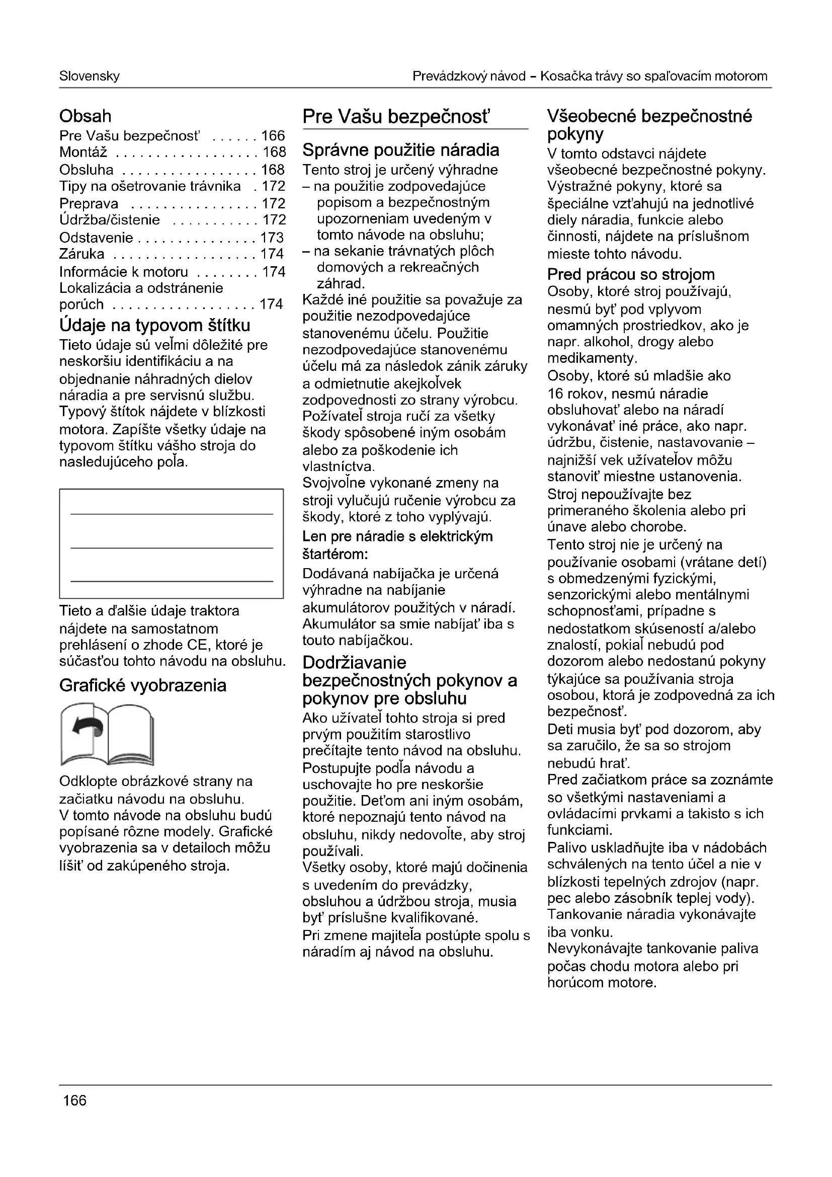 - Lokalizácia a odstránenie porúch Údaje na typovom štítku Tieto údaje sú veľmi dôležité pre neskoršiu identifikáciu a na objednanie náhradných dielov náradia a pre servisnú službu. Typový štítok nájdete v blízkosti motora. Zapíšte všetky údaje na typovom štítku vášho stroja do nasledujúceho poľa. Tieto a ďalšie údaje traktora nájdete na samostatnom prehlásení o zhode CE, ktoré je súčasťou tohto návodu na obsluhu. Grafické vyobrazenia Odklopte obrázkové strany na začiatku návodu na obsluhu. V tomto návode na obsluhu budú popísané rôzne modely. Grafické vyobrazenia sa v detailoch môžu líšiť od zakúpeného stroja. Pre Vašu bezpečnosť Správne použitie náradia Tento stroj je určený výhradne – na použitie zodpovedajúce popisom a bezpečnostným upozorneniam uvedeným v tomto návode na obsluhu; – na sekanie trávnatých plôch domových a rekreačných záhrad. Každé iné použitie sa považuje za použitie nezodpovedajúce stanovenému účelu. Použitie nezodpovedajúce stanovenému účelu má za následok zánik záruky a odmietnutie akejkoľvek zodpovednosti zo strany výrobcu. Požívateľ stroja ručí za všetky škody spôsobené iným osobám alebo za poškodenie ich vlastníctva. Svojvoľne vykonané zmeny na stroji vylučujú ručenie výrobcu za škody, ktoré z toho vyplývajú. Len pre náradie s elektrickým štartérom: Dodávaná nabíjačka je určená výhradne na nabíjanie akumulátorov použitých v náradí. Akumulátor sa smie nabíjať iba s touto nabíjačkou. Dodržiavanie bezpečnostných pokynov a pokynov pre obsluhu Ako užívateľ tohto stroja si pred prvým použitím starostlivo prečítajte tento návod na obsluhu. Postupujte podľa návodu a uschovajte ho pre neskoršie použitie. Deťom ani iným osobám, ktoré nepoznajú tento návod na obsluhu, nikdy nedovoľte, aby stroj používali. Všetky osoby, ktoré majú dočinenia s uvedením do prevádzky, obsluhou a údržbou stroja, musia byť príslušne kvalifikované. Pri zmene majiteľa postúpte spolu s náradím aj návod na obsluhu. Všeobecné bezpečnostné pokyny V tomto odstavci nájdete všeobecné bezpečnostné pokyny. Výstražné pokyny, ktoré sa špeciálne vzťahujú na jednotlivé diely náradia, funkcie alebo činnosti, nájdete na príslušnom mieste tohto návodu. Pred prácou so strojom Osoby, ktoré stroj používajú, nesmú byť pod vplyvom omamných prostriedkov, ako je napr. alkohol, drogy alebo medikamenty. Osoby, ktoré sú mladšie ako p. 174