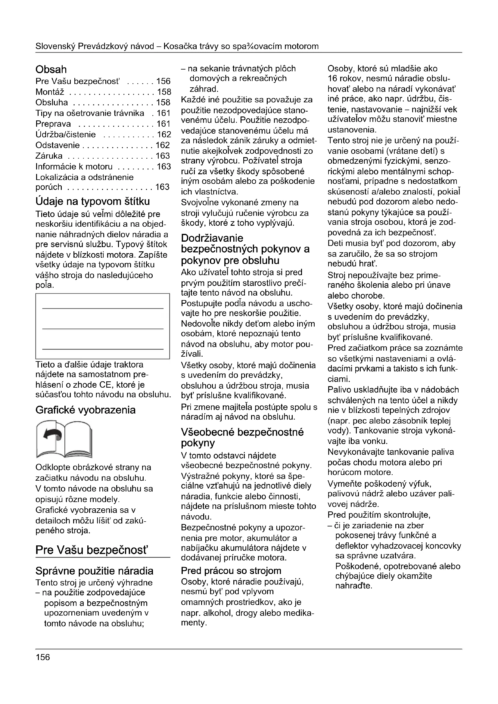 - Lokalizácia a odstránenie porúch Údaje na typovom štítku Tieto údaje sú veľmi dôležité pre neskoršiu identifikáciu a na objed- nanie náhradných dielov náradia a pre servisnú službu. Typový štítok nájdete v blízkosti motora. Zapíšte všetky údaje na typovom štítku vášho stroja do nasledujúceho poľa. Tieto a ďalšie údaje traktora nájdete na samostatnom pre- hlásení o zhode CE, ktoré je súčasťou tohto návodu na obsluhu. Grafické vyobrazenia Odklopte obrázkové strany na začiatku návodu na obsluhu. V tomto návode na obsluhu sa opisujú rôzne modely. Grafické vyobrazenia sa v detailoch môžu líšiť od zakú- peného stroja. Pre Vašu bezpečnosť Správne použitie náradia Tento stroj je určený výhradne – na použitie zodpovedajúce popisom a bezpečnostným upozorneniam uvedeným v tomto návode na obsluhu; – na sekanie trávnatých plôch domových a rekreačných záhrad. Každé iné použitie sa považuje za použitie nezodpovedajúce stano- venému účelu. Použitie nezodpo- vedajúce stanovenému účelu má za následok zánik záruky a odmiet- nutie akejkoľvek zodpovednosti zo strany výrobcu. Požívateľ stroja ručí za všetky škody spôsobené iným osobám alebo za poškodenie ich vlastníctva. Svojvoľne vykonané zmeny na stroji vylučujú ručenie výrobcu za škody, ktoré z toho vyplývajú. Dodržiavanie bezpečnostných pokynov a pokynov pre obsluhu Ako užívateľ tohto stroja si pred prvým použitím starostlivo prečí- tajte tento návod na obsluhu. Postupujte podľa návodu a uscho- vajte ho pre neskoršie použitie. Nedovoľte nikdy deťom alebo iným osobám, ktoré nepoznajú tento návod na obsluhu, aby motor pou- žívali. Všetky osoby, ktoré majú dočinenia s uvedením do prevádzky, obsluhou a údržbou stroja, musia byť príslušne kvalifikované. Pri zmene majiteľa postúpte spolu s náradím aj návod na obsluhu. Všeobecné bezpečnostné pokyny V tomto odstavci nájdete všeobecné bezpečnostné pokyny. Výstražné pokyny, ktoré sa špe- ciálne vzťahujú na jednotlivé diely náradia, funkcie alebo činnosti, nájdete na príslušnom mieste tohto návodu. Bezpečnostné pokyny a upozor- nenia pre motor, akumulátor a nabíjačku akumulátora nájdete v dodávanej príručke motora. Pred prácou so strojom Osoby, ktoré náradie používajú, nesmú byť pod vplyvom omamných prostriedkov, ako je napr. alkohol, drogy alebo medika- menty. Osoby, ktoré sú mladšie ako 16 rokov, nesmú náradie obslu- hovať alebo na náradí vykonávať iné práce, ako napr. údržbu, čis- tenie, nastavovanie – najnižší vek užívateľov môžu stanoviť miestne ustanovenia. Tento stroj nie je určený na použí- vanie osobami (vrátane detí) s obmedzenými fyzickými, senzo- rickými alebo mentálnymi schop- nosťami, prípadne s nedostatkom skúseností a/alebo znalostí, pokiaľ nebudú pod dozorom alebo nedo- stanú pokyny týkajúce sa použí- vania stroja osobou, ktorá je zod- povedná za ich bezpečnosť. Deti musia byť pod dozorom, aby sa zaručilo, že sa so strojom nebudú hrať. Stroj nepoužívajte bez prime- raného školenia alebo pri únave alebo chorobe. Všetky osoby, ktoré majú dočinenia s uvedením do prevádzky, obsluhou a údržbou stroja, musia byť príslušne kvalifikované. Pred začiatkom práce sa zoznámte so všetkými nastaveniami a ovlá- dacími prvkami a takisto s ich funk- ciami. Palivo uskladňujte iba v nádobách schválených na tento účel a nikdy nie v blízkosti tepelných zdrojov (napr. pec alebo zásobník teplej vody). Tankovanie stroja vykoná- vajte iba vonku. Nevykonávajte tankovanie paliva počas chodu motora alebo pri horúcom motore. Vymeňte poškodený výfuk, palivovú nádrž alebo uzáver pali- vovej nádrže. Pred použitím skontrolujte, – či je zariadenie na zber pokosenej trávy funkčné a deflektor vyhadzovacej koncovky sa správne uzatvára. Poškodené, opotrebované alebo chýbajúce diely okamžite nahraďte.Prevádzkový návod – Kosačka trávy so spa¾ovacím motorom Slovenský p. 163
