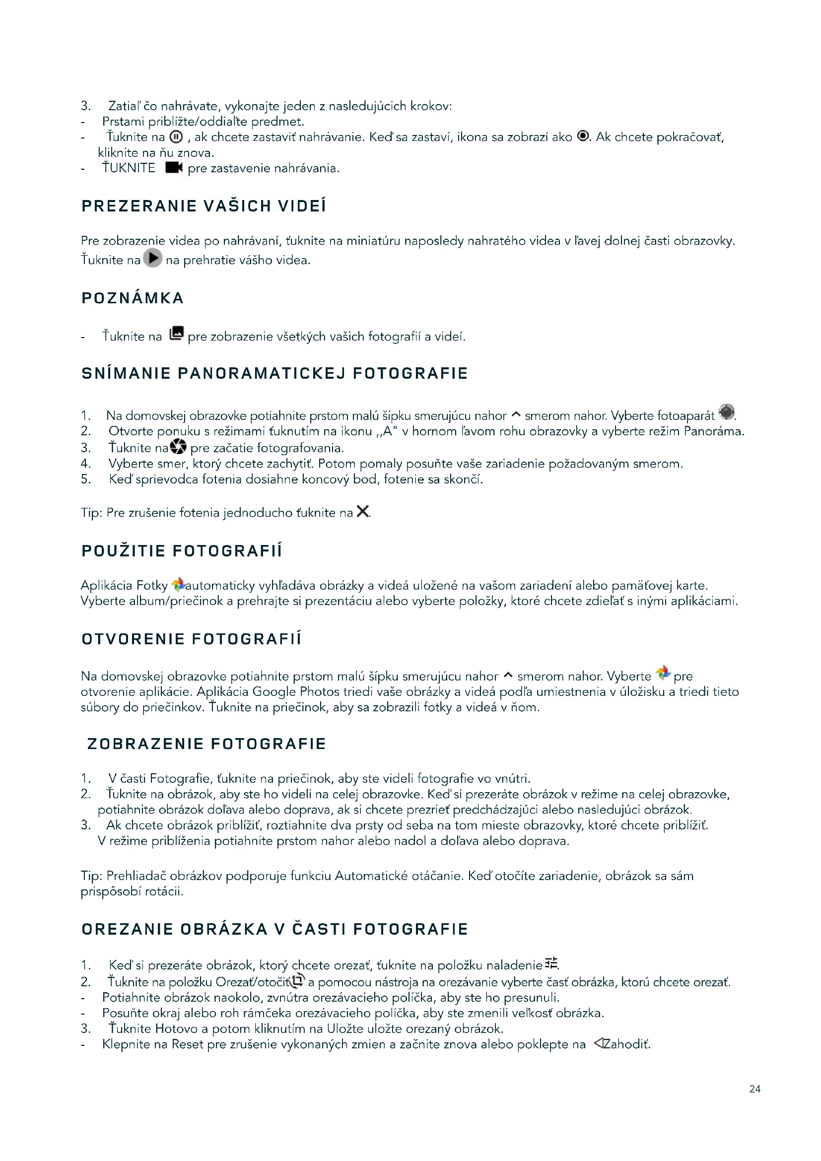 - Ťuknite:Pomocouprstavybertepoložku,potvrďtevýberalebospustiteaplikáciunaobrazovke. - Ťuknite a podržte:Ťuknutímnapoložkušpičkouprstaapodržte,ažkýmobrazovkanebudereagovať.Napríklad, akchceteotvoriťponukumožnostínaaktívnejobrazovke,dotknitesaobrazovkyapodržte,kýmsaponukaneobjaví. - Potiahnutie:Prejditeprstomcezobrazovkubuďvodorovnealebozvislo.Napríkladpotiahnitedoľavaalebo doprava,akchceteprepnúťmedziobrázkami. - Presunutie:Akchcetepoložkupresunúť,ťukniteapodržtejušpičkouprsta.Terazpresuňtepoložkudo akejkoľvekčastiobrazovky. DOMOVSKÁ OBRAZOVKA Domovskáobrazovkajevýchodiskovýmbodompreprístupkfunkciámvášhozariadenia.Zobrazujeikonyaplikácií, miniaplikácie,klávesovéskratkyaviac.Jemožnéjupersonalizovaťrôznymitapetamiamožnoprispôsobiť zobrazovanievašichpreferovanýchpoložiek.