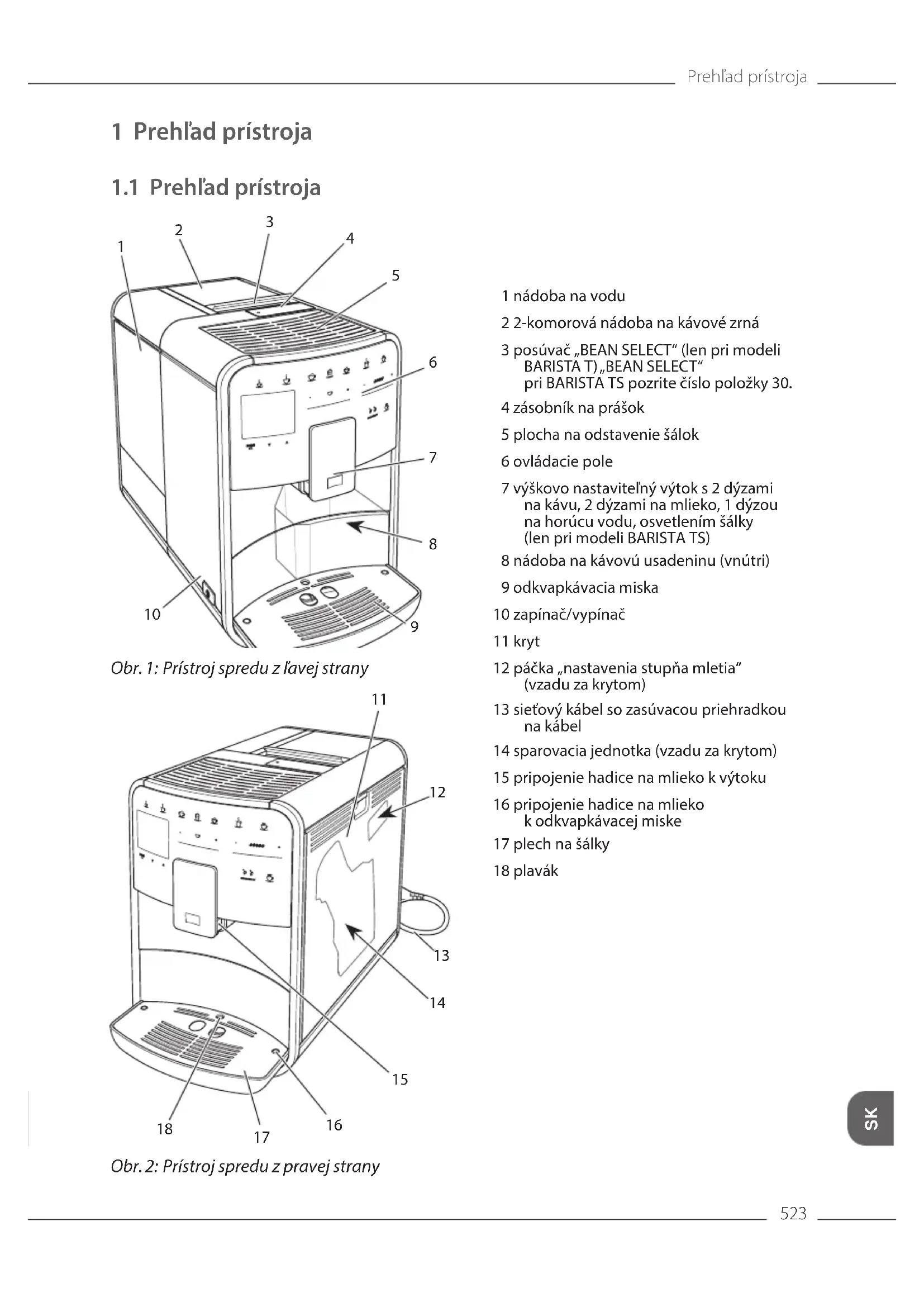 pri BARISTA TS pozrite číslo položky 30. 4 zásobník na prášok 5 plocha na odstavenie šálok 6 ovládacie pole 7 výškovo nastaviteľný výtok s 2 dýzami na kávu, 2 dýzami na mlieko, 1 dýzou na horúcu vodu, osvetlením šálky (len pri modeli BARISTA TS) 8 nádoba na kávovú usadeninu (vnútri) 9 odkvapkávacia miska 10 zapínač/vypínač 11 kryt 12 páčka „nastavenia stupňa mletia“ (vzadu za krytom) 13 sieťový kábel so zasúvacou priehradkou na kábel 14 sparovacia jednotka (vzadu za krytom) 15 pripojenie hadice na mlieko k výtoku 16 pripojenie hadice na mlieko k odkvapkávacej miske 17 plech na šálky 18 plavák524