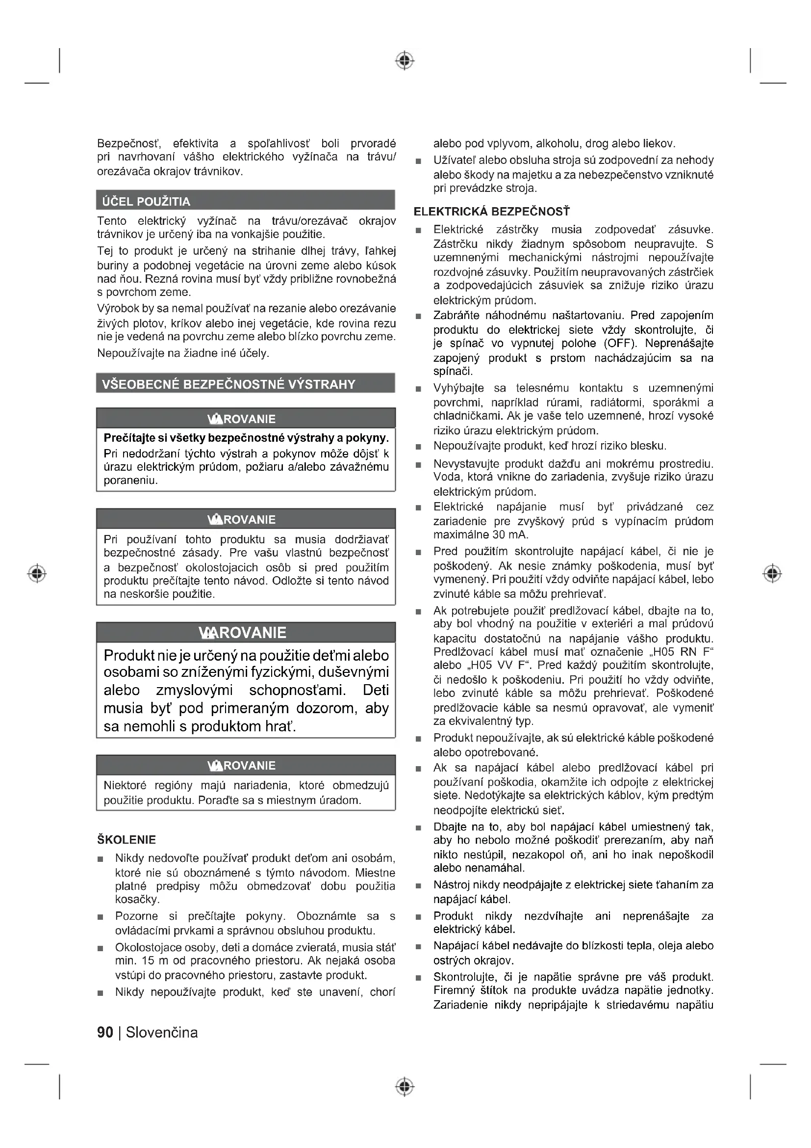 VAROVANIE Prečítajte si všetky bezpečnostné výstrahy a pokyny. Pri nedodržaní týchto výstrah a pokynov môže dôjsť k úrazu elektrickým prúdom, požiaru a/alebo závažnému poraneniu. VAROVANIE Pri používaní tohto produktu sa musia dodržiavať bezpečnostné zásady. Pre vašu vlastnú bezpečnosť a bezpečnosť okolostojacich osôb si pred použitím produktu prečítajte tento návod. Odložte si tento návod na neskoršie použitie. VAROVANIE Produkt nie je určený na použitie deťmi alebo osobami so zníženými fyzickými, duševnými alebo zmyslovými schopnosťami. Deti musia byť pod primeraným dozorom, aby sa nemohli s produktom hrať. VAROVANIE Niektoré regióny majú nariadenia, ktoré obmedzujú použitie produktu. Poraďte sa s miestnym úradom. ŠKOLENIE ■ Nikdy nedovoľte používať produkt deťom ani osobám, ktoré nie sú oboznámené s týmto návodom. Miestne platné predpisy môžu obmedzovať dobu použitia kosačky. ■ Pozorne si prečítajte pokyny. Oboznámte sa s ovládacími prvkami a správnou obsluhou produktu. ■ Okolostojace osoby, deti a domáce zvieratá, musia stáť min. 15 m od pracovného priestoru. Ak nejaká osoba vstúpi do pracovného priestoru, zastavte produkt. ■ Nikdy nepoužívajte produkt, keď ste unavení, chorí alebo pod vplyvom, alkoholu, drog alebo liekov. ■ Užívateľ alebo obsluha stroja sú zodpovední za nehody alebo škody na majetku a za nebezpečenstvo vzniknuté pri prevádzke stroja.