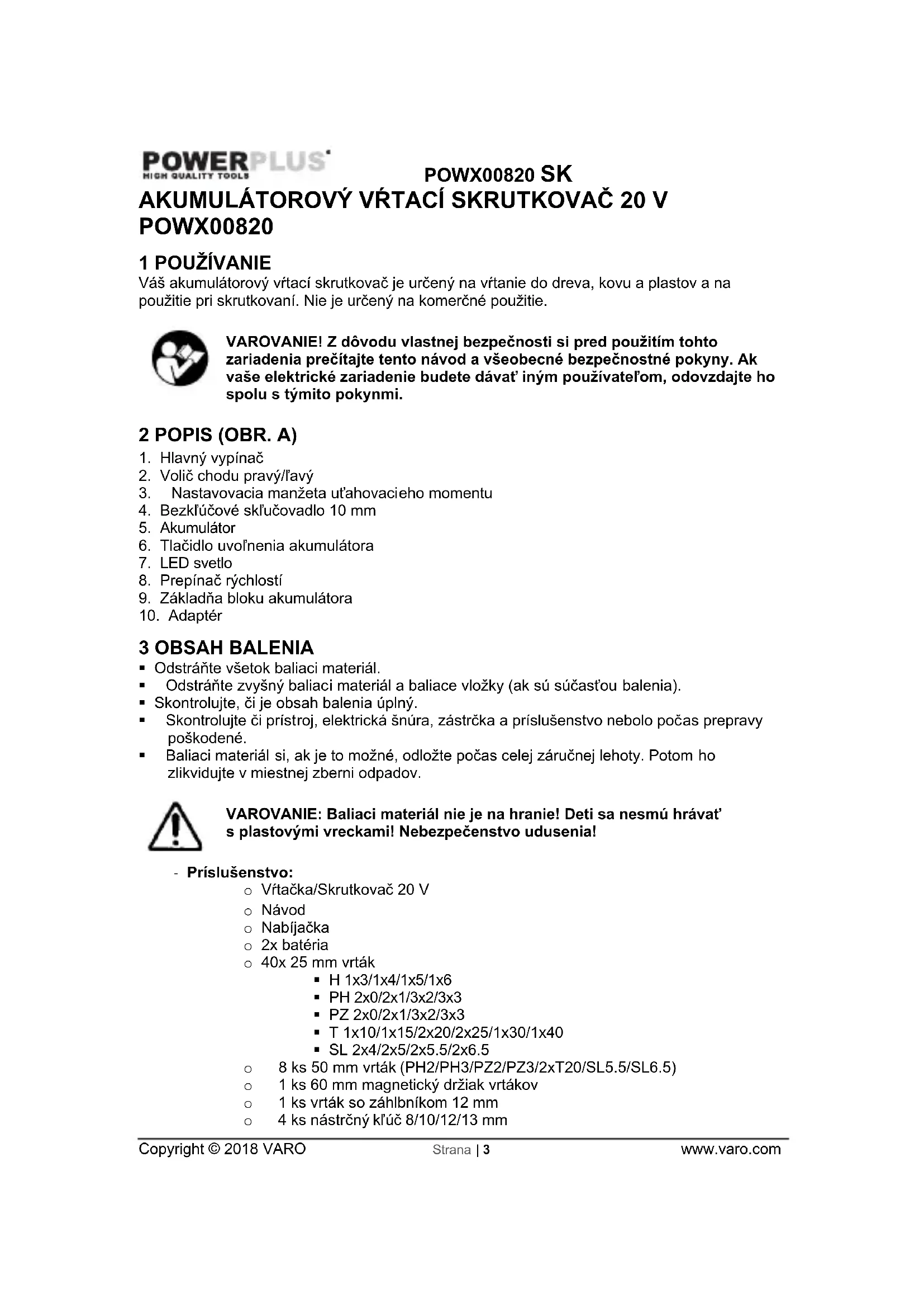 Poškodené vypínače musí vymeniť náš odbor popredajných služieb. Ak je pripojovací kábel (alebo sieťová vidlica) poškodený, musí byť vymenený za rovnaký pripojovací kábel, ktorý dodáva náš odbor popredajných služieb. Pripojovací kábel musí vymeniť iba naša servisná služba (pozri na poslednej strane) alebo kvalifikovaná osoba (kvalifikovaný elektrikár). 13 SKLADOVANIE Priebežne čistíme celé zariadenie a jeho príslušenstvo. Skladujte ho mimo dosahu detí, v stabilnej a bezpečnej polohe, na suchom a chladnom mieste, vyhnite sa privysokým a prinízkym teplotám. Nevystavujte priamemu slnečnému žiareniu. Ak je možné, uschovajte na tmavom mieste. Neudržiavajte v plastických taškách aby ste predišli nazhromaždenej vlhkosti. 14 ZÁRUKA Záručná lehota poskytovaná na tento výrobok v súlade s platnými zákonmi je 36 mesiacov a začína plynúť dňom zakúpenia prvým používateľom. Táto záruka zahŕňa všetky chyby materiálu a výrobné chyby, okrem: batérií, nabíjačiek, chybných súčastí, ktoré podliehajú bežnému opotrebovaniu ako napr. ložiská, kefky, káble a zástrčky alebo príslušenstvo ako vrtáky, vrtné korunky, pílové listy atď.; nezahŕňa poškodenia alebo chyby spôsobené zlým zaobchádzaním, nehodami alebo pozmeňovaním, ani náklady na prepravu. Poškodenie a/alebo chyby, ktoré sú dôsledkom nesprávneho používania, tiež nespadajú pod ustanovenia záruky.POWX00820 SK Copyright © 2018 VARO Strana | 10 www.varo.com Nenesieme ani žiadnu zodpovednosť za zranenie osôb, ktoré je dôsledkom nesprávneho používania zariadenia. Opravy smie vykonávať iba autorizované servisné stredisko pre nástroje Powerplus. Viac informácií získate na tel. čísle 00 32 3 292 92 90. Prípadné náklady na prepravu vždy nesie zákazník, ak nebolo písomnou formou dohodnuté inak. Záruku si zároveň nemožno uplatňovať, ak bolo zariadenie poškodené v dôsledku nedbanlivej údržby alebo preťaženia. Zo záruky sú definitívne vylúčené prípady, kedy poškodenie vzniklo dôsledkom vniknutia kvapaliny, nadmerného preniknutia prachu, úmyselného poškodenia (úmyselne alebo závažnou nedbanlivosťou), nevhodného použitia (použitie zariadenia na účely, na ktoré nie je vhodné), nekompetentného použitia (napr. nerešpektovaním pokynov v návode), neodbornej montáže, zásahu bleskom, chybného sieťového napätia. Neboli uvedené všetky možnosti. Prijatie reklamácie v rámci záruky nemá vplyv na predĺženie záručnej lehoty, ani na začatie novej záručnej lehoty v prípade výmeny zariadenia. Staré zariadenia alebo súčasti, ktoré sú vymieňané v rámci záruky, sa preto stávajú majetkom spol. Varo NV. Vyhradzujeme si právo zamietnuť akúkoľvek reklamáciu, ak nie je možné overiť dátum zakúpenia alebo ak je jasné, že výrobok nebol riadne udržiavaný. (čisté vetracie otvory, pravidelná údržba uhlíkových kefiek,…) Potvrdenku o nákupe si musíte uschovať ako doklad o dátume zakúpenia. Náradie musíte vrátiť v nerozobranom stave svojmu predajcovi v prijateľne čistom stave, v originálnom plastovom kufríku liatom pod tlakom, ak v ňom bolo vaše náradie dodané, spolu s priloženým dokladom o kúpe. Váš nástroj musíte nabíjať minimálne 1x mesačne, aby nástroj optimálne fungoval. 15 ŽIVOTNÉ PROSTREDIE Ak musíte po dlhodobom používaní zariadenie vymeniť, nelikvidujte ho spolu s domovým odpadom, ale ekologicky správnym spôsobom. Odpad, ktorý vzniká pri likvidácii elektrických strojov, sa nesmie likvidovať s bežným domovým odpadom. Ak existuje zariadenie na recykláciu, odovzdajte ho na recykláciu. Informácie o recyklácii vám poskytnú miestne úrady alebo predajca.