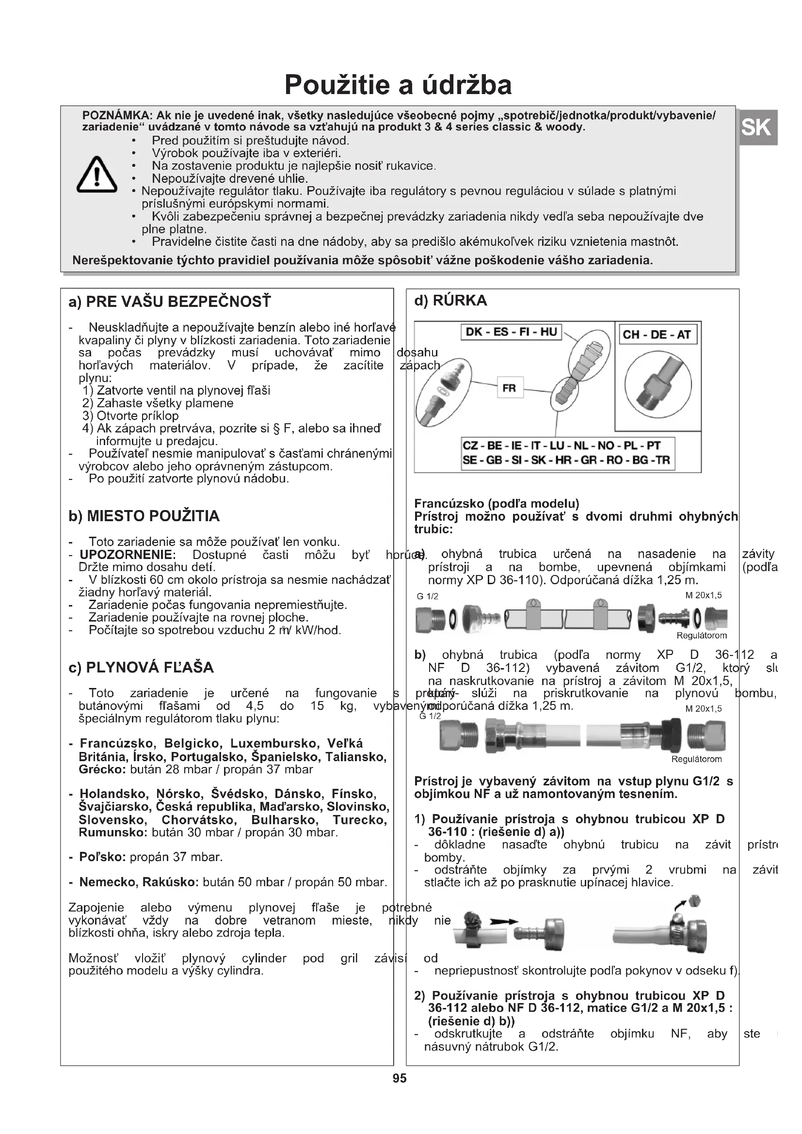 Slovensko, Chorvátsko, Bulharsko, Turecko, Rumunsko: bután 30 mbar / propán 30 mbar. propán 37 mbar. bután 50 mbar / propán 50 mbar. Zapojenie alebo výmenu plynovej fľaše je potrebné vykonávať vždy na dobre vetranom mieste, nikdy nie v blízkostiohňa,iskryalebozdrojatepla. Možnosť vložiť plynový cylinder pod gril závisí od použitéhomodeluavýškycylindra.
