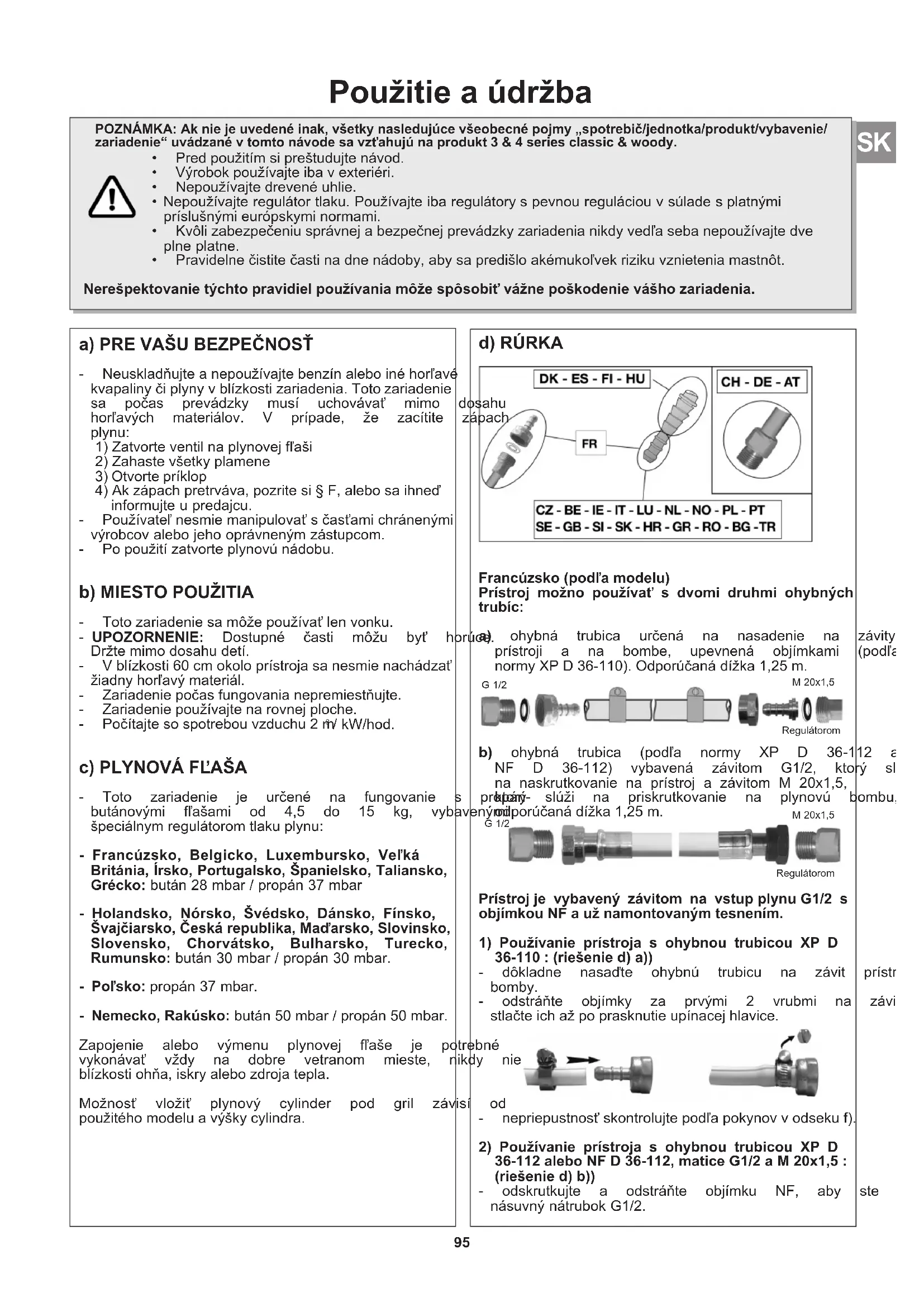 Slovensko, Chorvátsko, Bulharsko, Turecko, Rumunsko: bután 30 mbar / propán 30 mbar. propán 37 mbar. bután 50 mbar / propán 50 mbar. Zapojenie alebo výmenu plynovej fľaše je potrebné vykonávať vždy na dobre vetranom mieste, nikdy nie v blízkostiohňa,iskryalebozdrojatepla. Možnosť vložiť plynový cylinder pod gril závisí od použitéhomodeluavýškycylindra.