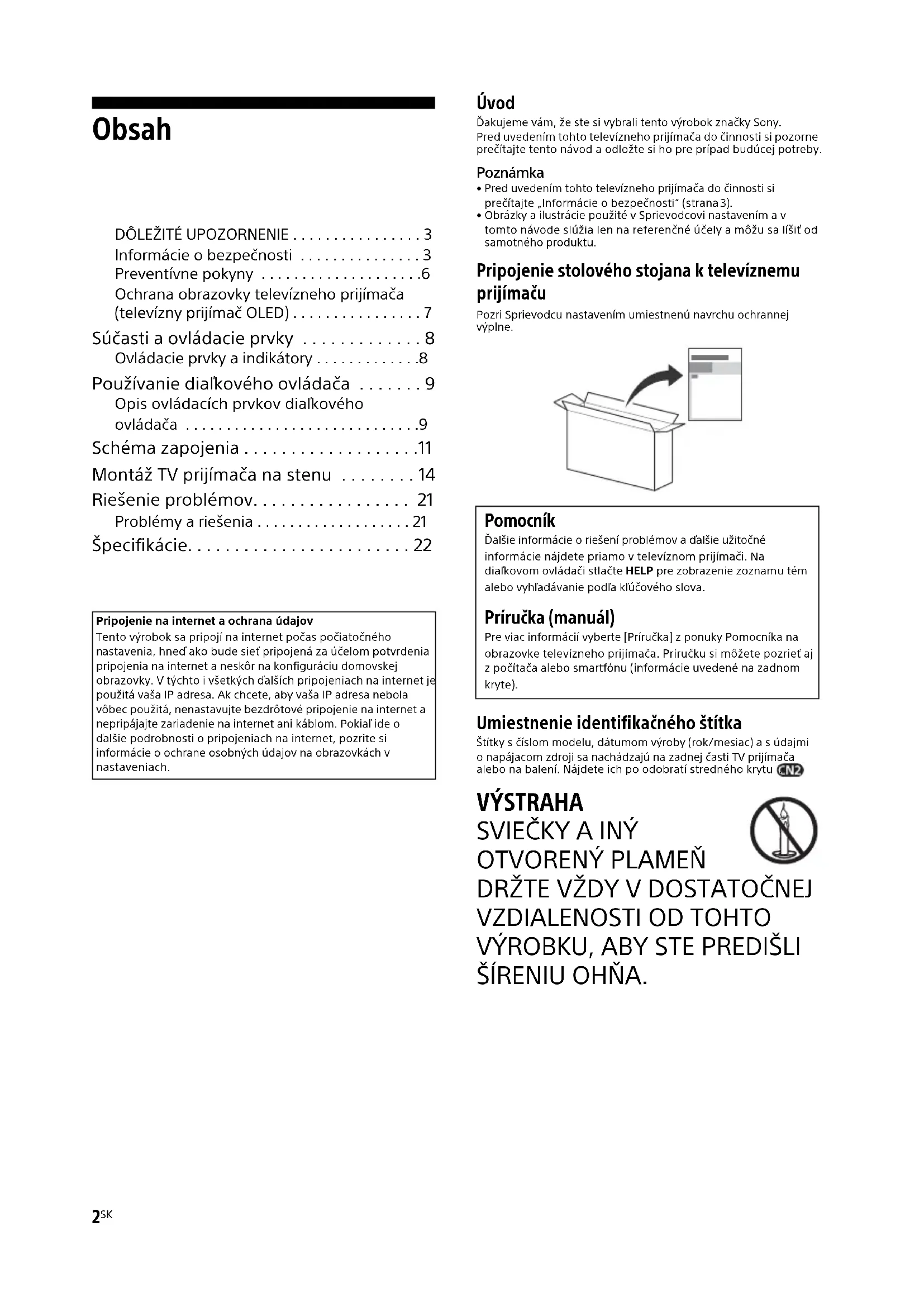 ŠÍRENIU OHŇA. Pripojenie na internet a ochrana údajovTento výrobok sa pripojí na internet počas počiatočného astavenia, hneď ako bude sieť pripojená za účelom potvrdenia pripojenia na internet a neskôr na konfiguráciu domovskej obrazovky. V týchto i všetkých ďalších pripojeniach na internet je použitá vaša IP adresa. Ak chcete, aby vaša IP adresa nebola vôbec použitá, nenastavujte bezdrôtové pripojenie na internet a nepripájajte zariadenie na internet ani káblom. Pokiaľ ide o ďalšie podrobnosti o pripojeniach na internet, pozrite si informácie o ochrane osobných údajov na obrazovkách v nastaveniach. Pomocník Ďalšie informácie o riešení problémov a ďalšie užitočné informácie nájdete priamo v televíznom prijímači. Na diaľkovom ovládači stlačte HELP pre zobrazenie zoznamu tém alebo vyhľadávanie podľa kľúčového slova. Príručka (manuál) Pre viac informácií vyberte [Príručka] z ponuky Pomocníka na obrazovke televízneho prijímača. Príručku si môžete pozrieť aj z počítača alebo smartfónu (informácie uvedené na zadnom kryte).3