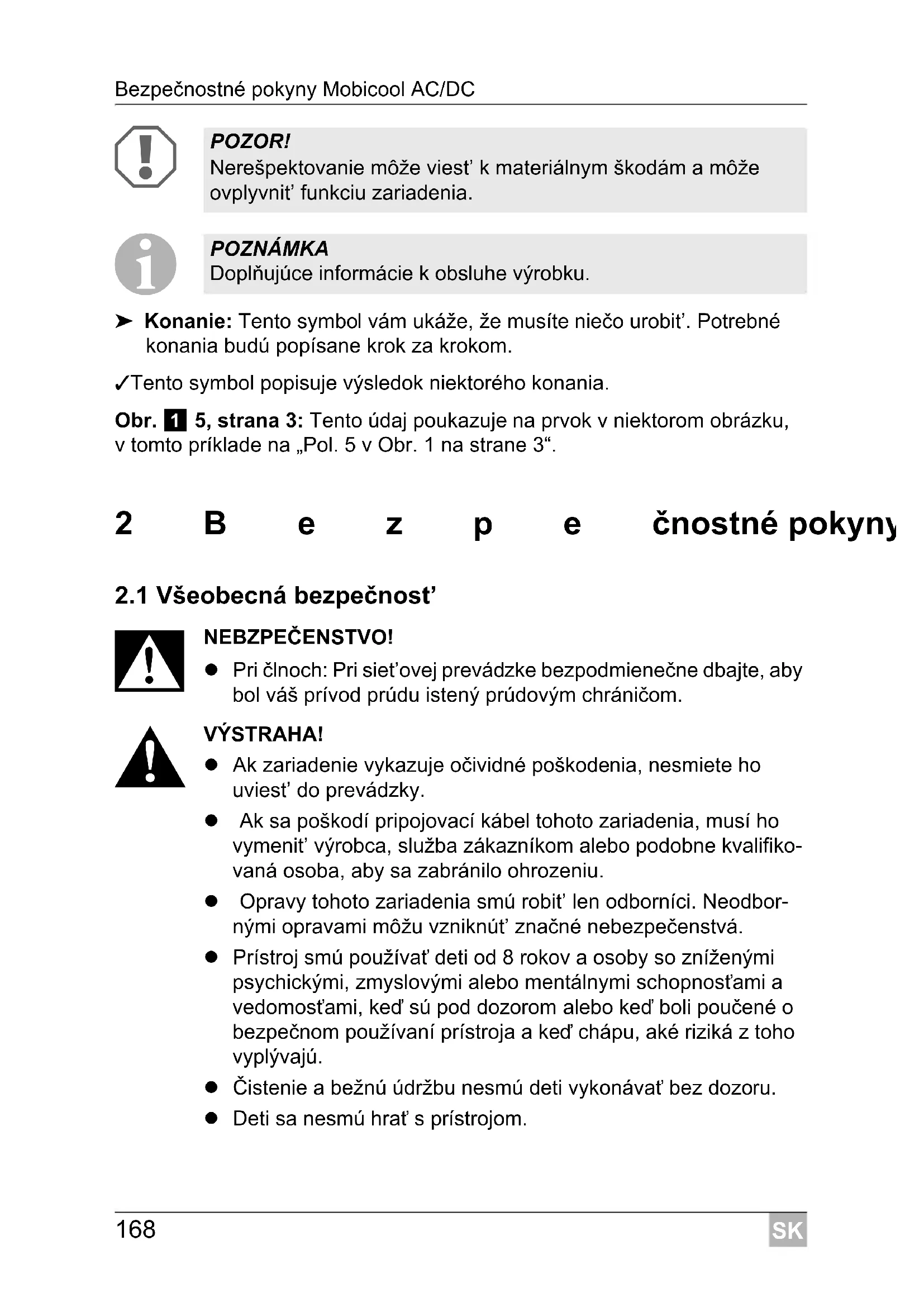 NEBZPEČENSTVO! Bezpečnostný pokyn: Nerešpektovanie vedie k smrti alebo k t’ažkému zraneniu. VÝSTRAHA! Bezpečnostný pokyn: Nerešpektovanie môže viest’ k smrti alebo k t’ažkému zraneniu. UPOZORNENIE! Bezpečnostný pokyn: Nerešpektovanie môže viest’ k zrane- niam.SK Bezpečnostné pokyny Mobicool AC/DC