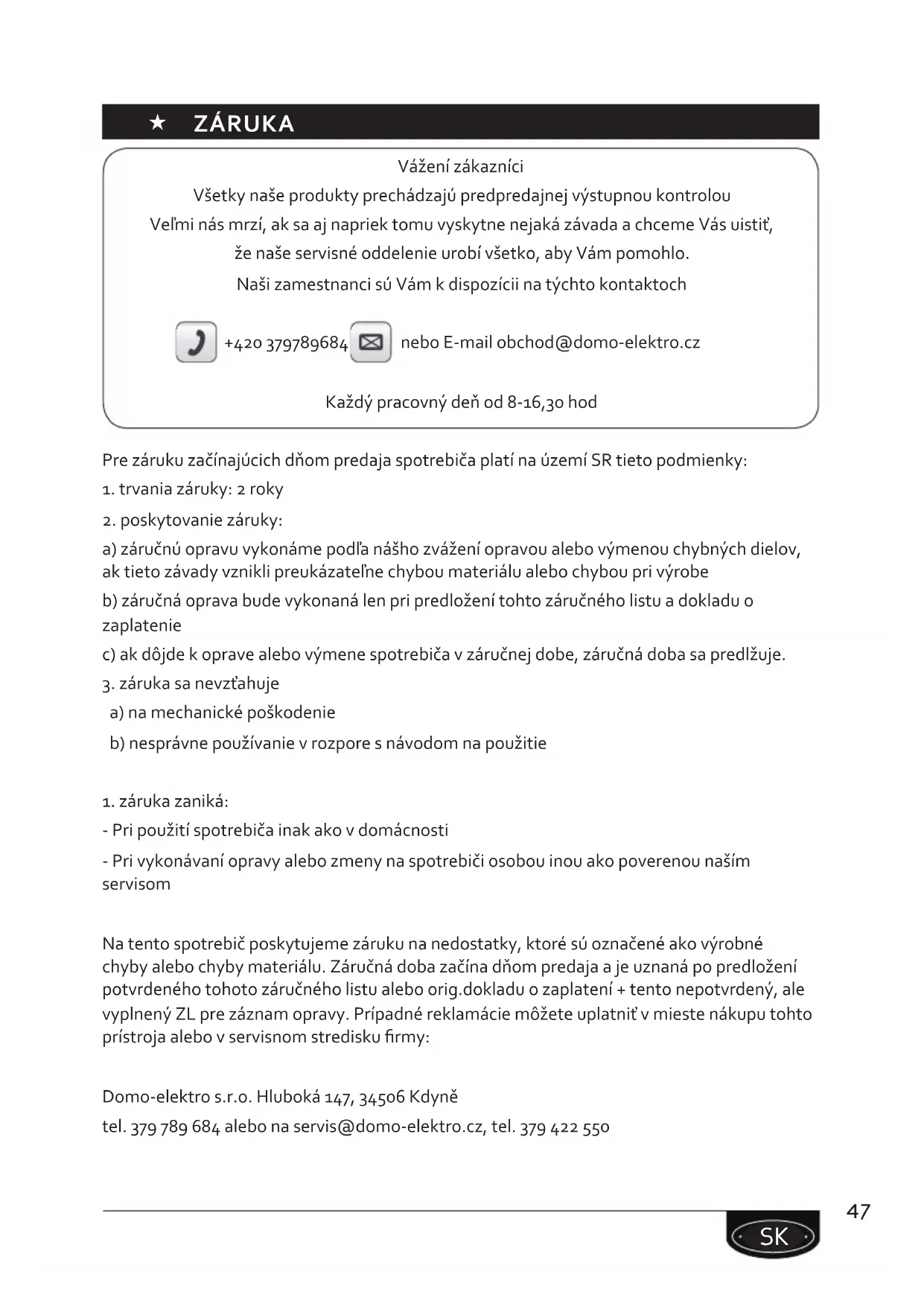« ZÁRUKA Vážení zákazníci Všetky naše produkty prechádzajú predpredajnej výstupnou kontrolou Veľmi nás mrzí, ak sa aj napriek tomu vyskytne nejaká závada a chceme Vás uistiť, že naše servisné oddelenie urobí všetko, aby Vám pomohlo. Naši zamestnanci sú Vám k dispozícii na týchto kontaktoch +420 379789684 nebo E-mail obchod@domo-elektro.cz Každý pracovný deň od 8-16,30 hod Pre záruku začínajúcich dňom predaja spotrebiča platí na území SR tieto podmienky: