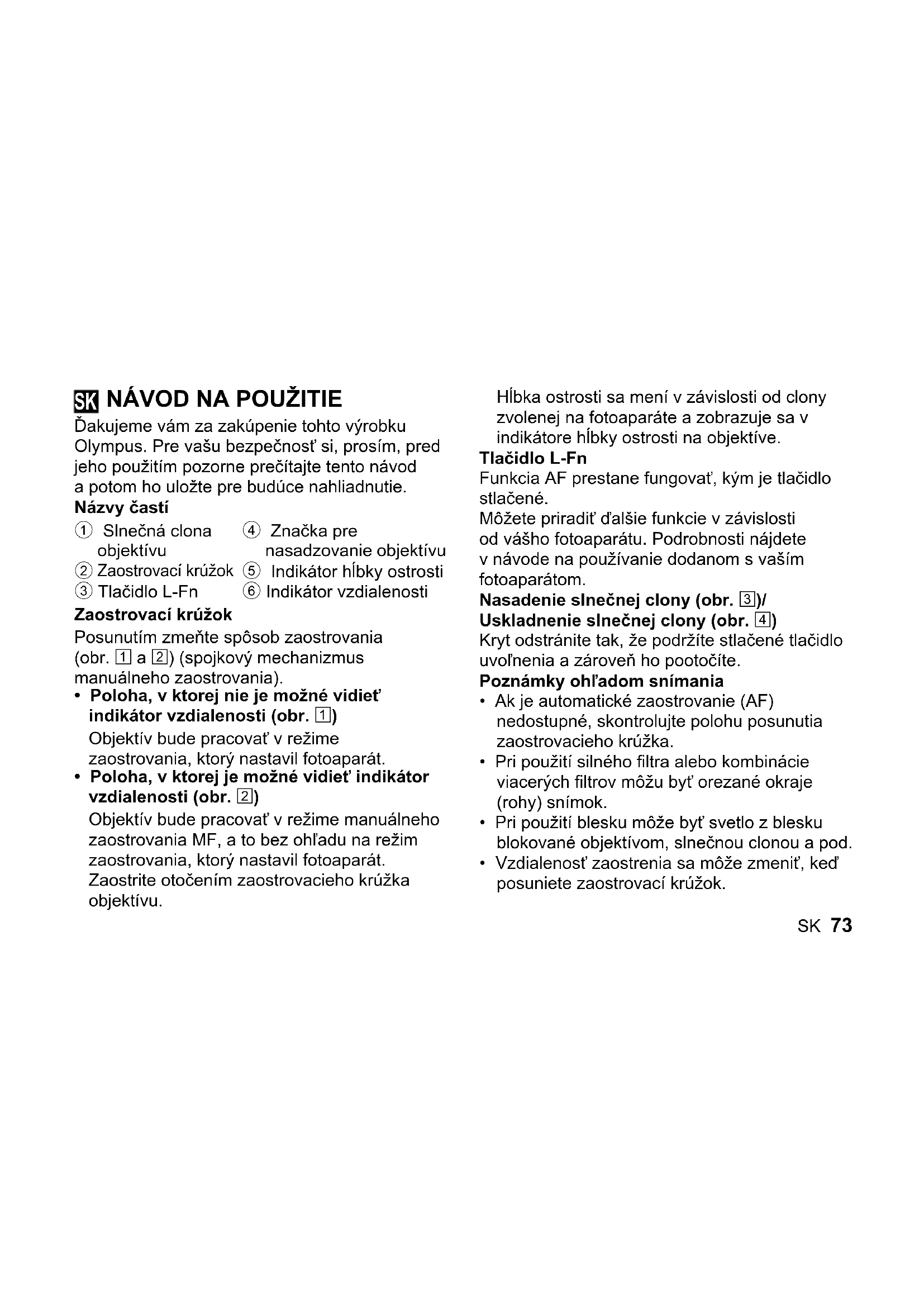 Ďakujeme vám za zakúpenie tohto výrobku Olympus. Pre vašu bezpečnosť si, prosím, pred jeho použitím pozorne prečítajte tento návod a potom ho uložte pre budúce nahliadnutie. Názvy častí 1 Slnečná clona objektívu