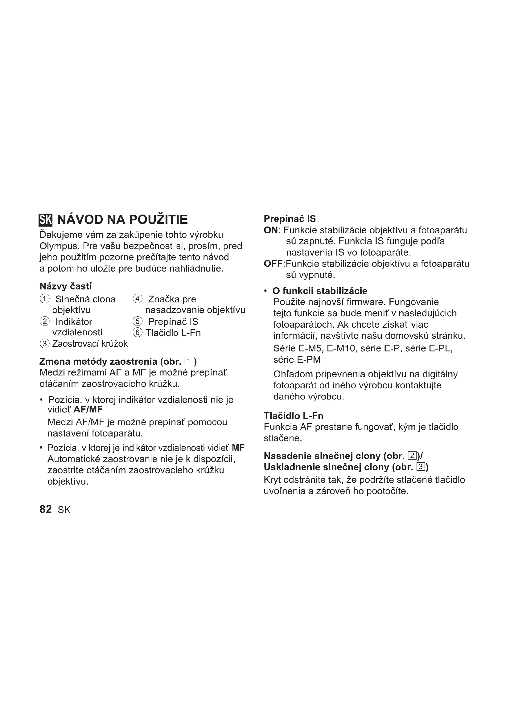Ďakujeme vám za zakúpenie tohto výrobku Olympus. Pre vašu bezpečnosť si, prosím, pred jeho použitím pozorne prečítajte tento návod a potom ho uložte pre budúce nahliadnutie. Názvy častí 1 Slnečná clona objektívu 2 Indikátor vzdialenosti