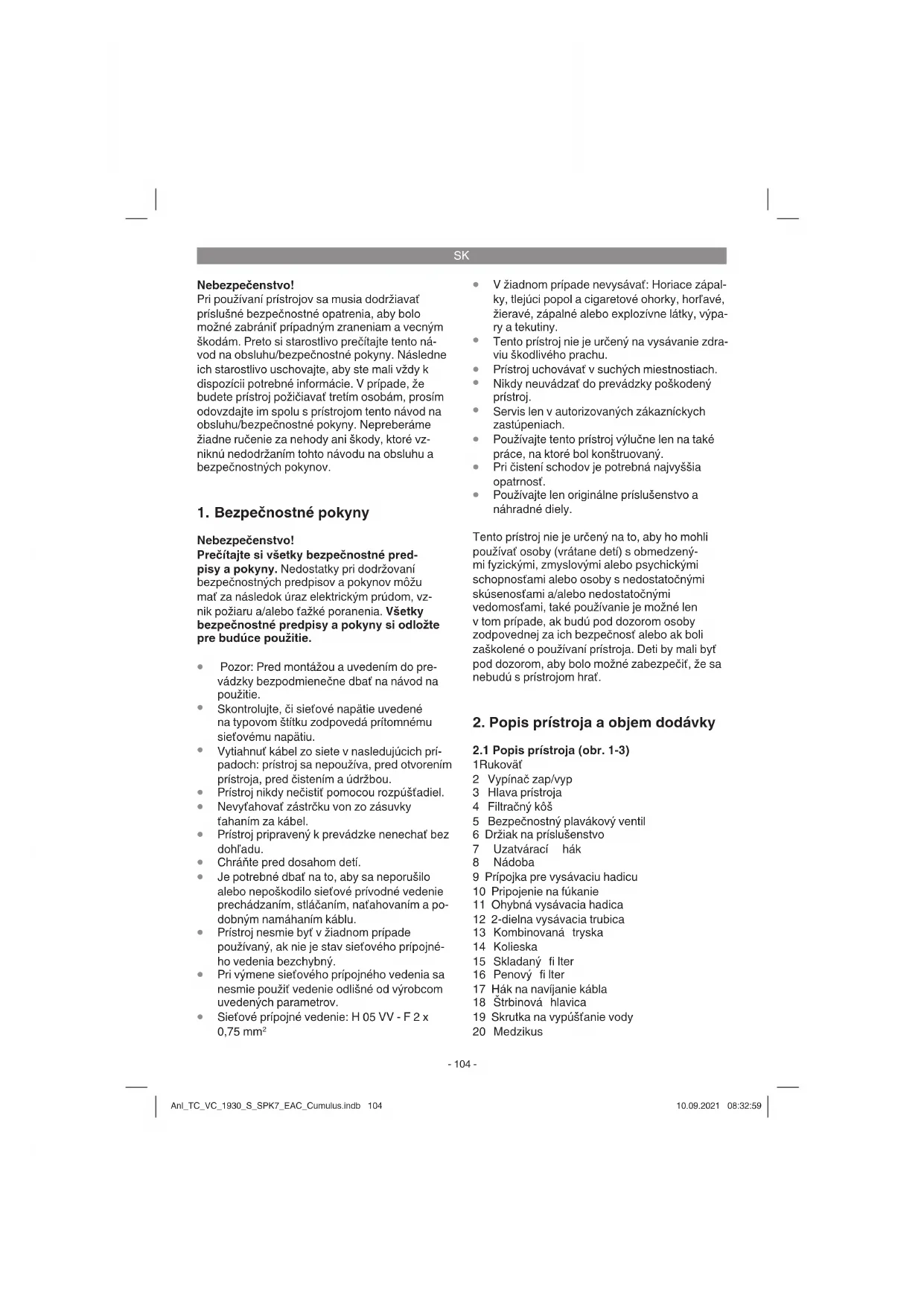 1 Rukoväť 2 Vypínač zap/vyp 3 Hlava prístroja 4 Filtračný kôš 5 Bezpečnostný plavákový ventil 6 Držiak na príslušenstvo 7 Uzatvárací hák 8 Nádoba 9 Prípojka pre vysávaciu hadicu 10 Pripojenie na fúkanie 11 Ohybná vysávacia hadica 12 2-dielna vysávacia trubica 13 Kombinovaná tryska 14 Kolieska 15 Skladaný fi lter 16 Penový fi lter 17 Hák na navíjanie kábla 18 Štrbinová hlavica 19 Skrutka na vypúšťanie vody 20 Medzikus Anl_TC_VC_1930_S_SPK7_EAC_Cumulus.indb 104Anl_TC_VC_1930_S_SPK7_EAC_Cumulus.indb 104 10.09.2021 08:32:5910.09.2021 08:32:59SK