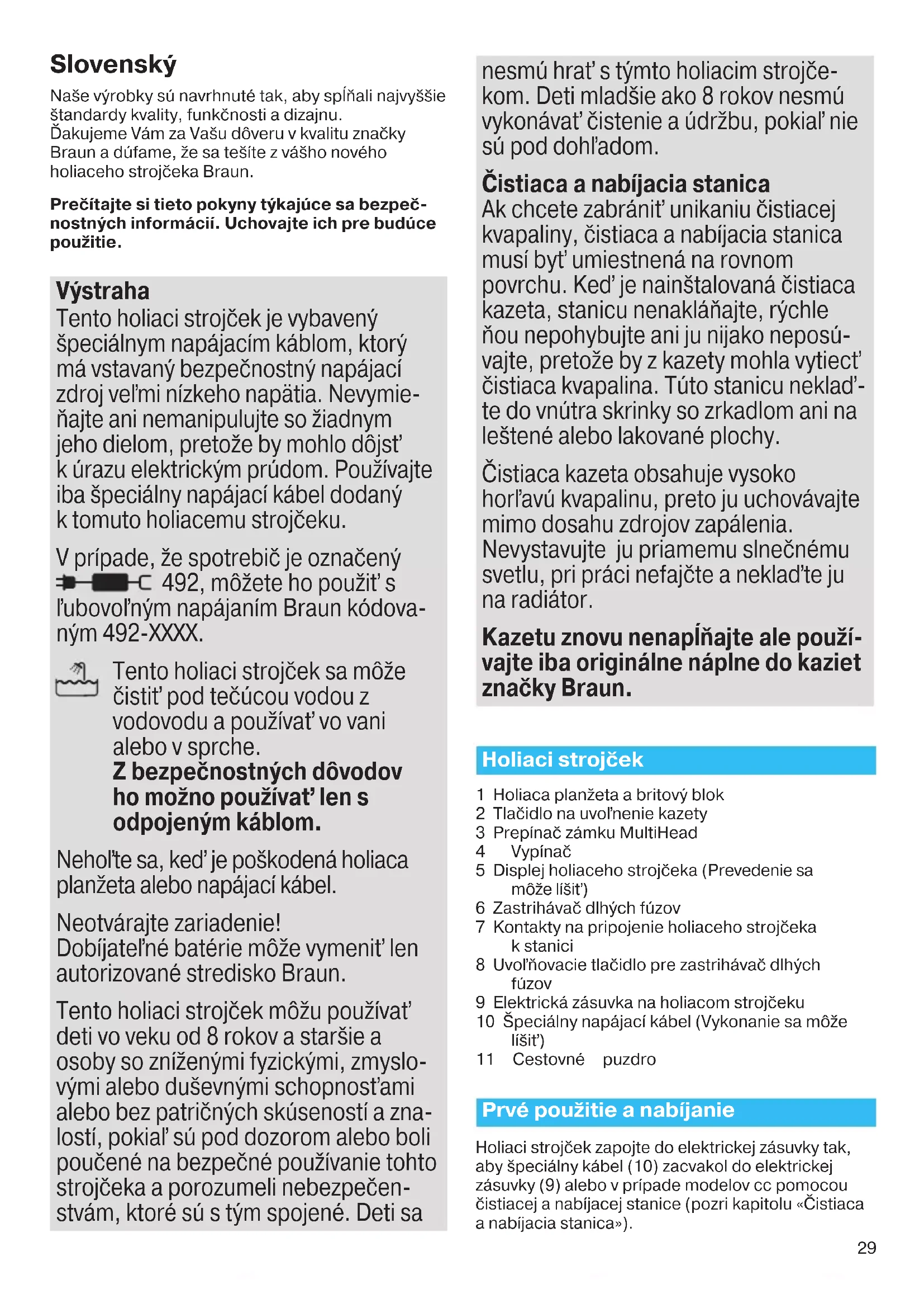 Zvýšená spotřeba čisticí kapaliny. Výpust stanice Clean&Charge je zanesená. – Vyčistěte výpust dřevěným párátkem. – Trubici pravidelně čistěte. 91845280_Series_9-2_CEEMEA_S6-96.indd 2891845280_Series_9-2_CEEMEA_S6-96.indd 28 06.04.18 10:0506.04.18 10:05 Business Use - P&G AUTHORIZED POA-00042214 Rev 001 Effective Date 2018-04-09 Printed 2018-07-25 Page 28 of 9629 Slovensk Naše výrobky sú navrhnuté tak, aby spĺňali najvyššie štandardy kvality, funkčnosti a dizajnu. Ďakujeme Vám za Vašu dôveru v kvalitu značky Braun a dúfame, že sa tešíte z vášho nového holiaceho strojčeka Braun. Prečítajte si tieto pokyny týkajúce sa bezpeč- nostných informácií. Uchovajte ich pre budúce použitie. Výstraha Tento holiaci strojček je vybavený špeciálnym napájacím káblom, ktorý má vstavaný bezpečnostný napájací zdroj veľmi nízkeho napätia. Nevymie- ňajte ani nemanipulujte so žiadnym jeho dielom, pretože by mohlo dôjsť k úrazu elektrickým prúdom. Používajte iba špeciálny napájací kábel dodaný k tomuto holiacemu strojčeku. V prípade, že spotrebič je označený 492, môžete ho použiť s ľubovoľným napájaním Braun kódova- ným 492-XXXX. Tento holiaci strojček sa môže čistiť pod tečúcou vodou z vodovodu a používať vo vani alebo v sprche. Z bezpečnostných dôvodov ho možno používať len s odpojeným káblom. Nehoľte sa, keď je poškodená holiaca planžeta alebo napájací kábel. Neotvárajte zariadenie! Dobíjateľné batérie môže vymeniť len autorizované stredisko Braun. Tento holiaci strojček môžu používať deti vo veku od 8 rokov a staršie a osoby so zníženými fyzickými, zmyslo- vými alebo duševnými schopnosťami alebo bez patričných skúseností a zna- lostí, pokiaľ sú pod dozorom alebo boli poučené na bezpečné používanie tohto strojčeka a porozumeli nebezpečen- stvám, ktoré sú s tým spojené. Deti sa nesmú hrať s týmto holiacim strojče- kom. Deti mladšie ako 8 rokov nesmú vykonávať čistenie a údržbu, pokiaľ nie sú pod dohľadom. Čistiaca a nabíjacia stanica Ak chcete zabrániť unikaniu čistiacej kvapaliny, čistiaca a nabíjacia stanica musí byť umiestnená na rovnom povrchu. Keď je nainštalovaná čistiaca kazeta, stanicu nenakláňajte, rýchle ňou nepohybujte ani ju nijako neposú- vajte, pretože by z kazety mohla vytiecť čistiaca kvapalina. Túto stanicu neklaď- te do vnútra skrinky so zrkadlom ani na leštené alebo lakované plochy. Čistiaca kazeta obsahuje vysoko horľavú kvapalinu, preto ju uchovávajte mimo dosahu zdrojov zapálenia. Nevystavujte ju priamemu slnečnému svetlu, pri práci nefajčte a neklaďte ju na radiátor. Kazetu znovu nenapĺňajte ale použí- vajte iba originálne náplne do kaziet značky Braun. Holiaci strojček 1 Holiaca planžeta a britový blok 2 Tlačidlo na uvoľnenie kazety 3 Prepínač zámku MultiHead 4 Vypínač 5 Displej holiaceho strojčeka (Prevedenie sa môže líšiť) 6 Zastrihávač dlhých fúzov 7 Kontakty na pripojenie holiaceho strojčeka k stanici 8 Uvoľňovacie tlačidlo pre zastrihávač dlhých fúzov 9 Elektrická zásuvka na holiacom strojčeku 10 Špeciálny napájací kábel (Vykonanie sa môže líšiť) 11 Cestovné puzdro Prvé použitie a nabíjanie Holiaci strojček zapojte do elektrickej zásuvky tak, aby špeciálny kábel (10) zacvakol do elektrickej zásuvky (9) alebo v prípade modelov cc pomocou čistiacej a nabíjacej stanice (pozri kapitolu «Čistiaca a nabíjacia stanica»). 91845280_Series_9-2_CEEMEA_S6-96.indd 2991845280_Series_9-2_CEEMEA_S6-96.indd 29 06.04.18 10:0506.04.18 10:05 Business Use - P&G AUTHORIZED POA-00042214 Rev 001 Effective Date 2018-04-09 Printed 2018-07-25 Page 29 of 9630 Nabíjanie a informácie týkajúce sa základnej prevádzky
