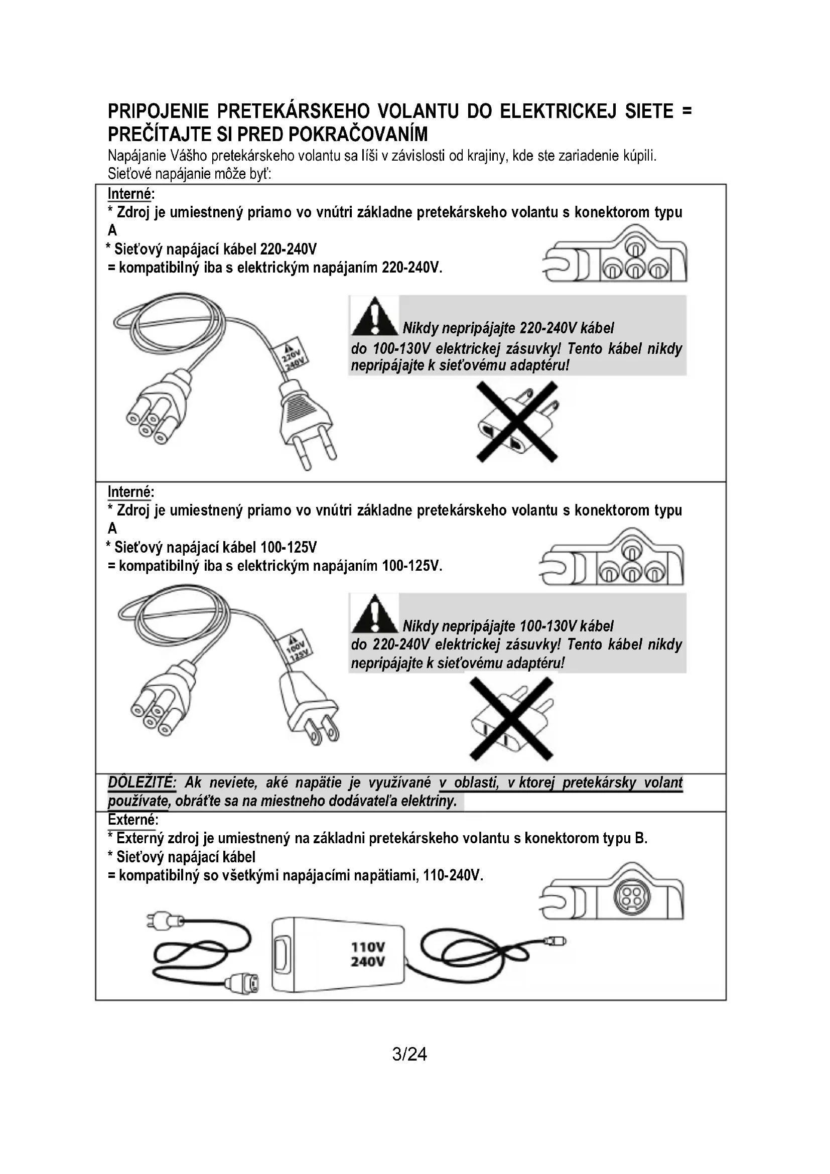 DÔLEŽITÉ: Ak neviete, aké napätie je využívané v oblasti, v ktorej pretekársky volant používate, obráťte sa na miestneho dodávateľa elektriny. Externé: