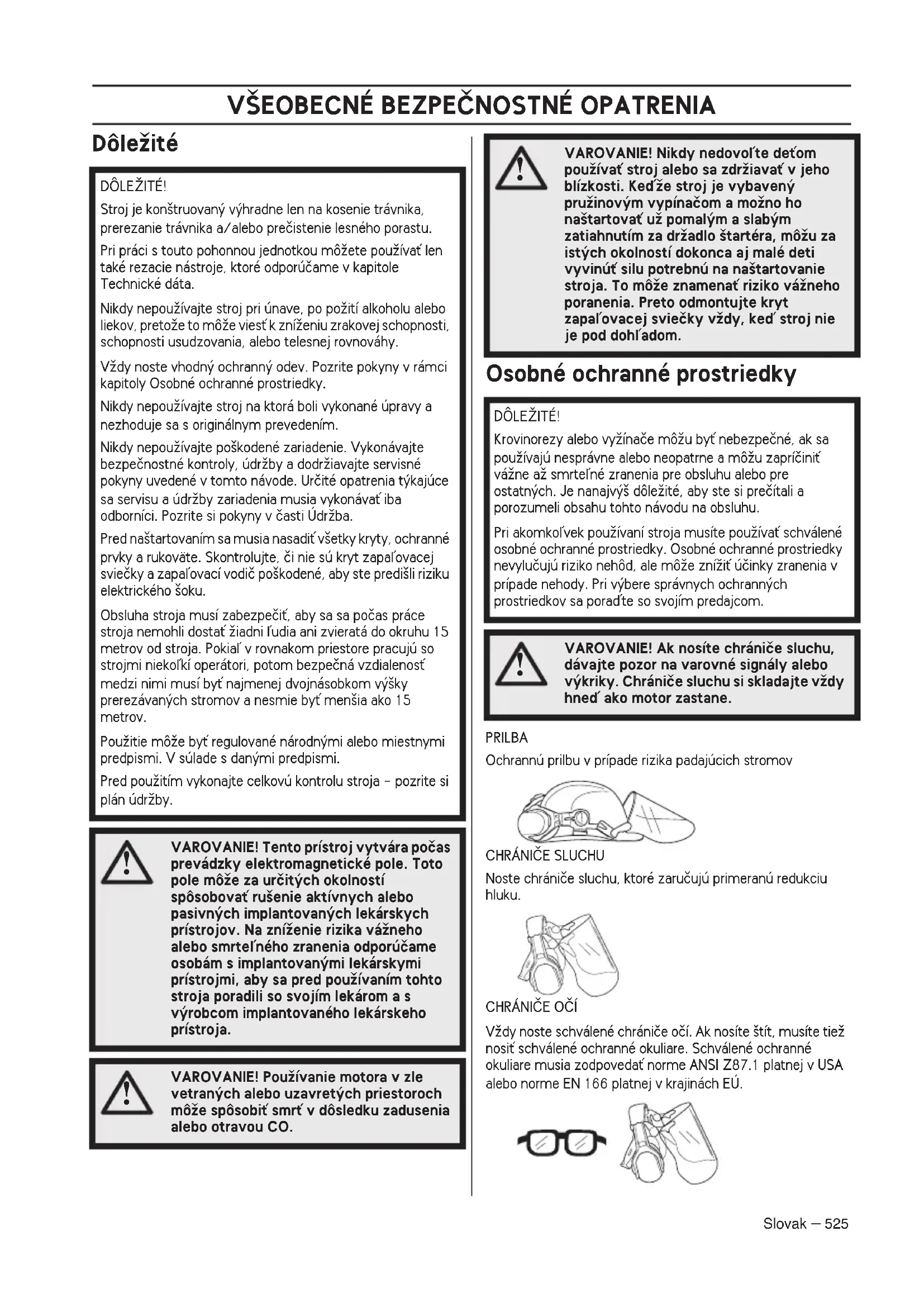 VAROVANIE! Nikdy nedovoºte deÈom pouÏívaÈ stroj alebo sa zdrÏiavaÈ v jeho blízkosti. KeìÏe stroj je vybaven˘ pruÏinov˘m vypínaãom a moÏno ho na‰tartovaÈ uÏ pomal˘m a slab˘m zatiahnutím za drÏadlo ‰tartéra, môÏu za ist˘ch okolností dokonca aj malé deti vyvinúÈ silu potrebnú na na‰tartovanie stroja. To môÏe znamenaÈ riziko váÏneho poranenia. Preto odmontujte kryt zapaºovacej svieãky vÏdy, keì stroj nie je pod dohºadom. DÔLEÎITÉ! Krovinorezy alebo vyÏínaãe môÏu byÈ nebezpeãné, ak sa pouÏívajú nesprávne alebo neopatrne a môÏu zapríãiniÈ váÏne aÏ smrteºné zranenia pre obsluhu alebo pre ostatn˘ch. Je nanajv˘‰ dôleÏité, aby ste si preãítali a porozumeli obsahu tohto návodu na obsluhu. Pri akomkoºvek pouÏívaní stroja musíte pouÏívaÈ schválené osobné ochranné prostriedky. Osobné ochranné prostriedky nevyluãujú riziko nehôd, ale môÏe zníÏiÈ úãinky zranenia v prípade nehody. Pri v˘bere správnych ochrann˘ch prostriedkov sa poraìte so svojím predajcom.