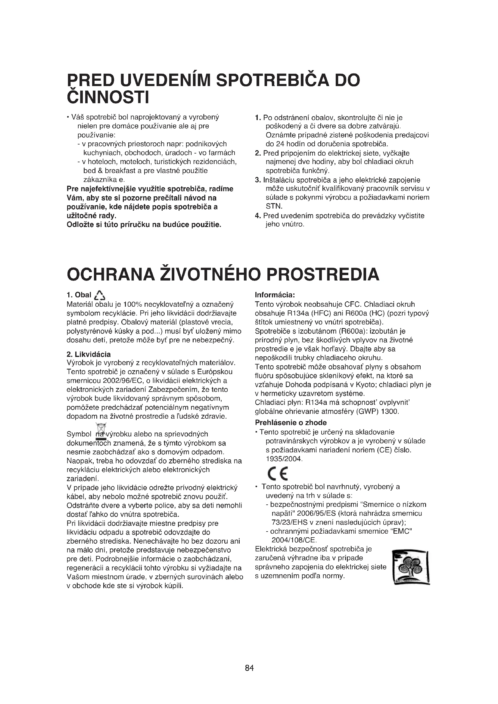 Výrobok je vyrobený z recyklovateľných materiálov. Tento spotrebič je označený v súlade s Európskou smernicou 2002/96/EC, o likvidácii elektrických a elektronických zariadení Zabezpečením, že tento výrobok bude likvidovaný správnym spôsobom, pomôžete predchádzať potenciálnym negatívnym dopadom na životné prostredie a ľudské zdravie. Symbol na výrobku alebo na sprievodných dokumentoch znamená, že s týmto výrobkom sa nesmie zaobchádzať ako s domovým odpadom. Naopak, treba ho odovzdať do zberného strediska na recykláciu elektrických alebo elektronických zariadení. V prípade jeho likvidácie odrežte prívodný elektrický kábel, aby nebolo možné spotrebič znovu použiť. Odstráňte dvere a vyberte police, aby sa deti nemohli dostať ľahko do vnútra spotrebiča. Pri likvidácii dodržiavajte miestne predpisy pre likvidáciu odpadu a spotrebič odovzdajte do zberného strediska. Nenechávajte ho bez dozoru ani na málo dní, pretože predstavuje nebezpečenstvo pre deti. Podrobnejšie informácie o zaobchádzaní, regenerácii a recyklácii tohto výrobku si vyžiadajte na Vašom miestnom úrade, v zberných surovinách alebo v obchode kde ste si výrobok kúpili. Informácia: Tento výrobok neobsahuje CFC. Chladiaci okruh obsahuje R134a (HFC) ani R600a (HC) (pozri typový štítok umiestnený vo vnútri spotrebiča). Spotrebiče s izobutánom (R600a): izobután je prírodný plyn, bez škodlivých vplyvov na životné prostredie e je však horľavý. Dbajte aby sa nepoškodili trubky chladiaceho okruhu. Tento spotrebič môže obsahovať plyny s obsahom fluóru spôsobujúce skleníkový efekt, na ktoré sa vzťahuje Dohoda podpísaná v Kyoto; chladiaci plyn je v hermeticky uzavretom systéme. Chladiaci plyn: R134a má schopnost’ ovplyvnit’ globálne ohrievanie atmosféry (GWP) 1300. Prehlásenie o zhode