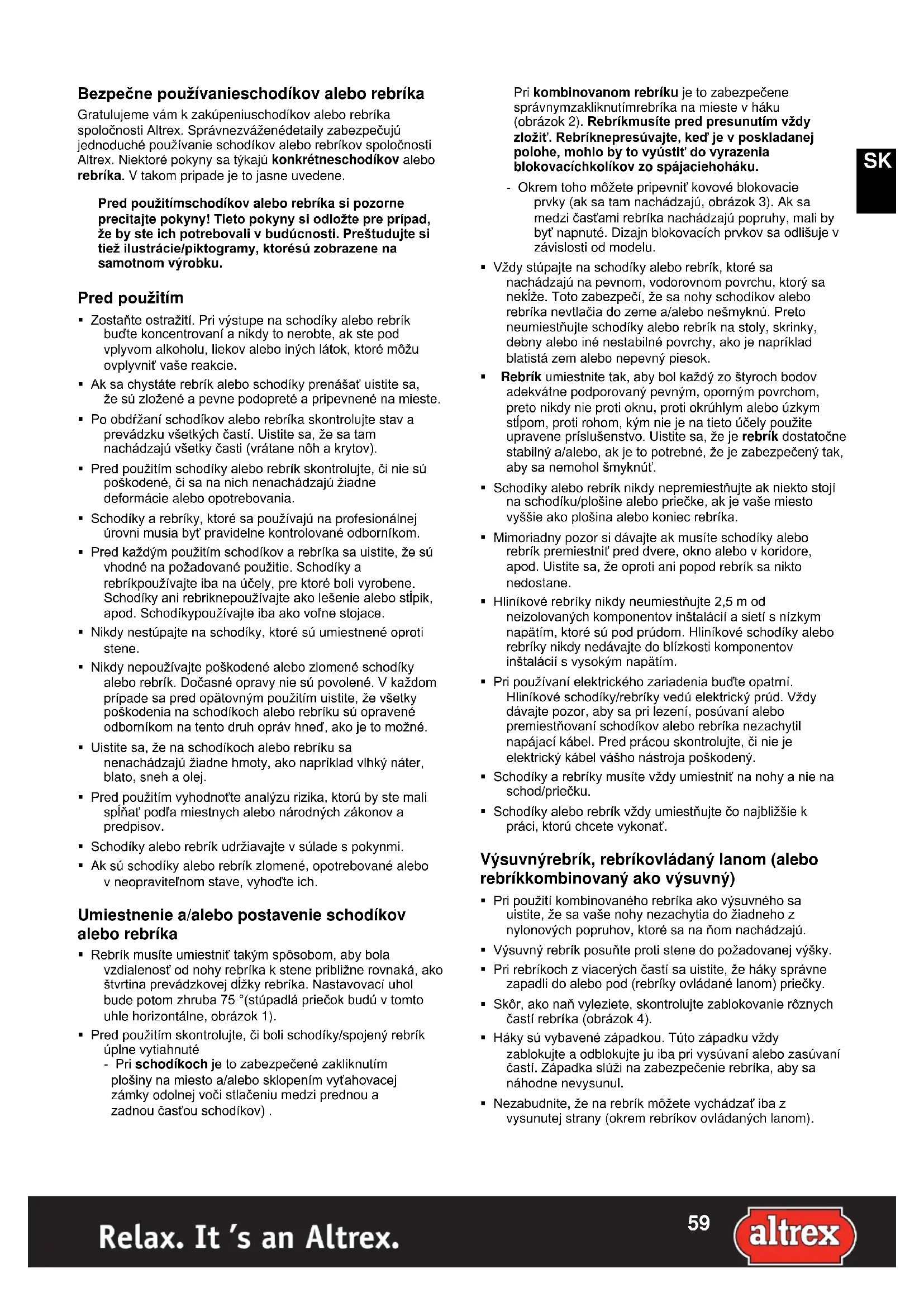Bezpečne pouţívanieschodíkov alebo rebríka Gratulujeme vám k zakúpeniuschodíkov alebo rebríka spoločnosti Altrex. Správnezváženédetaily zabezpečujú jednoduché používanie schodíkov alebo rebríkov spoločnosti Altrex. Niektoré pokyny sa týkajú konkrétneschodíkov alebo rebríka. V takom pripade je to jasne uvedene. Pred pouţitímschodíkov alebo rebríka si pozorne precitajte pokyny! Tieto pokyny si odloţte pre prípad, ţe by ste ich potrebovali v budúcnosti. Preštudujte si tieţ ilustrácie/piktogramy, ktorésú zobrazene na samotnom výrobku. Pred pouţitím Zostaňte ostražití. Pri výstupe na schodíky alebo rebrík buďte koncentrovaní a nikdy to nerobte, ak ste pod vplyvom alkoholu, liekov alebo iných látok, ktoré môžu ovplyvniť vaše reakcie. Ak sa chystáte rebrík alebo schodíky prenášať uistite sa, že sú zložené a pevne podopreté a pripevnené na mieste. Po obdŕžaní schodíkov alebo rebríka skontrolujte stav a prevádzku všetkých častí. Uistite sa, že sa tam nachádzajú všetky časti (vrátane nôh a krytov). Pred použitím schodíky alebo rebrík skontrolujte, či nie sú poškodené, či sa na nich nenachádzajú žiadne deformácie alebo opotrebovania. Schodíky a rebríky, ktoré sa používajú na profesionálnej úrovni musia byť pravidelne kontrolované odborníkom. Pred každým použitím schodíkov a rebríka sa uistite, že sú vhodné na požadované použitie. Schodíky a rebríkpoužívajte iba na účely, pre ktoré boli vyrobene. Schodíky ani rebriknepoužívajte ako lešenie alebo stĺpik, apod. Schodíkypoužívajte iba ako voľne stojace. Nikdy nestúpajte na schodíky, ktoré sú umiestnené oproti stene. Nikdy nepoužívajte poškodené alebo zlomené schodíky alebo rebrík. Dočasné opravy nie sú povolené. V každom prípade sa pred opätovným použitím uistite, že všetky poškodenia na schodíkoch alebo rebríku sú opravené odborníkom na tento druh opráv hneď, ako je to možné. Uistite sa, že na schodíkoch alebo rebríku sa nenachádzajú žiadne hmoty, ako napríklad vlhký náter, blato, sneh a olej. Pred použitím vyhodnoťte analýzu rizika, ktorú by ste mali spĺňať podľa miestnych alebo národných zákonov a predpisov. Schodíky alebo rebrík udržiavajte v súlade s pokynmi. Ak sú schodíky alebo rebrík zlomené, opotrebované alebo v neopraviteľnom stave, vyhoďte ich. Umiestnenie a/alebo postavenie schodíkov alebo rebríka Rebrík musíte umiestniť takým spôsobom, aby bola vzdialenosť od nohy rebríka k stene približne rovnaká, ako štvrtina prevádzkovej dĺžky rebríka. Nastavovací uhol bude potom zhruba 75 °(stúpadlá priečok budú v tomto uhle horizontálne, obrázok 1). Pred použitím skontrolujte, či boli schodíky/spojený rebrík úplne vytiahnuté - Pri schodíkoch je to zabezpečené zakliknutím plošiny na miesto a/alebo sklopením vyťahovacej zámky odolnej voči stlačeniu medzi prednou a zadnou časťou schodíkov) .