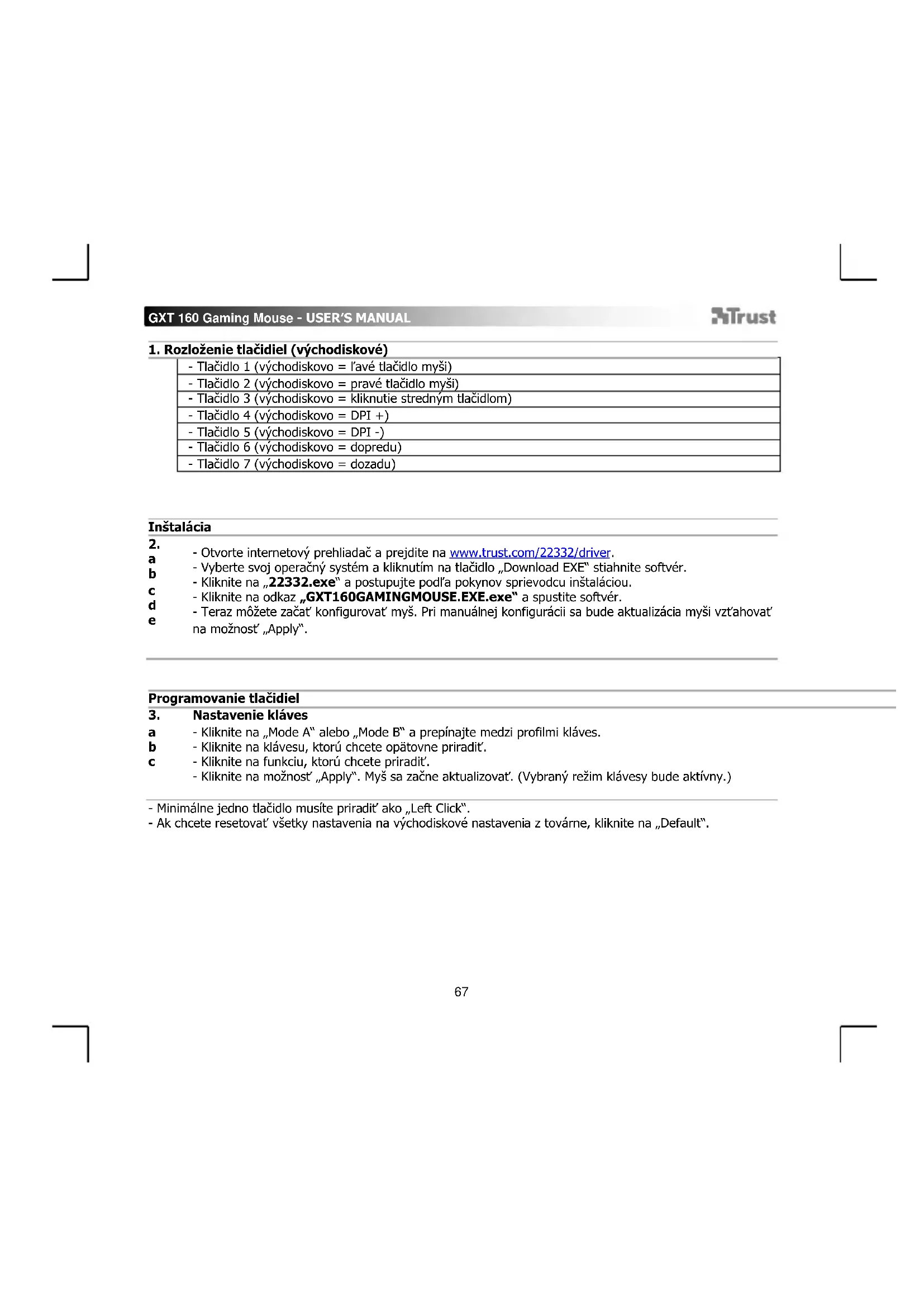 - Otvorte internetový prehliadač a prejdite na www.trust.com/22332/driver. - Vyberte svoj operačný systém a kliknutím na tlačidlo „Download EXE“ stiahnite softvér. - Kliknite na „22332.exe“ a postupujte podľa pokynov sprievodcu inštaláciou. - Kliknite na odkaz „GXT160GAMINGMOUSE.EXE.exe“ a spustite softvér. - Teraz môžete začať konfigurovať myš. Pri manuálnej konfigurácii sa bude aktualizácia myši vzťahovať na možnosť „Apply“.