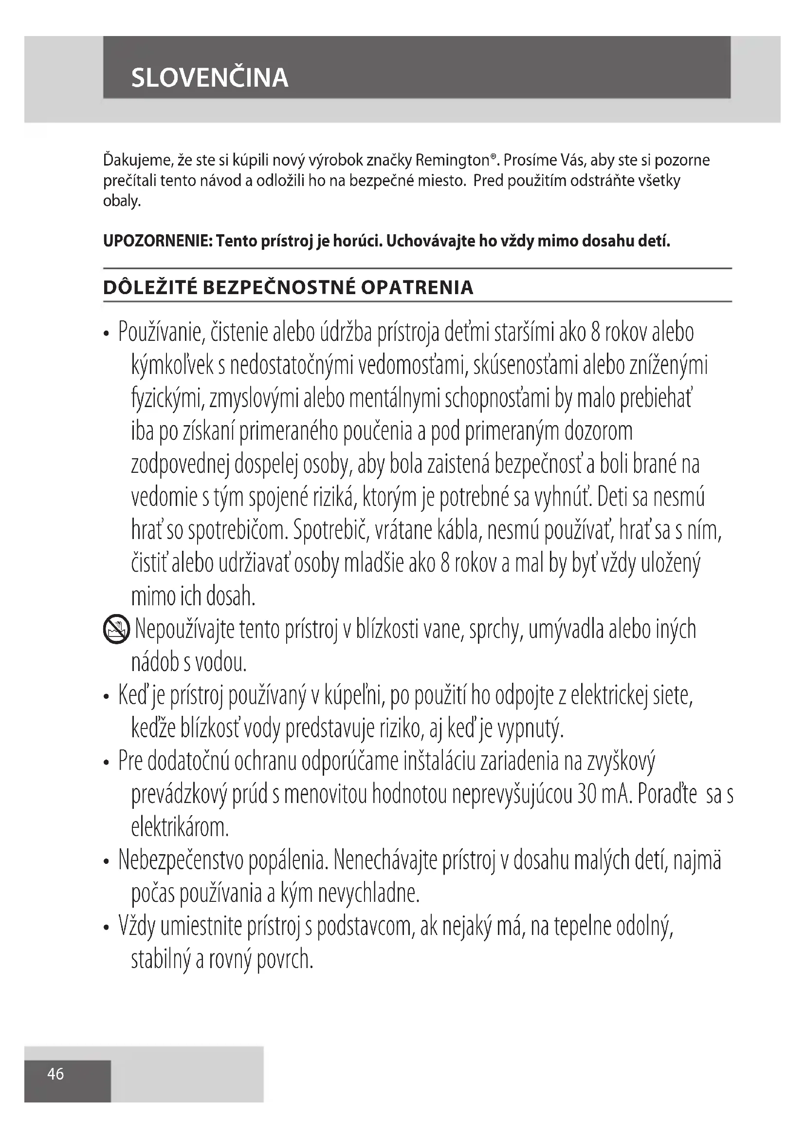 - Ak sa elektrický kábel tohto prístroja poškodí, prestaňte okamžite s jeho používaním a prístroj odovzdajte do najbližšieho servisného strediska Remington® na opravu alebo výmenu, aby ste predišli akémukol'vek riziku.