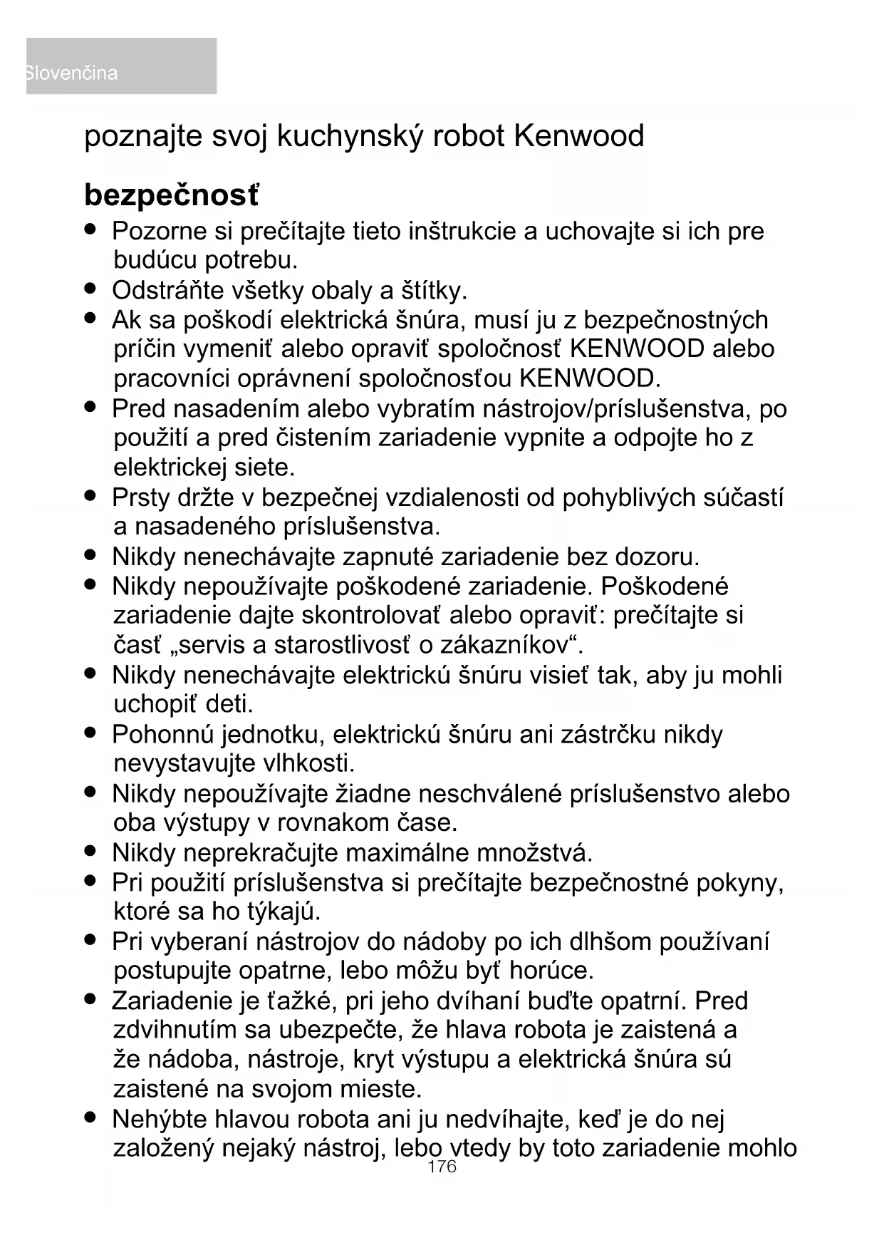 Nehýbte hlavou robota ani ju nedvíhajte, keď je do nej založený nejaký nástroj, lebo vtedy by toto zariadenie mohlo Slovenčina poznajte svoj kuchynský robot Kenwood176 177 stratiť stabilitu.