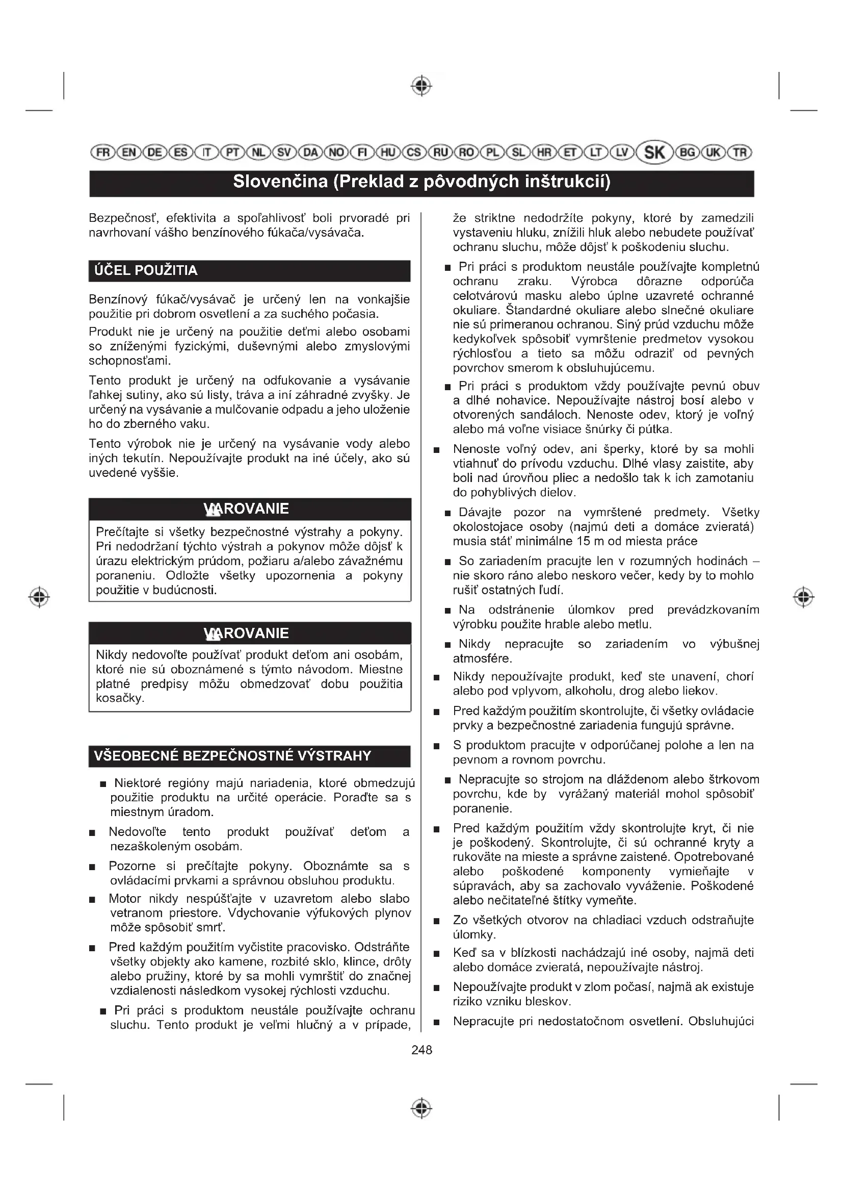 ■ Niektoré regióny majú nariadenia, ktoré obmedzujú použitie produktu na určité operácie. Poraďte sa s miestnym úradom. ■ Nedovoľte tento produkt používať deťom a nezaškoleným osobám. ■ Pozorne si prečítajte pokyny. Oboznámte sa s ovládacími prvkami a správnou obsluhou produktu. ■ Motor nikdy nespúšťajte v uzavretom alebo slabo vetranom priestore. Vdychovanie výfukových plynov môže spôsobiť smrť. ■ Pred každým použitím vyčistite pracovisko. Odstráňte všetky objekty ako kamene, rozbité sklo, klince, drôty alebo pružiny, ktoré by sa mohli vymrštiť do značnej vzdialenosti následkom vysokej rýchlosti vzduchu. ■ Pri práci s produktom neustále používajte ochranu sluchu. Tento produkt je veľmi hlučný a v prípade, že striktne nedodržíte pokyny, ktoré by zamedzili vystaveniu hluku, znížili hluk alebo nebudete používať ochranu sluchu, môže dôjsť k poškodeniu sluchu. ■ Pri práci s produktom neustále používajte kompletnú ochranu zraku. Výrobca dôrazne odporúča celotvárovú masku alebo úplne uzavreté ochranné okuliare. Štandardné okuliare alebo slnečné okuliare nie sú primeranou ochranou. Siný prúd vzduchu môže kedykoľvek spôsobiť vymrštenie predmetov vysokou rýchlosťou a tieto sa môžu odraziť od pevných povrchov smerom k obsluhujúcemu. ■ Pri práci s produktom vždy používajte pevnú obuv a dlhé nohavice. Nepoužívajte nástroj bosí alebo v otvorených sandáloch. Nenoste odev, ktorý je voľný alebo má voľne visiace šnúrky či pútka. ■ Nenoste voľný odev, ani šperky, ktoré by sa mohli vtiahnuť do prívodu vzduchu. Dlhé vlasy zaistite, aby boli nad úrovňou pliec a nedošlo tak k ich zamotaniu do pohyblivých dielov. ■ Dávajte pozor na vymrštené predmety. Všetky okolostojace osoby (najmú deti a domáce zvieratá) musia stáť minimálne 15 m od miesta práce ■ So zariadením pracujte len v rozumných hodinách – nie skoro ráno alebo neskoro večer, kedy by to mohlo rušiť ostatných ľudí. ■ Na odstránenie úlomkov pred prevádzkovaním výrobku použite hrable alebo metlu. ■ Nikdy nepracujte so zariadením vo výbušnej atmosfére. ■ Nikdy nepoužívajte produkt, keď ste unavení, chorí alebo pod vplyvom, alkoholu, drog alebo liekov. ■ Pred každým použitím skontrolujte, či všetky ovládacie prvky a bezpečnostné zariadenia fungujú správne. ■ S produktom pracujte v odporúčanej polohe a len na pevnom a rovnom povrchu. ■ Nepracujte so strojom na dláždenom alebo štrkovom povrchu, kde by vyrážaný materiál mohol spôsobiť poranenie. ■ Pred každým použitím vždy skontrolujte kryt, či nie je poškodený. Skontrolujte, či sú ochranné kryty a rukoväte na mieste a správne zaistené. Opotrebované alebo poškodené komponenty vymieňajte v súpravách, aby sa zachovalo vyváženie. Poškodené alebo nečitateľné štítky vymeňte. ■ Zo všetkých otvorov na chladiaci vzduch odstraňujte úlomky. ■ Keď sa v blízkosti nachádzajú iné osoby, najmä deti alebo domáce zvieratá, nepoužívajte nástroj. ■ Nepoužívajte produkt v zlom počasí, najmä ak existuje riziko vzniku bleskov. ■ Nepracujte pri nedostatočnom osvetlení. Obsluhujúci249 Slovenčina (Preklad z pôvodných inštrukcií) musí mať jasný výhľad na pracovný priestor, aby mohol identifikovať potenciálne nebezpečenstvo. ■ Pri používaní podobných nástrojov v blízkosti sa zvyšuje riziko poranenia sluchu a potenciál pre ostatné osoby, ktoré vstúpia do pracovného priestoru. ■ Na svahoch vždy dbajte na pevnú oporu nôh. Choďte krokom, nikdy nebežte. ■ Neustále zachovávajte pevnú oporu nôh a rovnováhu. Nepreceňujte sa. Preceňovanie sa môže spôsobiť stratu rovnováhy. ■ Dávajte pozor, sa dovnútra podávacej komory, vyprázdňovacieho žľabu alebo do blízkosti akéhokoľvek pohybujúceho sa dielu, nedostali ruky alebo akékoľvek iné časti tela či odevu. ■ Nikdy nepracujte so zariadením, ktoré má poškodené ochranné vodidlá alebo kryty alebo nemá nasadené bezpečnostné zariadenia, napríklad zberač sutiny. ■ Zariadenie žiadnym spôsobom neupravujte ani nepoužívajte diely či príslušenstvo, ktoré neodporúča výrobca. VAROVANIE Pred používaním tohto výrobku v režime vysávača musíte spolu zložiť hornú a spodnú vysávaciu trubicu. Toto zloženine sa vykonáva iba jedenkrát. Nikdy nepracujte s vysávačom len s nasadenou hornou nasávacou trubicou. Pri nedodržaní tohto varovania výrazne vzrastá riziko osobného poranenia. VAROVANIE Ak produkt spadne, utrpí silný náraz alebo začne neštandardne vibrovať, okamžite ho zastavte s skontrolujte, či nedošlo k poškodeniu alebo zistite príčinu vibrácií Akékoľvek poškodenie sa musí náležite opraviť alebo vymeniť v autorizovanom servisnom centre. ■ Nedotýkajte sa priestoru okolo výfuku alebo valca výrobku, tieto časti sa počas prevádzky silne zahrievajú. ■ Pred doplnením paliva zastavte motor a výrobok nechajte vychladnúť. ■ Ak potrebujete doplniť alebo namiešať palivo, zvoľte dobre vetraný priestor v dostatočnej vzdialenosti od zdrojov zapálenia, ako sú iskry alebo plamene, a horľavých materiálov. ■ Pri miešaním paliva alebo plnení palivovej nádrže nefajčite. ■ Palivo miešajte a skladujte v nádobe určenej na palivo. Pre prípad vznietenia paliva majte v blízkosti pripravený vhodný typ hasiaceho prístroja. ■ Nezabudnite znovu pevne nasadiť uzáver palivovej nádrže pred naštartovaním motora. ■ Akýkoľvek rozliaty benzín ihneď utrite. Pred spustením motora sa presuňte 9 m (30 stôp) od miesta na dopĺňanie paliva. ■ Aby ste znížili riziko poranenia spojené s kontaktom s otáčajúcimi sa časťami, vždy motor zastavte a odpojte manžetu zapaľovacej sviečky. Uistite sa, že sa všetky pohyblivé diely úplne zastavili pred: ● ponecha