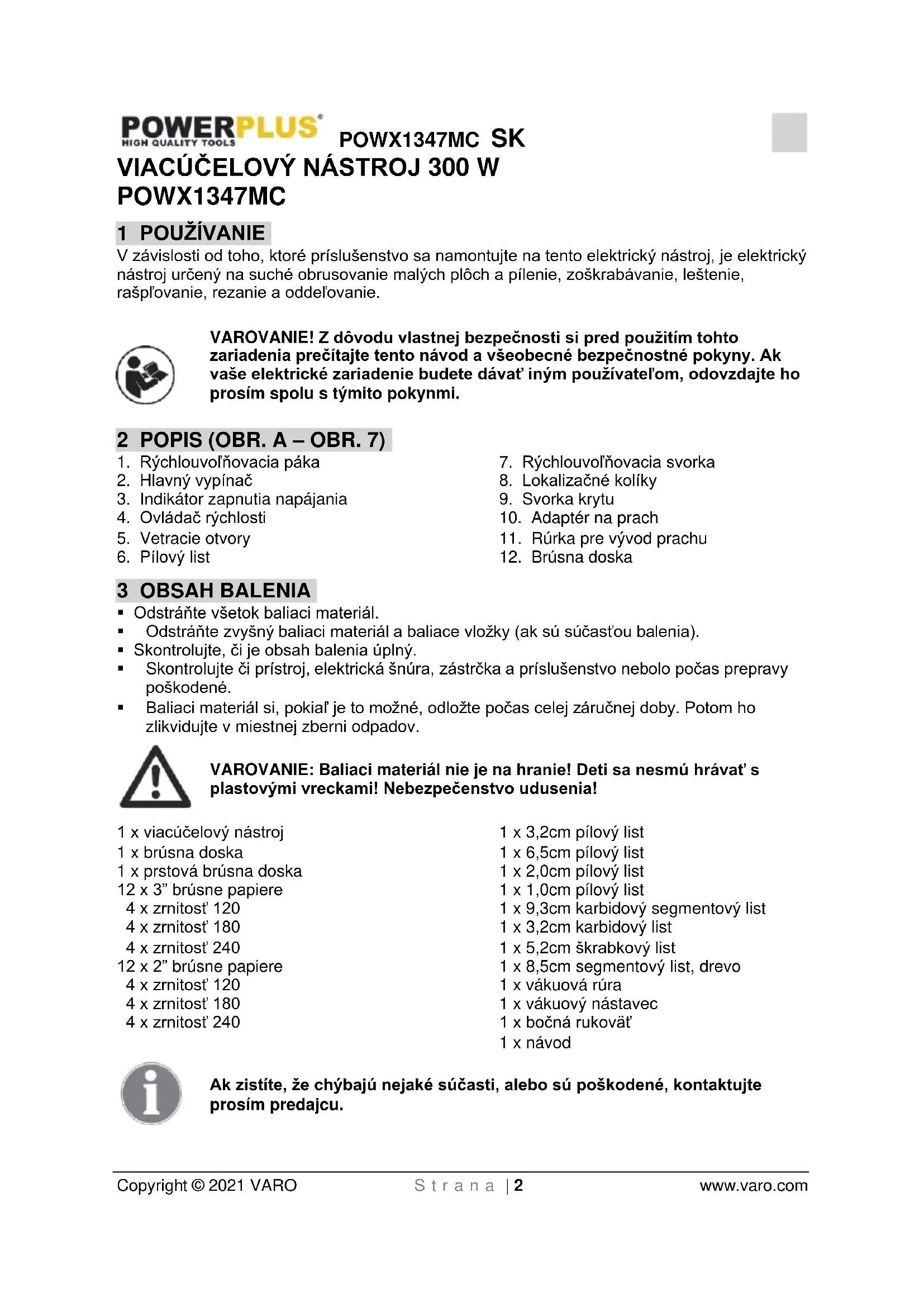 VARO N.V. -- Vic. Van Rompuy N.V. Joseph Van Instraat 9 - BE2500 Lier - BELGICKO vyhlasuje, že výrobok: Viacúčelový nástroj obchodná známka: POWERplus model: POWX1347MC je v súlade so základnými požiadavkami a inými relevantnými ustanoveniami príslušných európskych smerníc, na základe uplatnenia európskych harmonizovaných noriem. V prípade akýchkoľvek neoprávnených úprav tohto zariadenia stráca toto vyhlásenie svoju platnosť. Európske smernice (vrátane ich prípadných novelizácií do dátumu podpisu): 2011/65/EU 2006/42/EC 2014/30/EU Európske harmonizované normy (vrátane ich prípadných novelizácií do dátumu podpisu): EN62841-1 : 2015 EN62841-2-4 : 2014 EN55014-1 : 2017 EN55014-2 : 2015 EN61000-3-2 : 2014 EN61000-3-3 : 2013 Uchovávateľ technickej dokumentácie: Philippe Vankerkhove, VARO – Vic. Van Rompuy N.V. Dolu podpísaný koná v mene výkonného riaditeľa spoločnosti, Ludo Mertens Regulačné záležitosti – Compliance Manager 10/03/2021, Lier - BelgiumPOWX1347MC SL Avtorske pravice © 2021 VARO Stran | 1 www.varo.com 1 UPORABA ....................................................................................... 2
