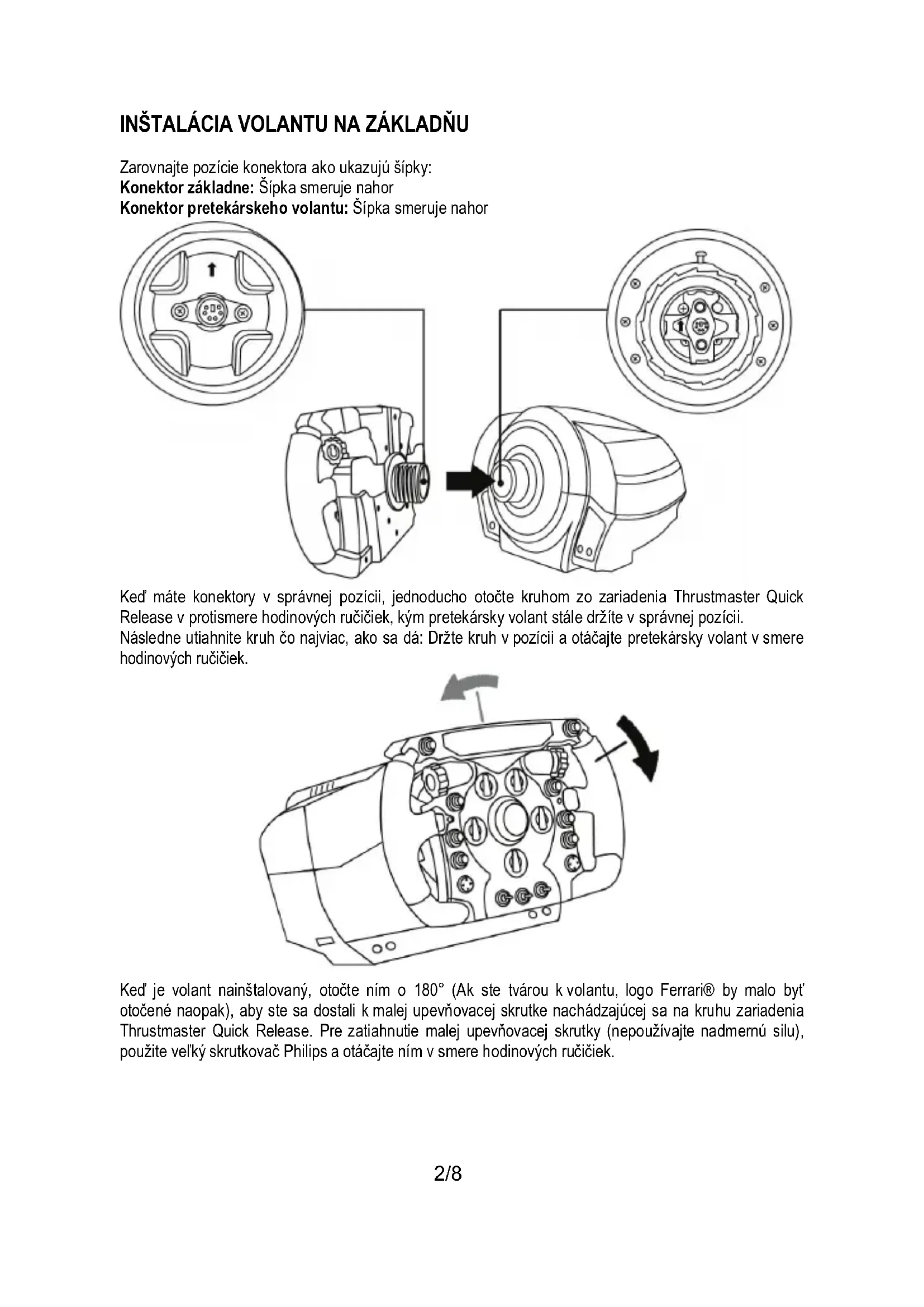 Návod na použitie2/8 INŠTALÁCIA VOLANTU NA ZÁKLADŇU Zarovnajte pozície konektora ako ukazujú šípky: Konektor základne: Šípka smeruje nahor Konektor pretekárskeho volantu: Šípka smeruje nahor Keď máte konektory v správnej pozícii, jednoducho otočte kruhom zo zariadenia Thrustmaster Quick Release v protismere hodinových ručičiek, kým pretekársky volant stále držíte v správnej pozícii. Následne utiahnite kruh čo najviac, ako sa dá: Držte kruh v pozícii a otáčajte pretekársky volant v smere hodinových ručičiek. Keď je volant nainštalovaný, otočte ním o 180° (Ak ste tvárou k volantu, logo Ferrari® by malo byť otočené naopak), aby ste sa dostali k malej upevňovacej skrutke nachádzajúcej sa na kruhu zariadenia Thrustmaster Quick Release. Pre zatiahnutie malej upevňovacej skrutky (nepoužívajte nadmernú silu), použite veľký skrutkovač Philips a otáčajte ním v smere hodinových ručičiek.3/8