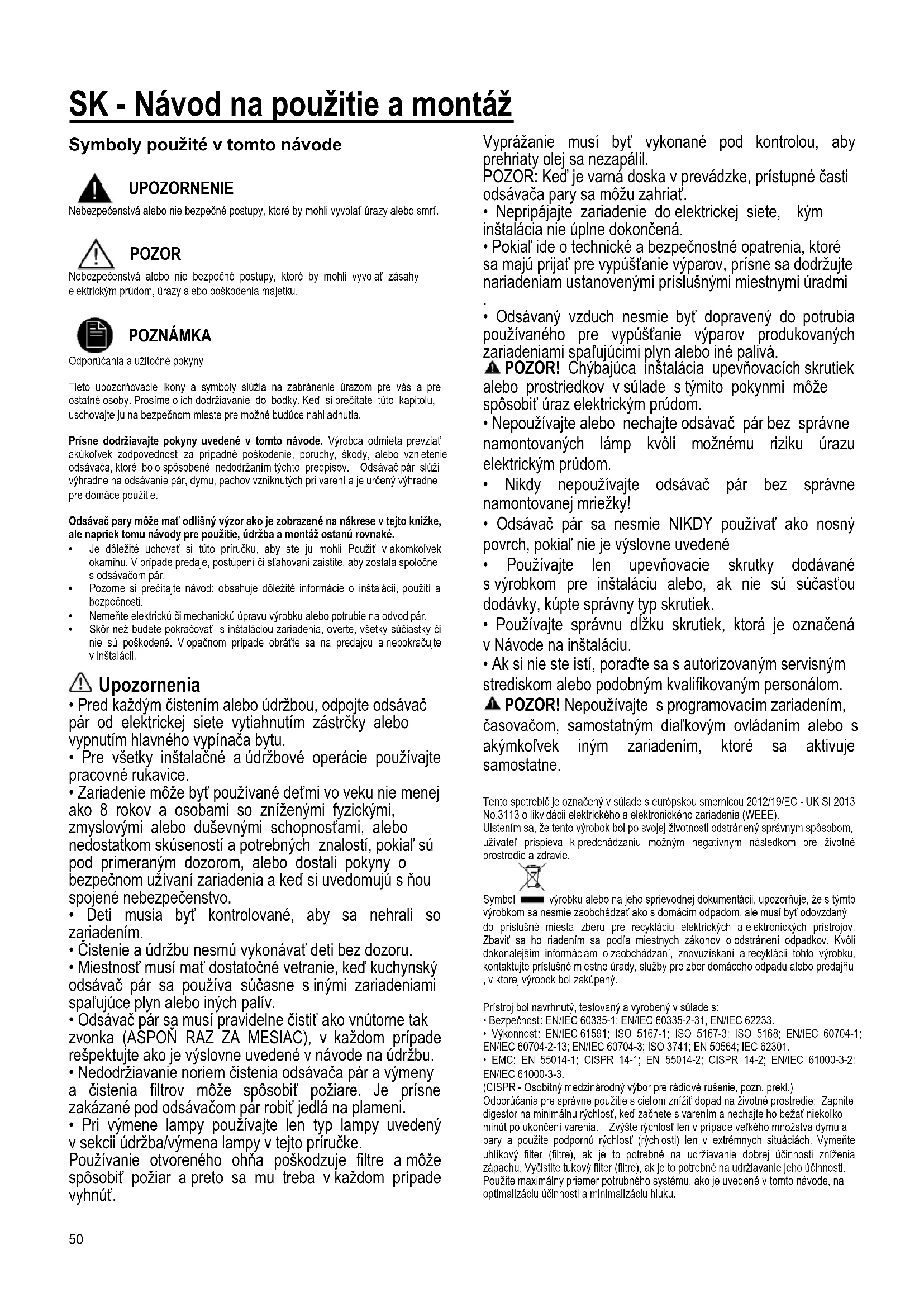POZNÁMKA Odporúčania a užitočné pokyny Tieto upozorňovacie ikony a symboly slúžia na zabránenie úrazom pre vás a pre ostatné osoby. Prosíme o ich dodržiavanie do bodky. Keď si prečítate túto kapitolu, uschovajte ju na bezpečnom mieste pre možné budúce nahliadnutia. Prísne dodržiavajte pokyny uvedené v tomto návode. Výrobca odmieta prevziať akúkoľvek zodpovednosť za prípadné poškodenie, poruchy, škody, alebo vznietenie odsávača, ktoré bolo spôsobené nedodržaním týchto predpisov. Odsávač pár slúži výhradne na odsávanie pár, dymu, pachov vzniknutých pri varení a je určený výhradne pre domáce použitie. Odsávač pary môže mať odlišný výzor ako je zobrazené na nákrese v tejto knižke, ale napriek tomu návody pre použitie, údržba a montáž ostanú rovnaké.