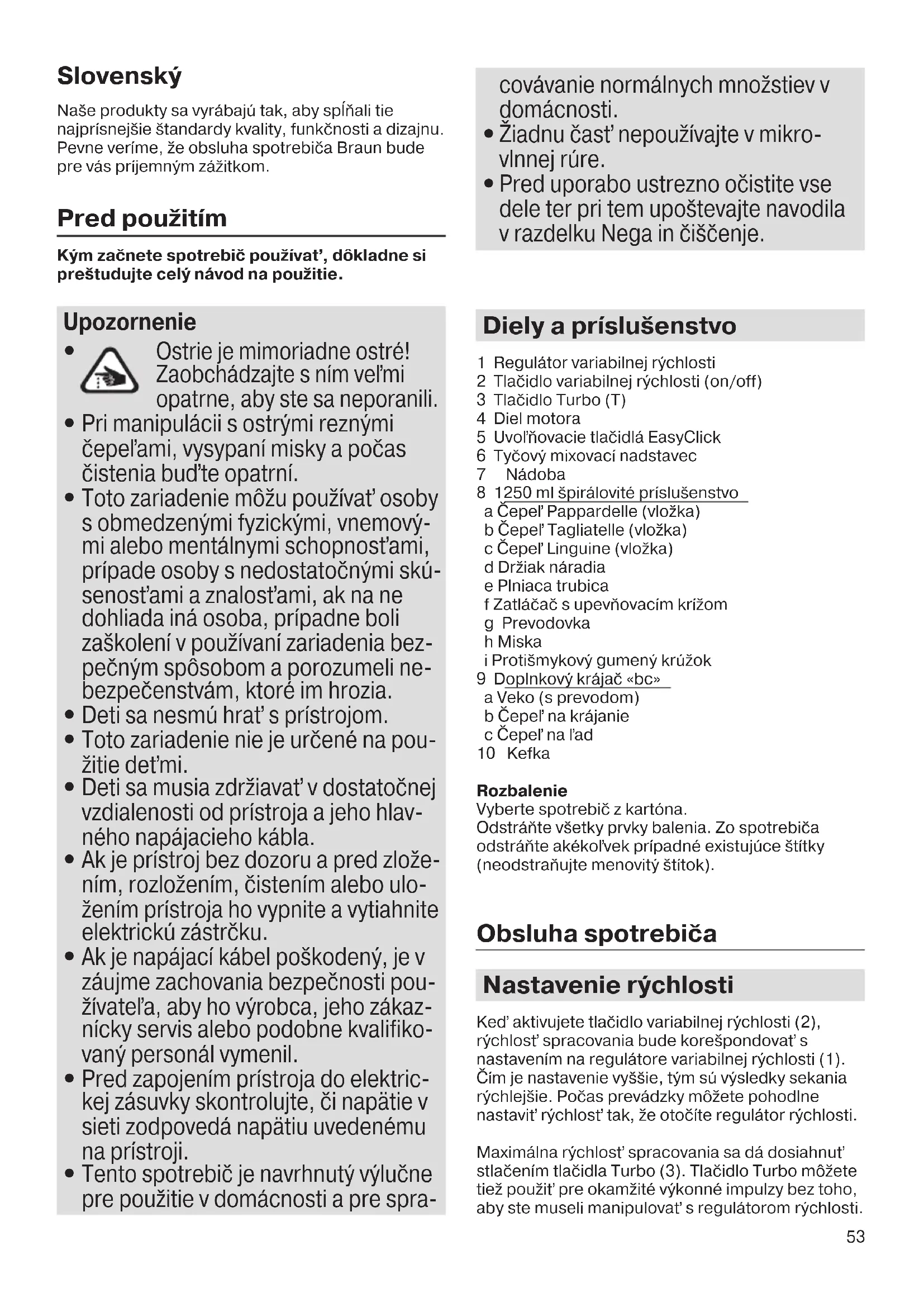 Pred uporabo ustrezno očistite vse dele ter pri tem upoštevajte navodila v razdelku Nega in čiščenje. Diely a príslušenstvo 1 Regulátor variabilnej rýchlosti 2 Tlačidlo variabilnej rýchlosti (on/off) 3 Tlačidlo Turbo (T) 4 Diel motora 5 Uvoľňovacie tlačidlá EasyClick 6 Tyčový mixovací nadstavec 7 Nádoba 8 1250 ml špirálovité príslušenstvo a Čepeľ Pappardelle (vložka) b Čepeľ Tagliatelle (vložka) c Čepeľ Linguine (vložka) d Držiak náradia e Plniaca trubica f Zatláčač s upevňovacím krížom g Prevodovka h Miska i Protišmykový gumený krúžok 9 Doplnkový krájač «bc» a Veko (s prevodom) b Čepeľ na krájanie c Čepeľ na ľad 10 Kefka Rozbalenie Vyberte spotrebič z kartóna. Odstráňte všetky prvky balenia. Zo spotrebiča odstráňte akékoľvek prípadné existujúce štítky (neodstraňujte menovitý štítok). Obsluha spotrebiča Nastavenie rýchlosti Keď aktivujete tlačidlo variabilnej rýchlosti (2), rýchlosť spracovania bude korešpondovať s nastavením na regulátore variabilnej rýchlosti (1). Čím je nastavenie vyššie, tým sú výsledky sekania rýchlejšie. Počas prevádzky môžete pohodlne nastaviť rýchlosť tak, že otočíte regulátor rýchlosti. Maximálna rýchlosť spracovania sa dá dosiahnuť stlačením tlačidla Turbo (3). Tlačidlo Turbo môžete tiež použiť pre okamžité výkonné impulzy bez toho, aby ste museli manipulovať s regulátorom rýchlosti. 5722113184_MQ_5060-5064_INT_S6-96.indd 53 24.05.18 14:2854 Hriadeľ mixéra (A) Ručný miešač je ideálny na prípravu dipov, omáčok, dresingov na šalát, polievok, jedál pre kojencov, ako aj nápojov, smoothie a mliečnych kokteilov. Na dosiahnutie optimálnych výsledkov použite maximálne otáčky. Montáž a obsluha