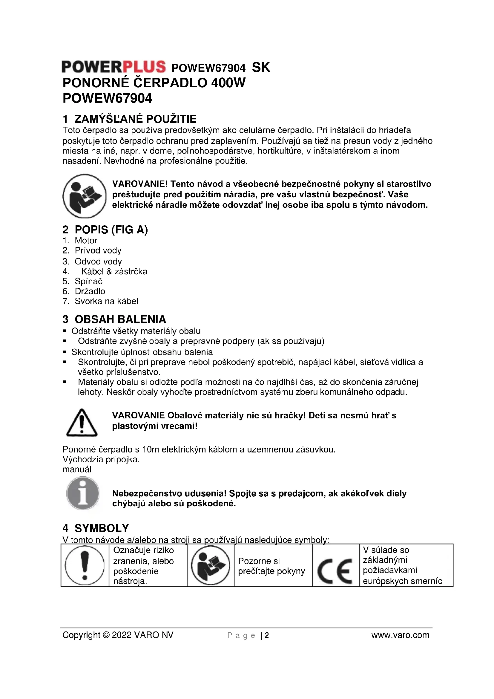 - v stacionárnej polohe s pružným hadicovým vedením. Pozor! Čerpadlo by ste nikdy nemali inštalovať tak, že ho zavesíte z dodávacieho potrubia alebo napájacieho kábla bez opory. Ponorné motorové čerpadlo musí byť zavesené za špeciálne dodanú rukoväť alebo umiestnené na spodku hriadeľa. Na zabezpečenie správneho fungovania čerpadla musí byť spodok hriadeľa udržiavaný v čistom stave bez usadenín a nečistôt. Ak hladina vody príliš klesne, nečistoty na hriadeli sa rýchlo vysušia a zabránia spusteniu čerpadla. Preto je potrebné ponorné čerpadlo pravidelne kontrolovať (vykonať spúšťacie testy). Plavák sa nastavuje takým spôsobom, aby bolo čerpadlo možné okamžite spustiť. Poznámka! Hriadeľ čerpadla by mal mať minimálne rozmery 40 x 40 x 50 cm, aby sa mohol plavákový spínač voľne pohybovať.POWEW67904 SK Copyright © 2022 VARO NV P a g e | 4 www.varo.com Sieťový zdroj Vaše ponorné čerpadlo je vybavené nárazuvzdornou zástrčkou podľa predpisov. Čerpadlo je dimenzované na pripojenie k bezpečnostnej zásuvke 220/230 V- 50 Hz. Zabezpečte dostatočné zaistenie (min. 6 A) a výborný stav zásuvky. Zástrčku zapojte do zásuvky a čerpadlo je pripravené na prevádzku. Dôležitá poznámka! Ak sa sieťový kábel alebo zástrčka poškodí nejakou externou činnosťou, je zakázané kábel opravovať.