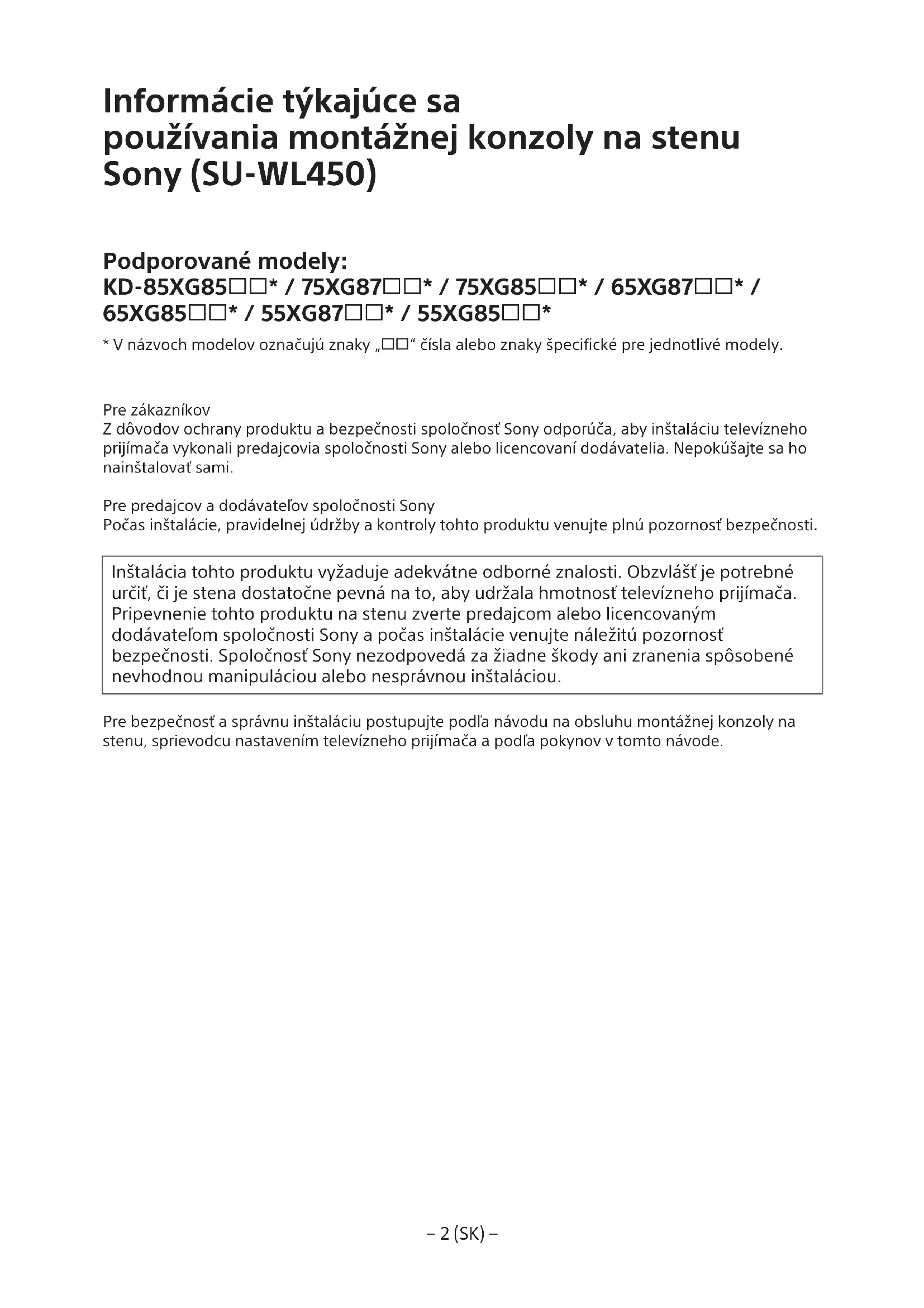 - V názvoch modelov označujú znaky „“ čísla alebo znaky špecifické pre jednotlivé modely. Pre zákazníkov Z dôvodov ochrany produktu a bezpečnosti spoločnosť Sony odporúča, aby inštaláciu televízneho prijímača vykonali predajcovia spoločnosti Sony alebo licencovaní dodávatelia. Nepokúšajte sa ho nainštalovať sami. Pre predajcov a dodávateľov spoločnosti Sony Počas inštalácie, pravidelnej údržby a kontroly tohto produktu venujte plnú pozornosť bezpečnosti. Inštalácia tohto produktu vyžaduje adekvátne odborné znalosti. Obzvlášť je potrebné určiť, či je stena dostatočne pevná na to, aby udržala hmotnosť televízneho prijímača. Pripevnenie tohto produktu na stenu zverte predajcom alebo licencovaným dodávateľom spoločnosti Sony a počas inštalácie venujte náležitú pozornosť bezpečnosti. Spoločnosť Sony nezodpovedá za žiadne škody ani zranenia spôsobené nevhodnou manipuláciou alebo nesprávnou inštaláciou. Pre bezpečnosť a správnu inštaláciu postupujte podľa návodu na obsluhu montážnej konzoly na stenu, sprievodcu nastavením televízneho prijímača a podľa pokynov v tomto návode.− 3 (SK) −