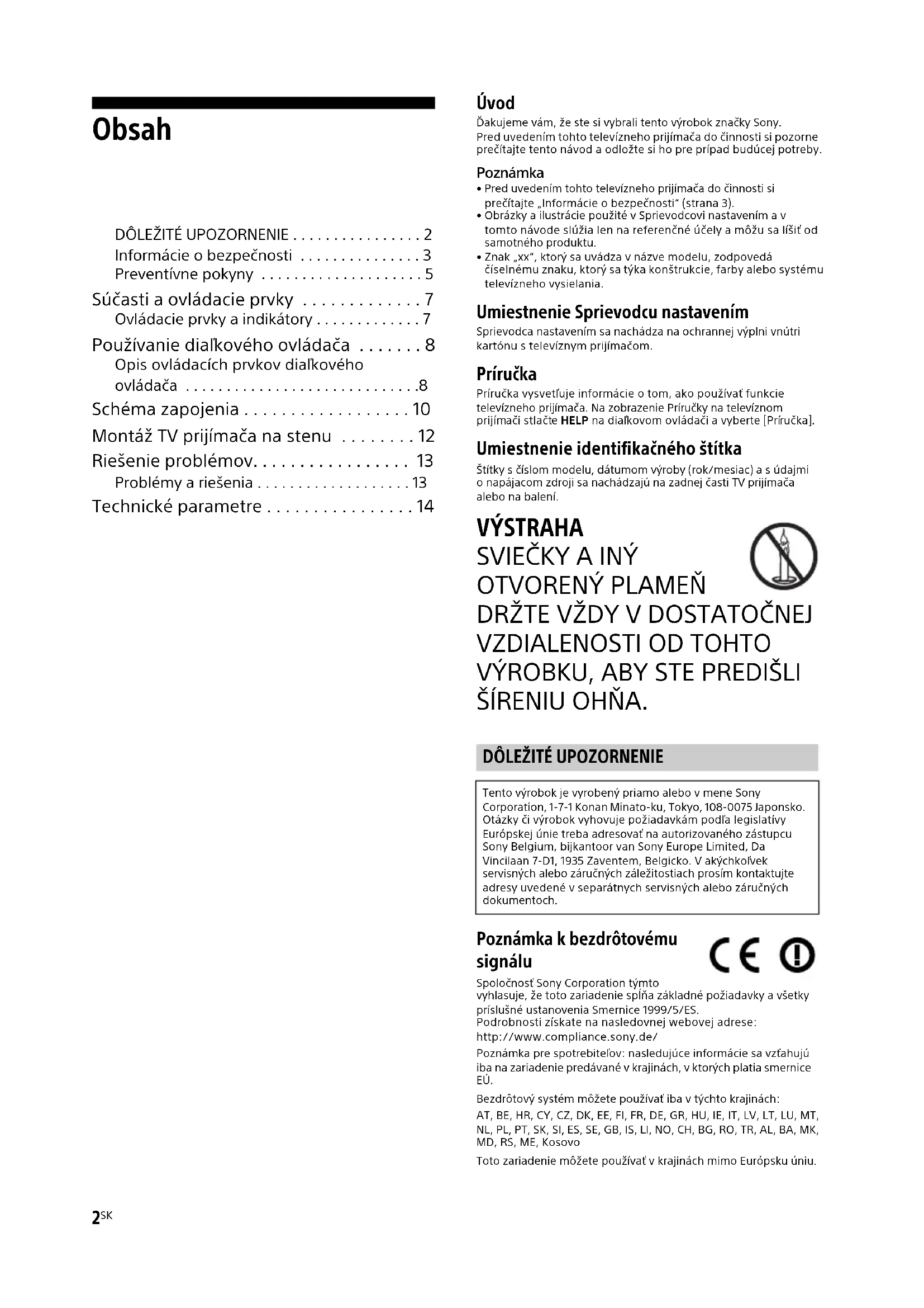 ŠÍRENIU OHŇA. Poznámka k bezdrôtovému signálu Spoločnosť Sony Corporation týmto vyhlasuje, že toto zariadenie spĺňa základné požiadavky a všetky príslušné ustanovenia Smernice 1999/5/ES.Podrobnosti získate na nasledovnej webovej adrese:http://www.compliance.sony.de/Poznámka pre spotrebiteľov: nasledujúce informácie sa vzťahujú iba na zariadenie predávané v krajinách, v ktorých platia smernice EÚ. Bezdrôtový systém môžete používať iba v týchto krajinách:AT, BE, HR, CY, CZ, DK, EE, FI, FR, DE, GR, HU, IE, IT, LV, LT, LU, MT, NL, PL, PT, SK, SI, ES, SE, GB, IS, LI, NO, CH, BG, RO, TR, AL, BA, MK, MD, RS, ME, KosovoToto zariadenie môžete používať v krajinách mimo Európsku úniu.