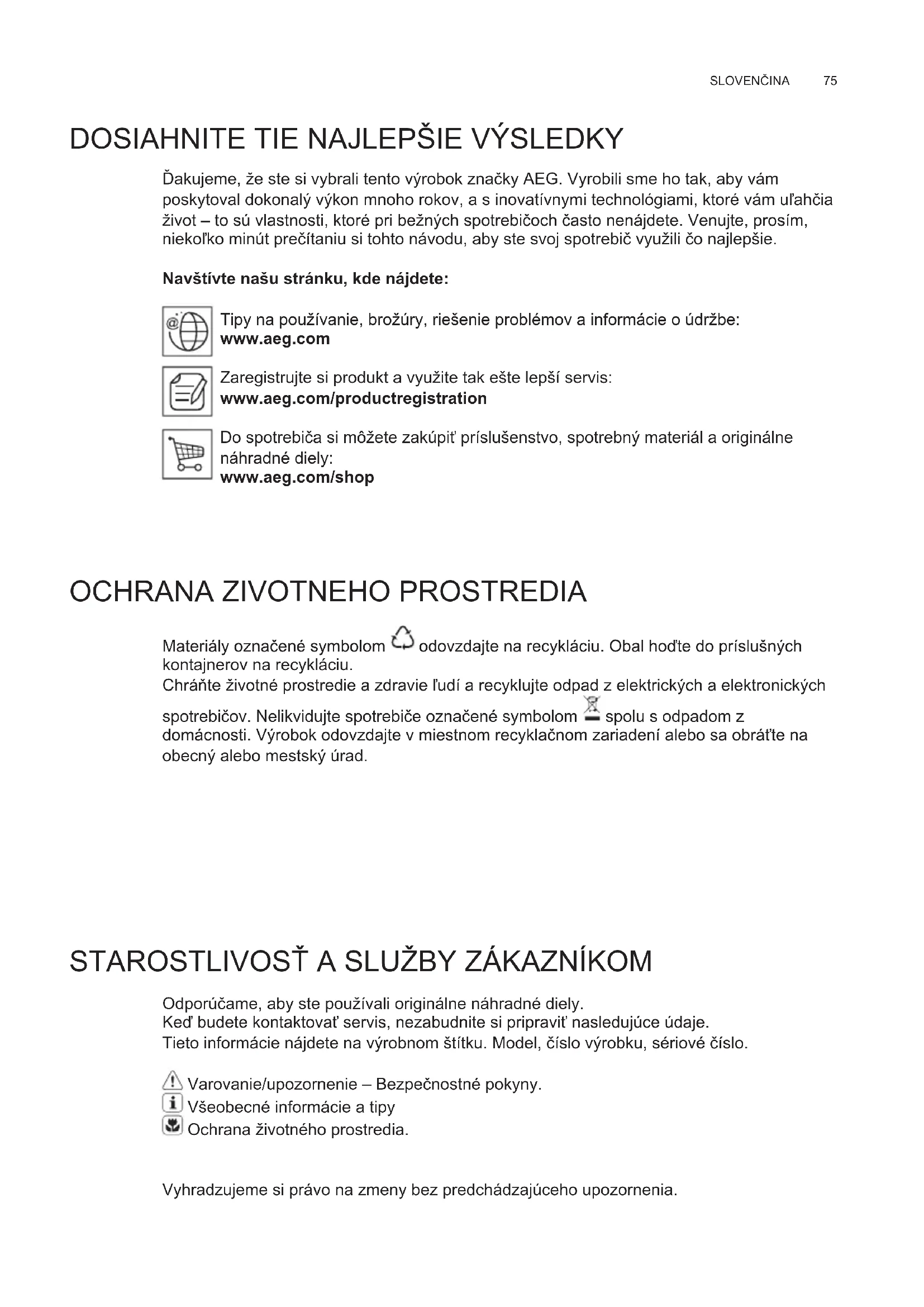 Materiály označené symbolom odovzdajte na recykláciu. Obal hoęte do príslušných kontajnerov na recykláciu. ChráĨte životné prostredie a zdravie ľudí a recyklujte odpad z elektrických a elektronických spotrebičov. Nelikvidujte spotrebiče označené symbolom spolu s odpadom z domácnosti. Výrobok odovzdajte v miestnom recyklačnom zariadení alebo sa obráĴte na obecný alebo mestský úrad. STAROSTLIVOSij A SLUŽBY ZÁKAZNÍKOM Odporúčame, aby ste používali originálne náhradné diely. Keę budete kontaktovaĴ servis, nezabudnite si pripraviĴ nasledujúce údaje. Tieto informácie nájdete na výrobnom štítku. Model, číslo výrobku, sériové číslo. Varovanie/upozornenie – Bezpečnostné pokyny. Všeobecné informácie a tipy Ochrana životného prostredia. Vyhradzujeme si právo na zmeny bez predchádzajúceho upozornenia.