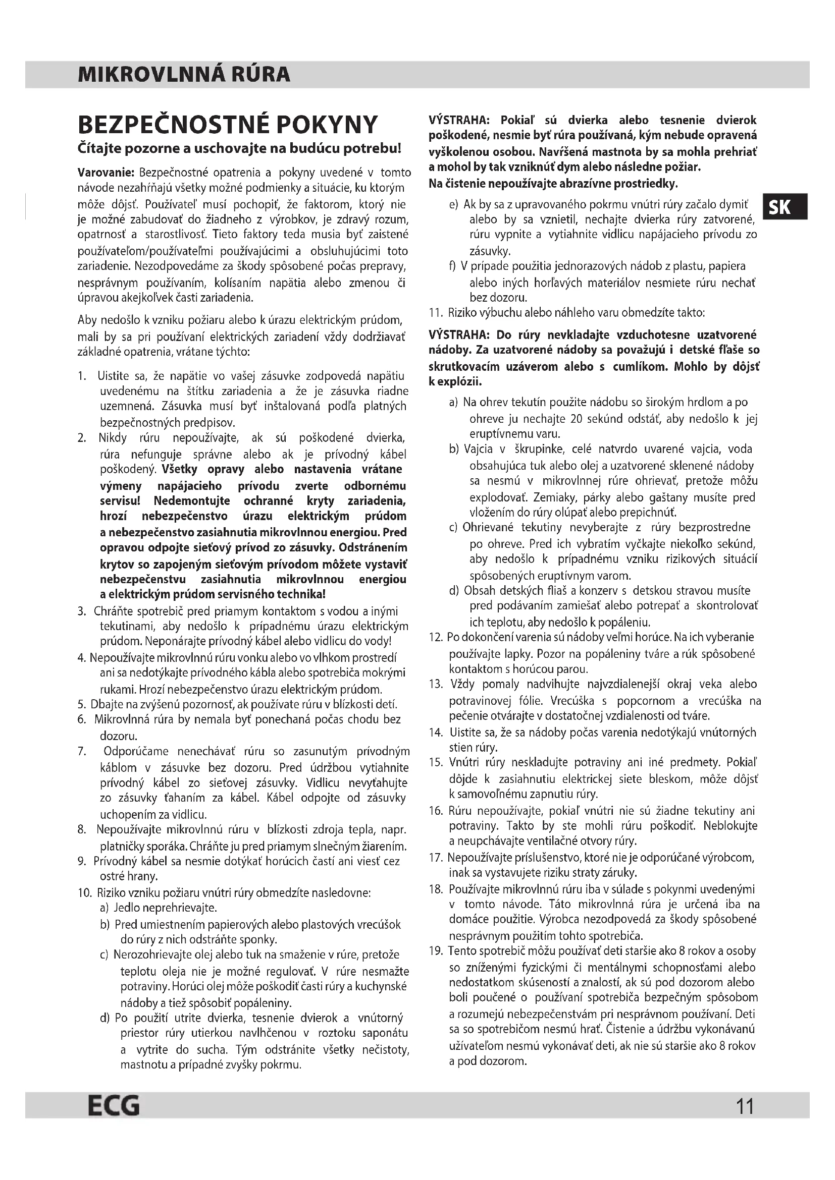 - Nikdy rúru nepoužívajte, ak sú poškodené dvierka, rúra nefunguje správne alebo ak je prívodný kábel poškodený. Všetky opravy alebo nastavenia vrátane výmeny napájacieho prívodu zverte odbornému servisul Nedemontujte ochranné kryty zariadenia, hrozí nebezpečenstvo úrazu elektrickým prúdom a nebezpečenstvo zasiahnutia mikrovlnnou energiou. Pred opravou odpojte sieťový prívod zo zásuvky. Odstránením krytov so zapojeným sieťovým prívodom môžete vystaviť nebezpečenstvu zasiahnutia mikrovlnnou energiou a elektrickým prúdom servisného technika!