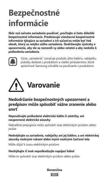 Bezpečnostné informácie Skôr než začnete zariadenie používať, prečítajte si tieto dôležité bezpečnostné informácie. Predstavujú všeobecné bezpečnostné informácie týkajúce sa zariadení a ich súčasťou môže byť tiež obsah, ktorý sa netýka vášho zariadenia. Dodržiavajte výstrahy a upozornenia, aby ste sa nezranili vy alebo ostatní a aby nedošlo k poškodeniu zariadenia. Výraz „zariadenie“ označuje produkt, jeho batériu, nabíjačku, položky dodané s produktom a všetko príslušenstvo, ktoré spoločnosť Samsung schválila na používanie s produktom. Varovanie Nedodržanie bezpečnostných upozornení a predpisov môže spôsobiť vážne zranenie alebo smrť Nepoužívajte poškodené elektrické káble či zástrčky, ani neupevnené elektrické zásuvky Nekvalitné prepojenia môžu spôsobiť úraz elektrickým prúdom alebo požiar. Nedotýkajte sa zariadenia, nabíjačky ani jej káblov, a ani elektrickej zásuvky mokrými rukami alebo inými mokrými časťami tela Môže dôjsť k úrazu elektrickým prúdom. Neohýbajte či inak nepoškodzujte napájací kábel Môže to spôsobiť úraz elektrickým prúdom alebo požiar. Slovenčina