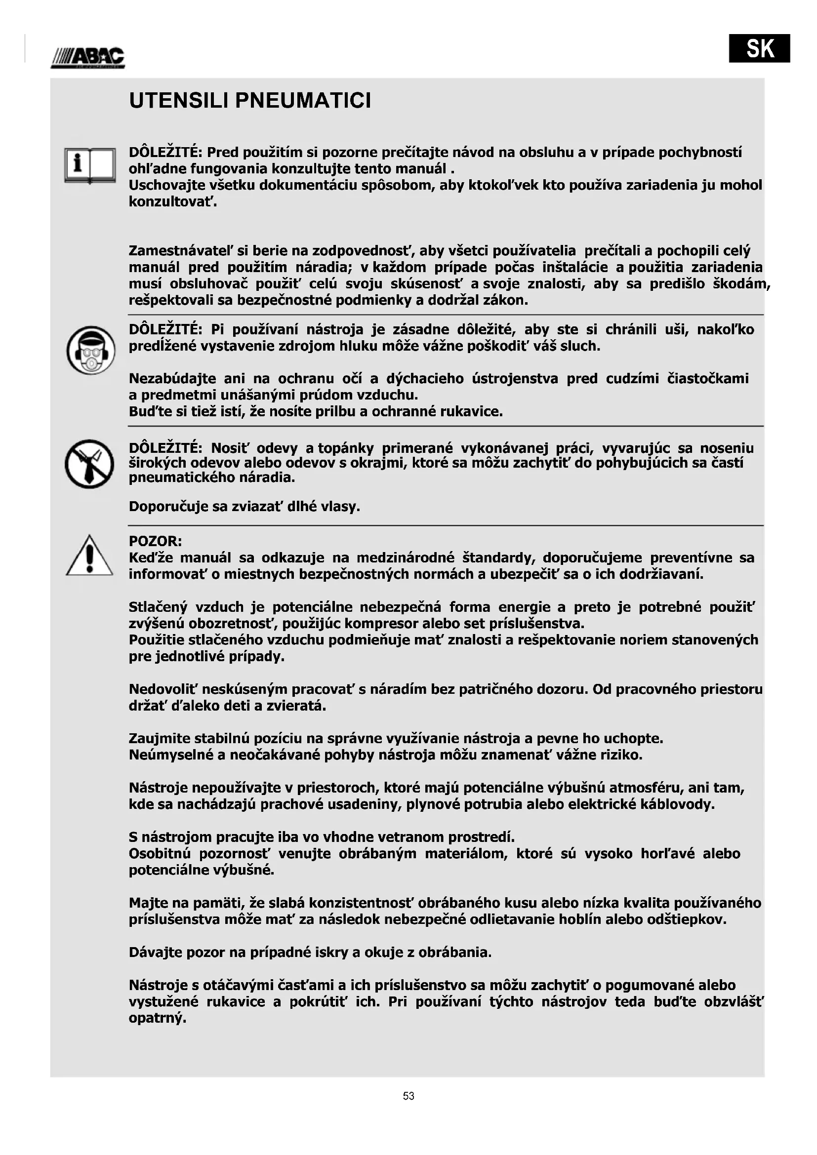 UTENSILI PNEUMATICI DÔLEŽITÉ: Pred použitím si pozorne prečítajte návod na obsluhu a v prípade pochybností ohľadne fungovania konzultujte tento manuál . Uschovajte všetku dokumentáciu spôsobom, aby ktokoľvek kto používa zariadenia ju mohol konzultovať. Zamestnávateľ si berie na zodpovednosť, aby všetci používatelia prečítali a pochopili celý manuál pred použitím náradia; v každom prípade počas inštalácie a použitia zariadenia musí obsluhovač použiť celú svoju skúsenosť a svoje znalosti, aby sa predišlo škodám, rešpektovali sa bezpečnostné podmienky a dodržal zákon. DÔLEŽITÉ: Pi používaní nástroja je zásadne dôležité, aby ste si chránili uši, nakoľko predĺžené vystavenie zdrojom hluku môže vážne poškodiť váš sluch. Nezabúdajte ani na ochranu očí a dýchacieho ústrojenstva pred cudzími čiastočkami a predmetmi unášanými prúdom vzduchu. Buďte si tiež istí, že nosíte prilbu a ochranné rukavice. DÔLEŽITÉ: Nosiť odevy a topánky primerané vykonávanej práci, vyvarujúc sa noseniu širokých odevov alebo odevov s okrajmi, ktoré sa môžu zachytiť do pohybujúcich sa častí pneumatického náradia. Doporučuje sa zviazať dlhé vlasy. POZOR: Keďže manuál sa odkazuje na medzinárodné štandardy, doporučujeme preventívne sa informovať o miestnych bezpečnostných normách a ubezpečiť sa o ich dodržiavaní. Stlačený vzduch je potenciálne nebezpečná forma energie a preto je potrebné použiť zvýšenú obozretnosť, použijúc kompresor alebo set príslušenstva. Použitie stlačeného vzduchu podmieňuje mať znalosti a rešpektovanie noriem stanovených pre jednotlivé prípady. Nedovoliť neskúseným pracovať s náradím bez patričného dozoru. Od pracovného priestoru držať ďaleko deti a zvieratá. Zaujmite stabilnú pozíciu na správne využívanie nástroja a pevne ho uchopte. Neúmyselné a neočakávané pohyby nástroja môžu znamenať vážne riziko. Nástroje nepoužívajte v priestoroch, ktoré majú potenciálne výbušnú atmosféru, ani tam, kde sa nachádzajú prachové usadeniny, plynové potrubia alebo elektrické káblovody. S nástrojom pracujte iba vo vhodne vetranom prostredí. Osobitnú pozornosť venujte obrábaným materiálom, ktoré sú vysoko horľavé alebo potenciálne výbušné. Majte na pamäti, že slabá konzistentnosť obrábaného kusu alebo nízka kvalita používaného príslušenstva môže mať za následok nebezpečné odlietavanie hoblín alebo odštiepkov. Dávajte pozor na prípadné iskry a okuje z obrábania. Nástroje s otáčavými časťami a ich príslušenstvo sa môžu zachytiť o pogumované alebo vystužené rukavice a pokrútiť ich. Pri používaní týchto nástrojov teda buďte obzvlášť opatrný.54