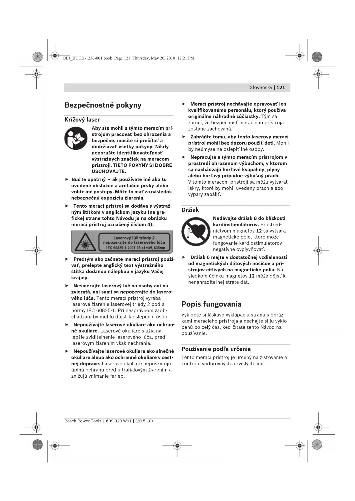 Bezpečnostné pokyny Krížový laser Aby ste mohli s týmto meracím prí- strojom pracovať bez ohrozenia a bezpečne, musíte si prečítať a dodržiavať všetky pokyny. Nikdy neporušte identifikovateľnosť výstražných značiek na meracom prístroji. TIETO POKYNY SI DOBRE USCHOVAJTE. f Buďte opatrný – ak používate iné ako tu uvedené obslužné a aretačné prvky alebo volíte iné postupy. Môže to mať za následok nebezpečnú expozíciu žiarenia. f Tento merací prístroj sa dodáva s výstraž- ným štítkom v anglickom jazyku (na gra- fickej strane tohto Návodu je na obrázku merací prístroj označený číslom 4). f Predtým ako začnete merací prístroj použí- vať, prelepte anglický text výstražného štítka dodanou nálepkou v jazyku Vašej krajiny. f Nesmerujte laserový lúč na osoby ani na zvieratá, ani sami sa nepozerajte do lasero- vého lúča. Tento merací prístroj vyrába laserové žiarenie laserovej triedy 2 podľa normy IEC 60825-1. Pri nesprávnom zaob- chádzaní by mohlo dôjsť k oslepeniu osôb. f Nepoužívajte laserové okuliare ako ochran- né okuliare. Laserové okuliare slúžia na lepšie zviditelnenie laserového lúča, pred laserovým žiarením však nechránia. f Nepoužívajte laserové okuliare ako slnečné okuliare alebo ako ochranné okuliare v cest- nej doprave. Laserové okuliare neposkytujú úplnú ochranu pred ultrafialovým žiarením a znižujú vnímanie farieb. f Merací prístroj nechávajte opravovať len kvalifikovanému personálu, ktorý používa originálne náhradné súčiastky. Tým sa zaručí, že bezpečnosť meracieho prístroja zostane zachovaná. f Zabráňte tomu, aby tento laserový merací prístroj mohli bez dozoru použiť deti. Mohli by neúmyselne oslepiť iné osoby. f Nepracujte s týmto meracím prístrojom v prostredí ohrozenom výbuchom, v ktorom sa nachádzajú horľavé kvapaliny, plyny alebo horľavý prípadne výbušný prach. V tomto meracom prístroji sa môžu vytvárať iskry, ktoré by mohli uvedený prach alebo výpary zapáliť. Držiak Nedávajte držiak 8 do blízkosti kardiostimulátorov. Prostred- níctvom magnetov 12 sa vytvára magnetické pole, ktoré môže fungovanie kardiostimulátorov negatívne ovplyvňovať. f Držiak 8 majte v dostatočnej vzdialenosti od magnetických dátových nosičov a prí- strojov citlivých na magnetické polia. Ná- sledkom účinku magnetov 12 môže dôjsť k nenahraditeľnej strate dát. Popis fungovania Vyklopte si láskavo vyklápaciu stranu s obráz- kami meracieho prístroja a nechajte si ju vyklo- penú po celý čas, keď čítate tento Návod na používanie. Používanie podľa určenia Tento merací prístroj je určený na zisťovanie a kontrolu vodorovných a zvislých línií. OBJ_BUCH-1236-001.book Page 121 Thursday, May 20, 2010 12:21 PM122 | Slovensky 1 609 929 W91 | (20.5.10) Bosch Power Tools Technické údaje Vyobrazené komponenty Číslovanie jednotlivých zobrazených komponen- tov sa vzťahuje na vyobrazenie meracieho prí- stroja na grafickej strane tohto Návodu na používanie. 1 Výstupný otvor laserového lúča 2 Statívové uchytenie 1/4" 3 Vypínač 4 Výstražný štítok laserového prístroja 5 Sériové číslo 6 Aretácia veka priehradky na batérie 7 Viečko priehradky na batérie 8 Držiak 9 Aretačná skrutka držiaka 10 Otvory držiaka na skrutky 11 Vedenie remeňa 12 Magnety 13 Statívové uchytenie 1/4" na držiaku 14 Statívové uchytenie 5/8" na držiaku 15 Ochranná taška 16 Okuliare na zviditeľnenie laserového lúča* 17 Meracia platnička s pätkou* 18 Statív*